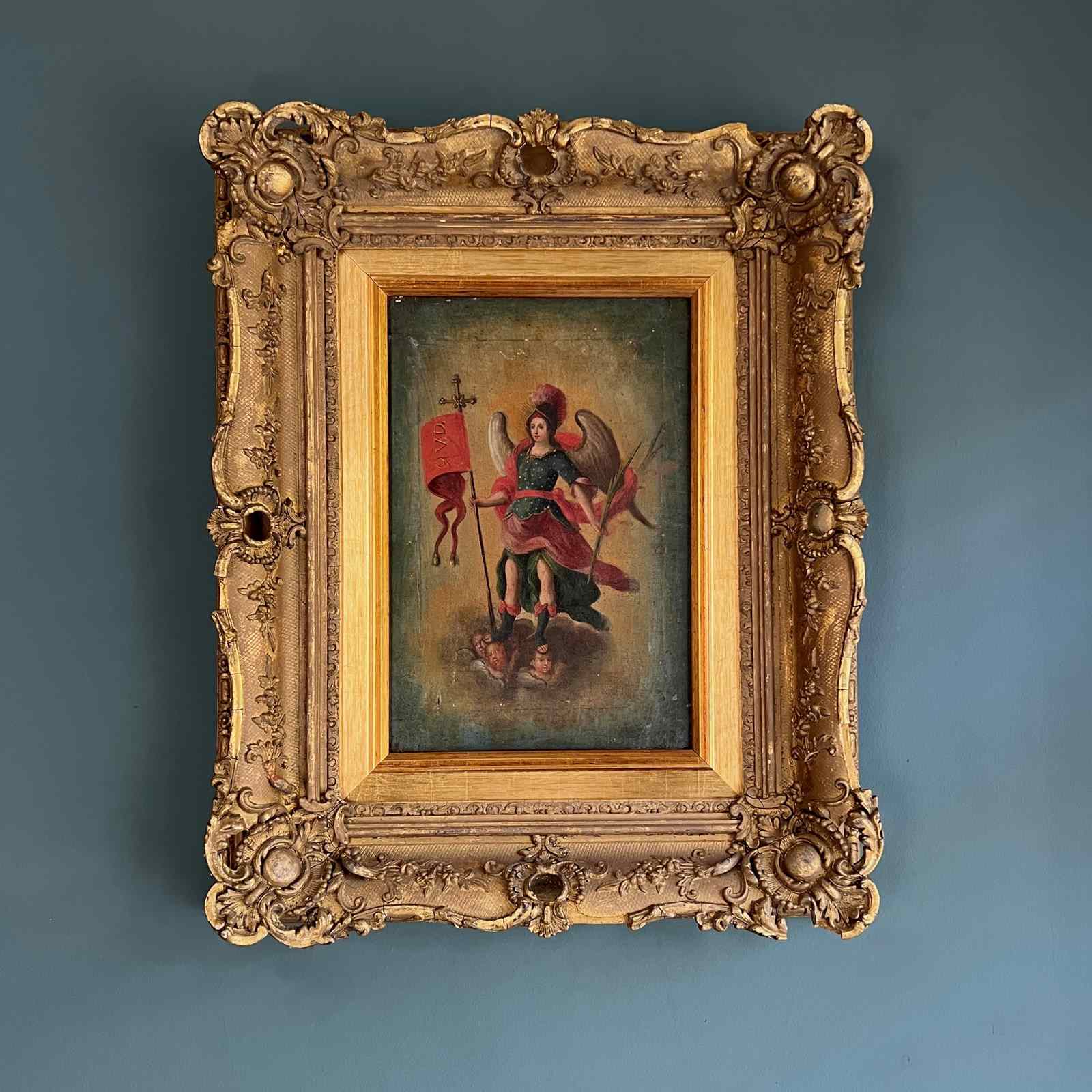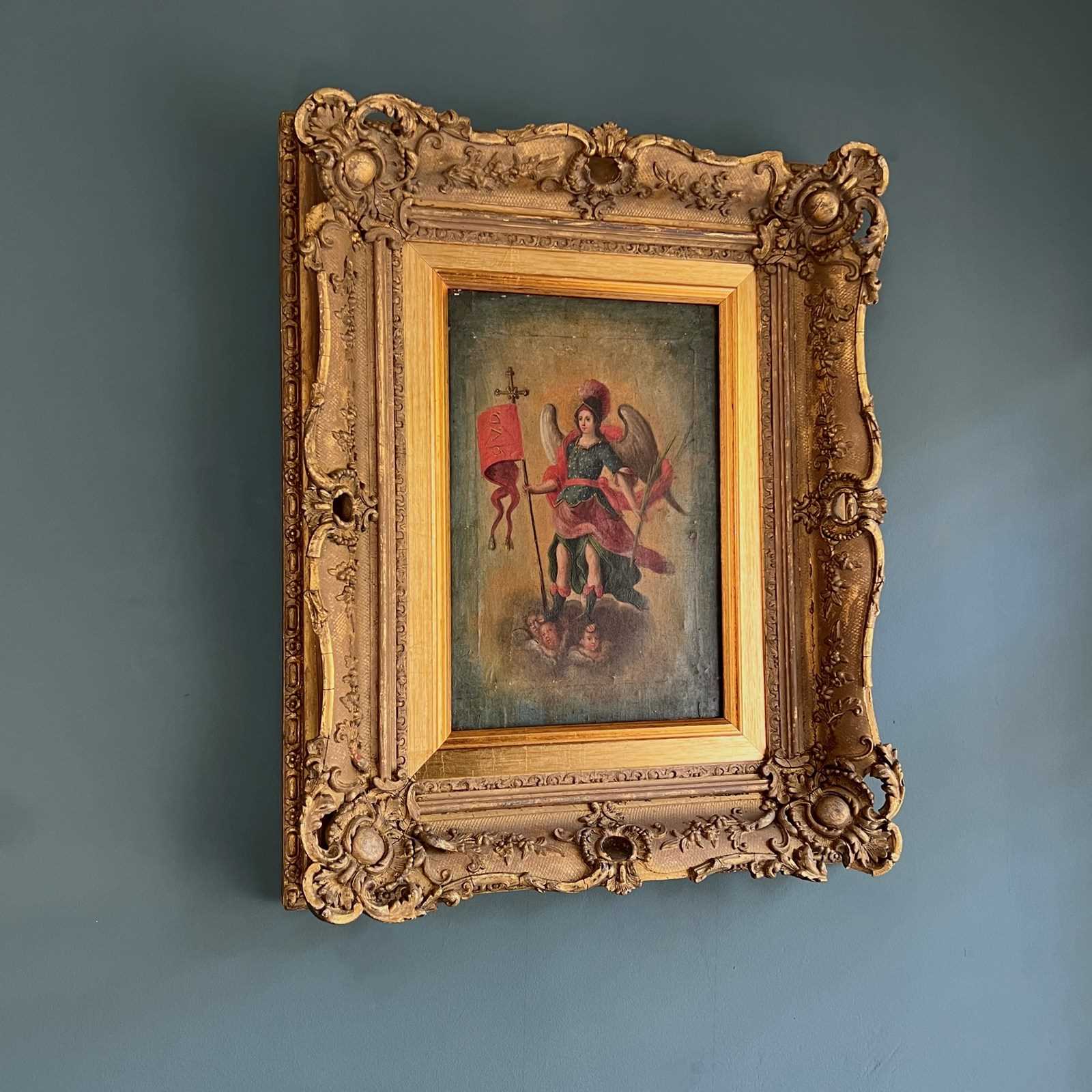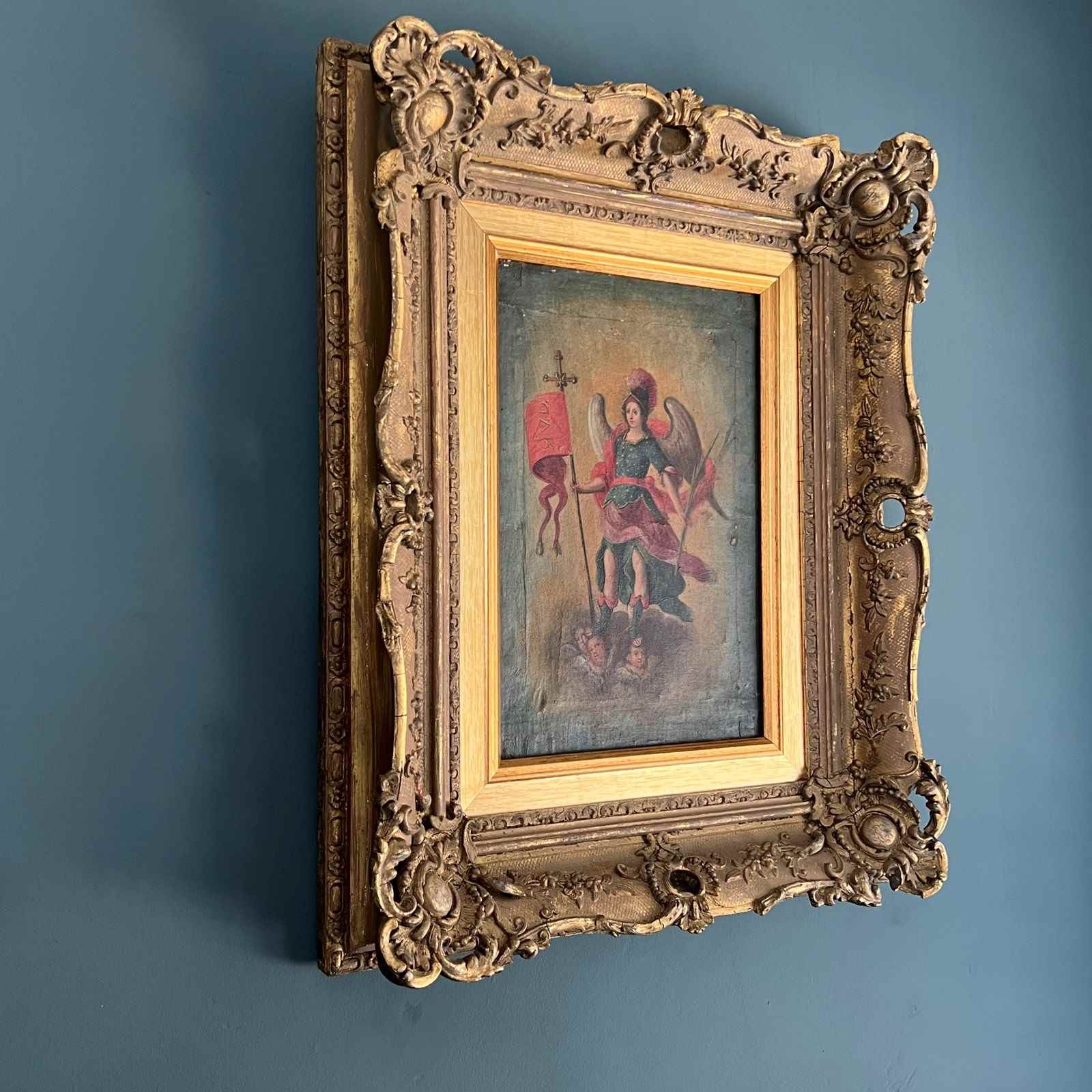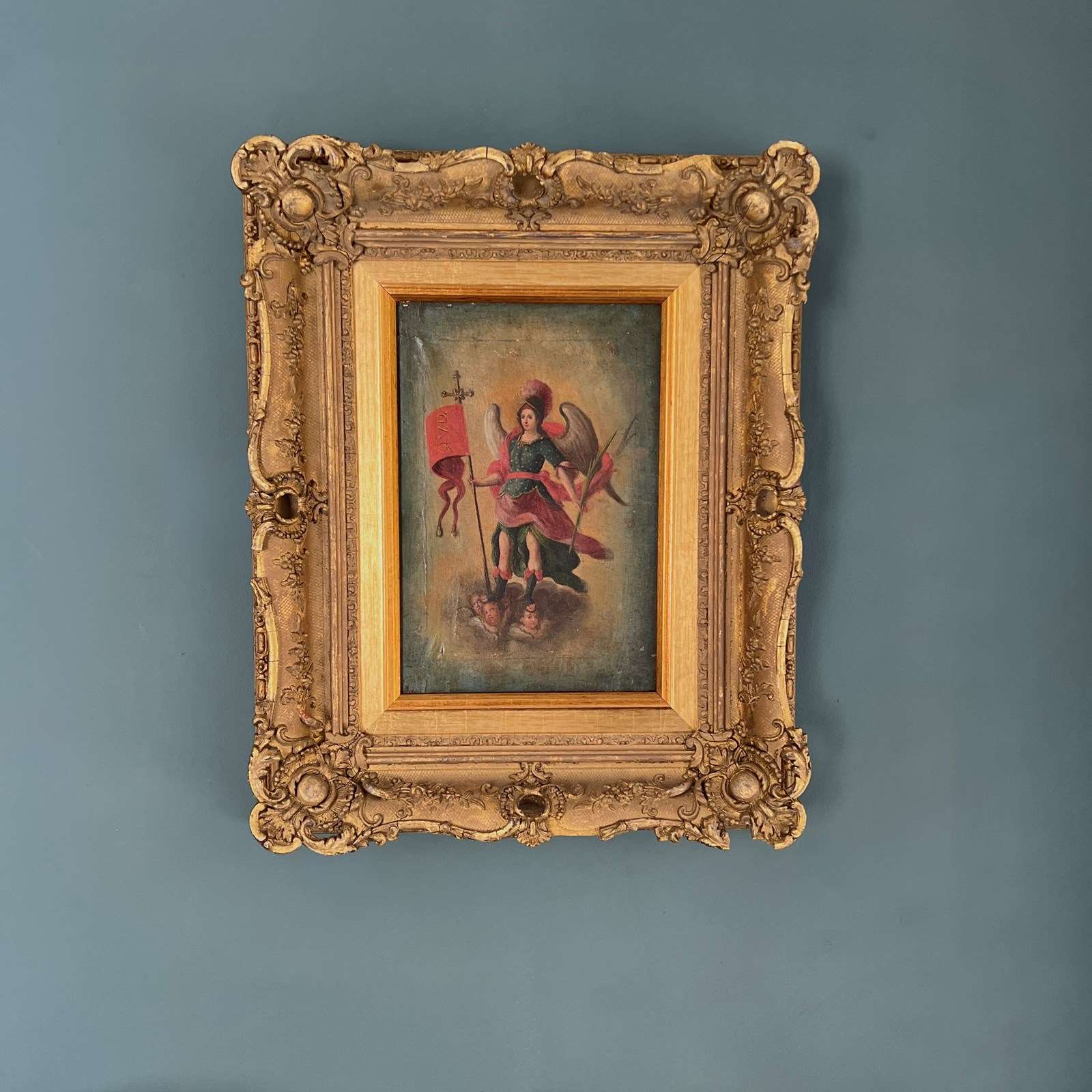 Antique C18th Oil Painting Of Archangel Michael In Gilt Frame
