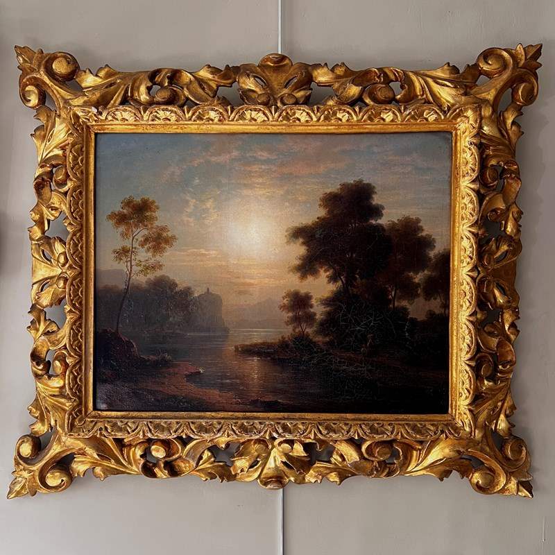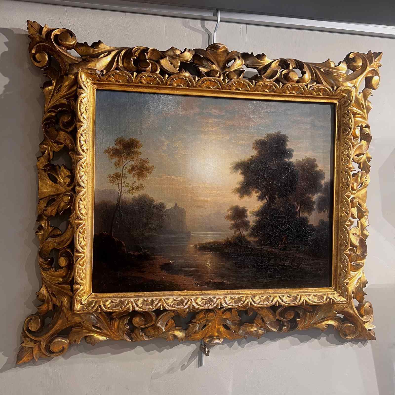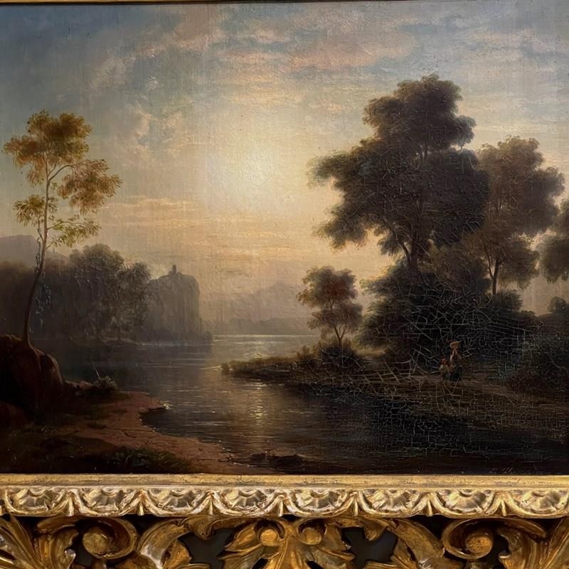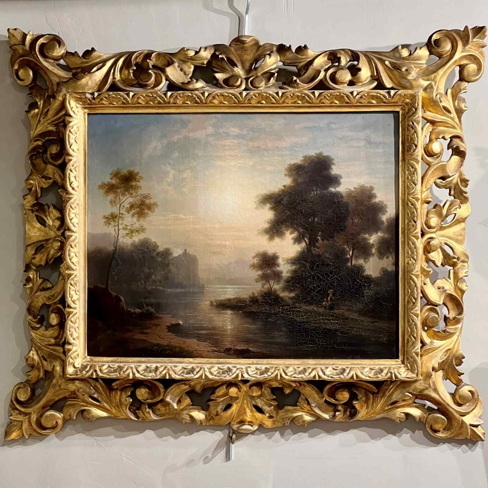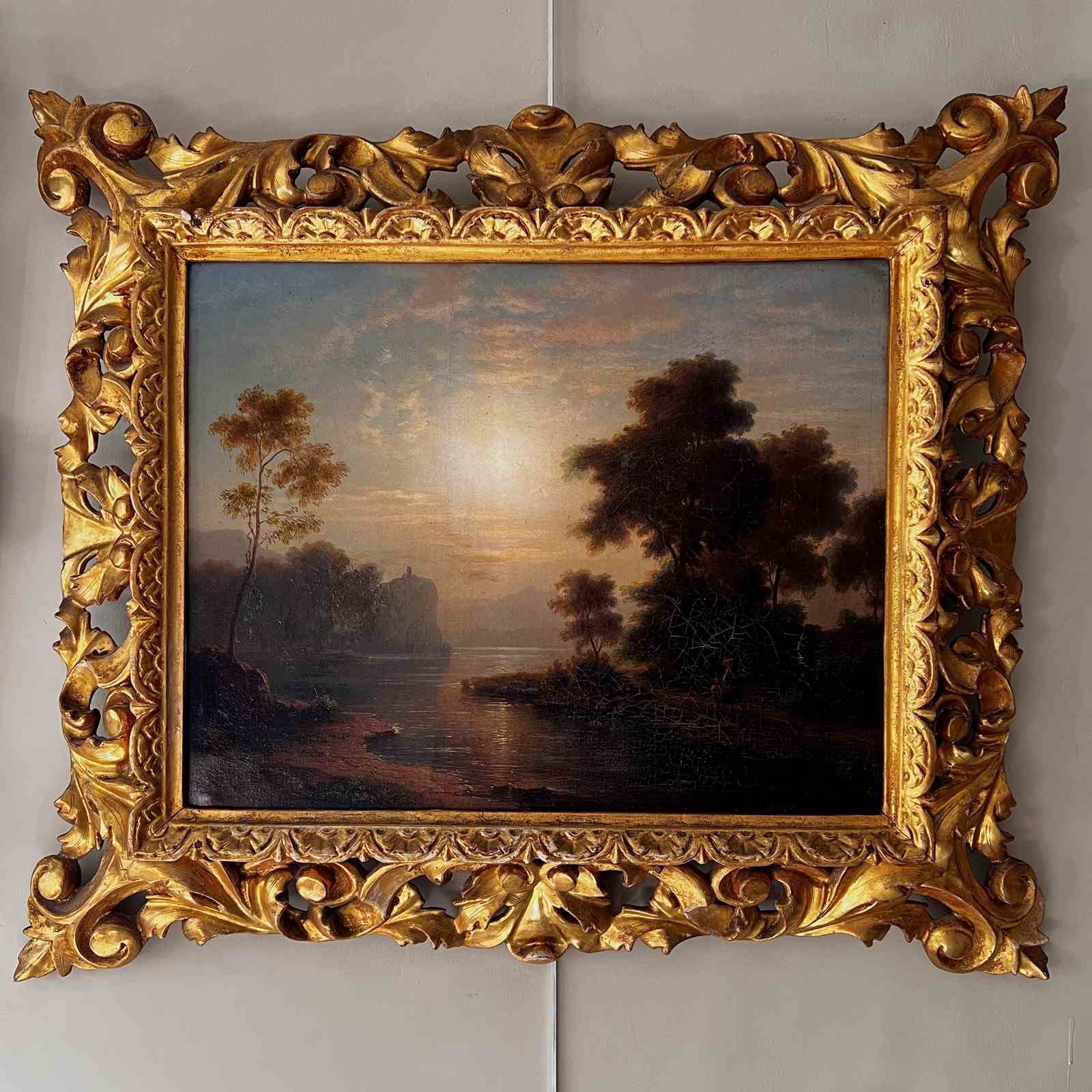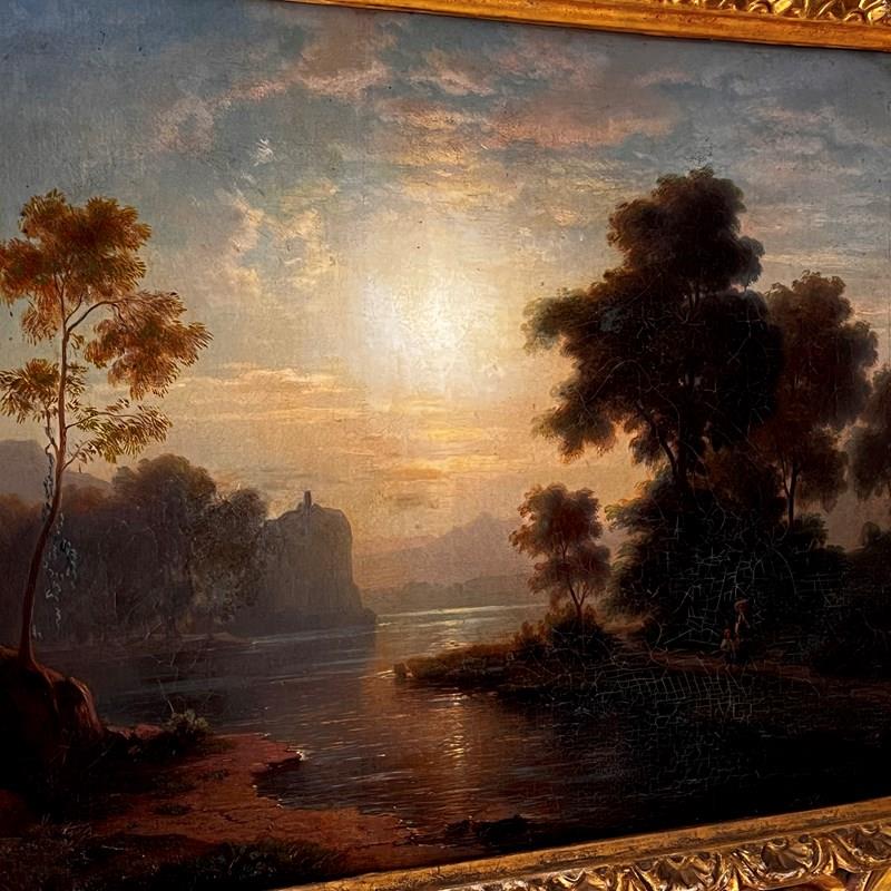 A beautifully executed oil on canvas capturing a tranquil sunset along a riverbank. A mother and child pause in the foreground, while a distant building crowns a cliff, lending a sense of narrative and depth.