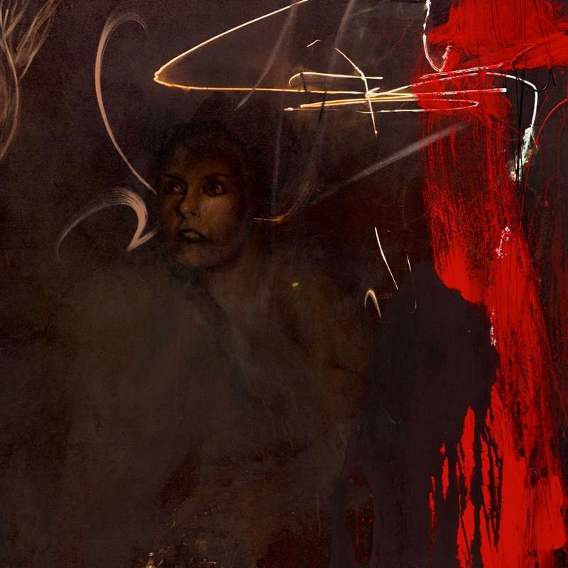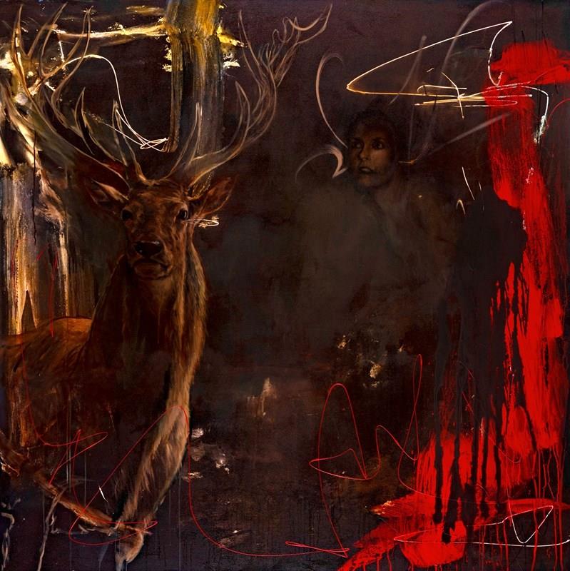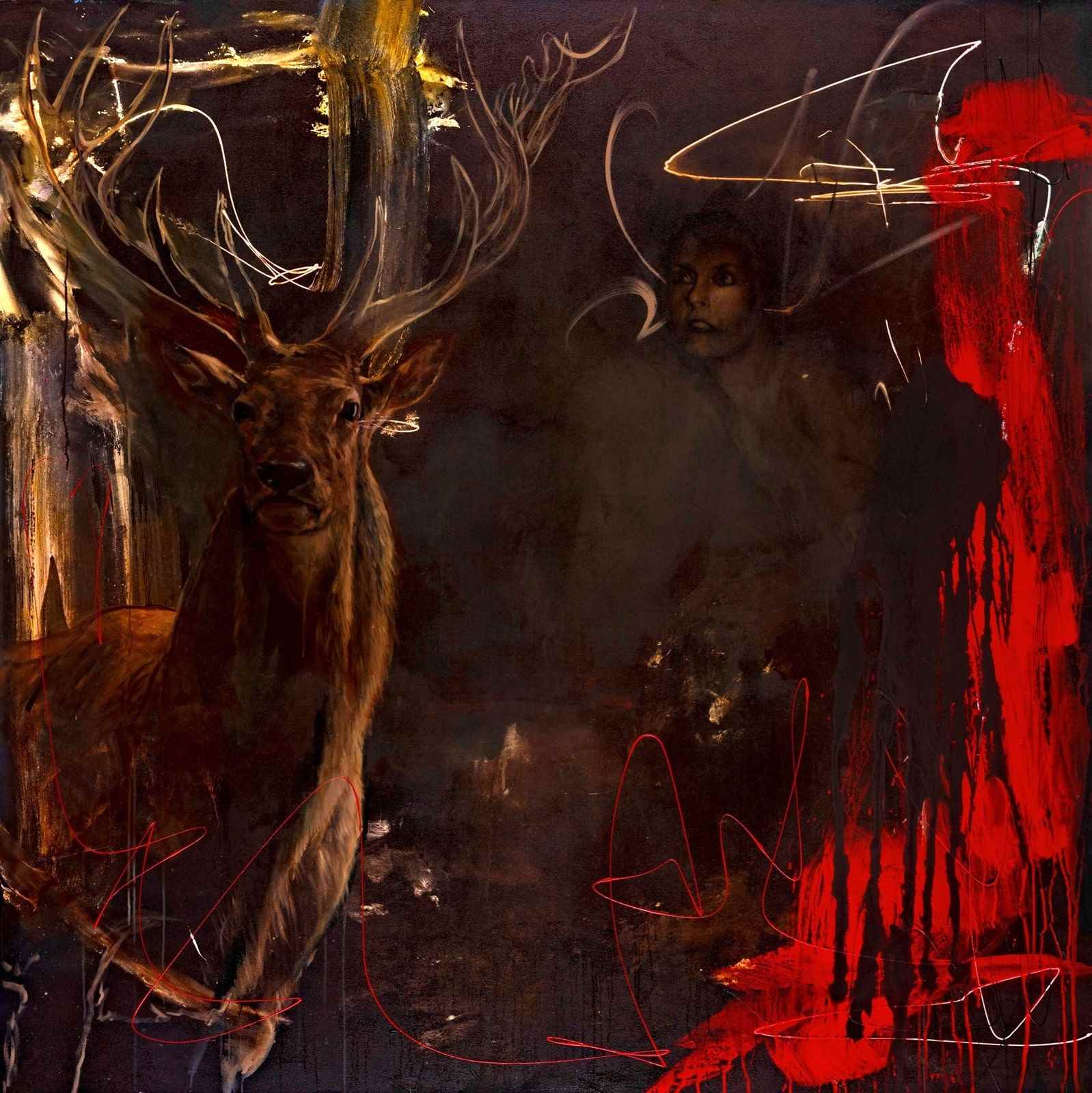 A monumental 183 × 183 cm oil and acrylic on canvas by Alan Rankle in collaboration with Kirsten Reynolds.