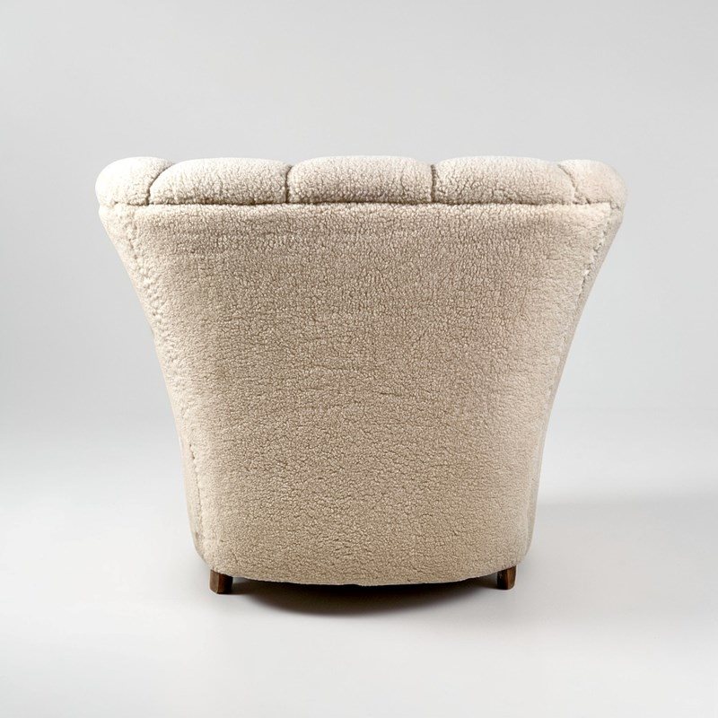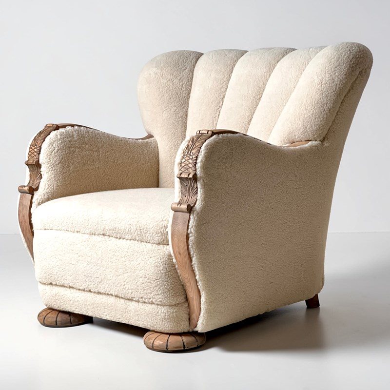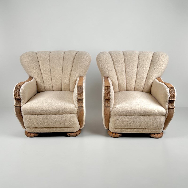 Pair Of Danish Art Deco Scallop Back Armchairs, Upholstered In Sherpa Wool