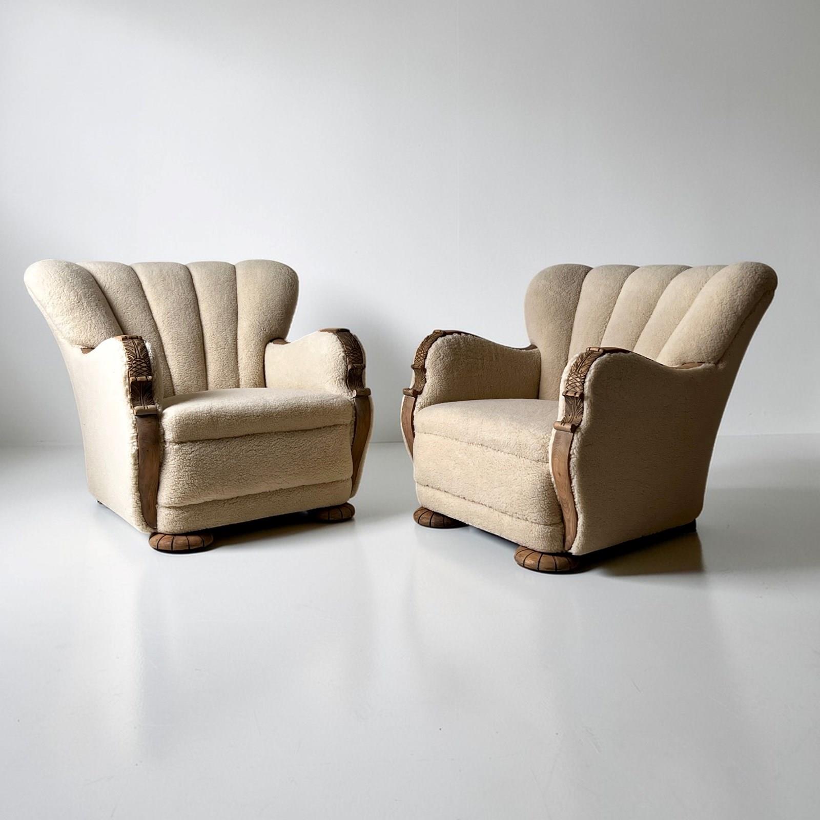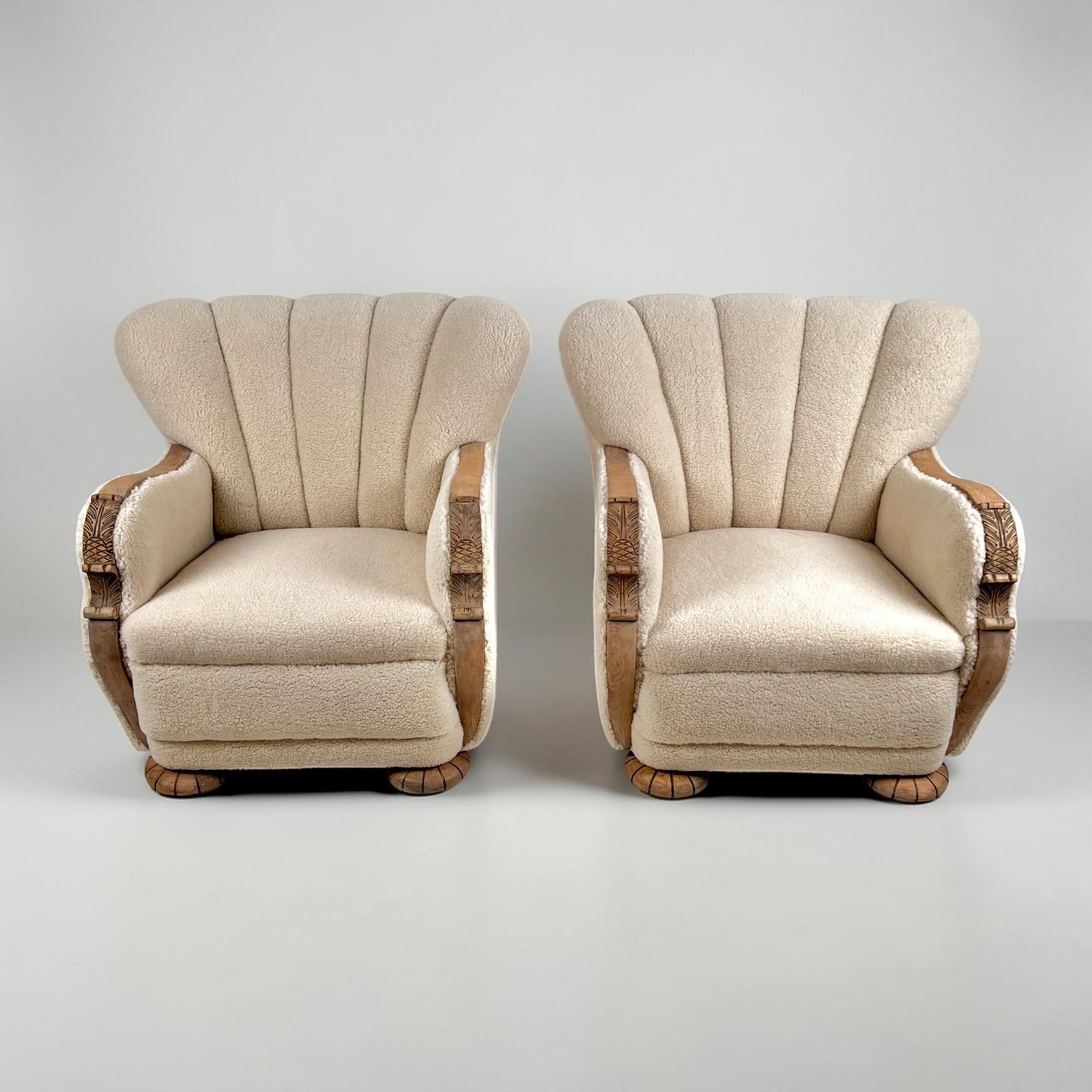 A rare pair of Danish Art Deco armchairs of generous proportions, retaining their original scallop-form backs and sculptural show wood frames.