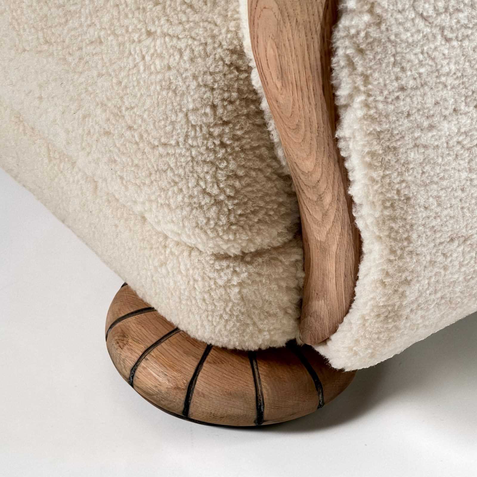 The chairs have been professionally reupholstered in 100% Italian virgin Sherpa wool, offering a refined texture and exceptional comfort. The wide seats are gently inclined, providing supportive and relaxed seating.