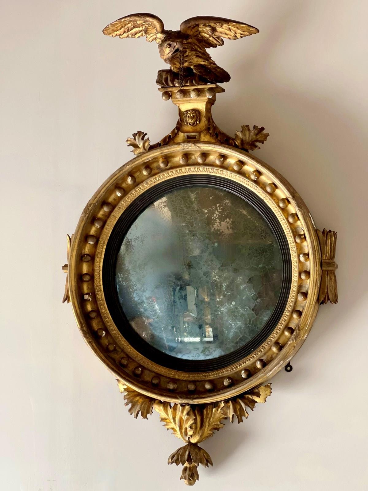 A Fine Example of a Regency Carved Giltwood and Gesso Convex Wall Mirror. Rare to find one of this quality in its original unrestored condition. The pediment surmounted with a finely carved eagle with lions mask below. Flanked by finely carved leaf decoration. The original mercury convex mirror circled with a reeded ebony slip. The lower section again having the most finely carved acanthus leaf detail. In good condition with wear commensurate to age. The mirror plate is beautifully foxed but useable and still reflects. The rear has two old trade labels, one for a Lewes removals company from the 1960's and what was probably the makers trade label. One of the nicest we have ever had and will make a perfect addition to your home or hospitality space.
