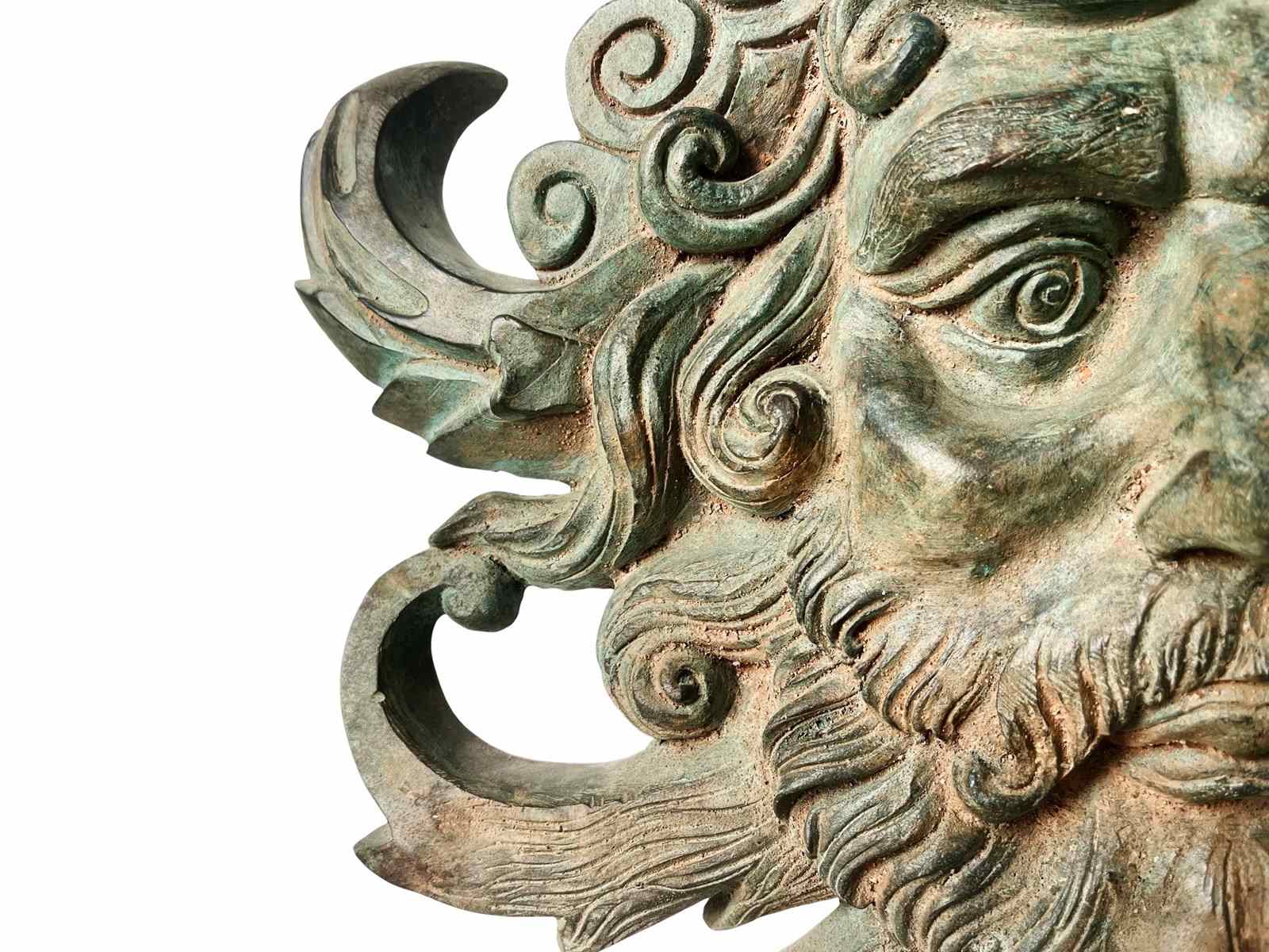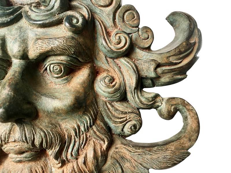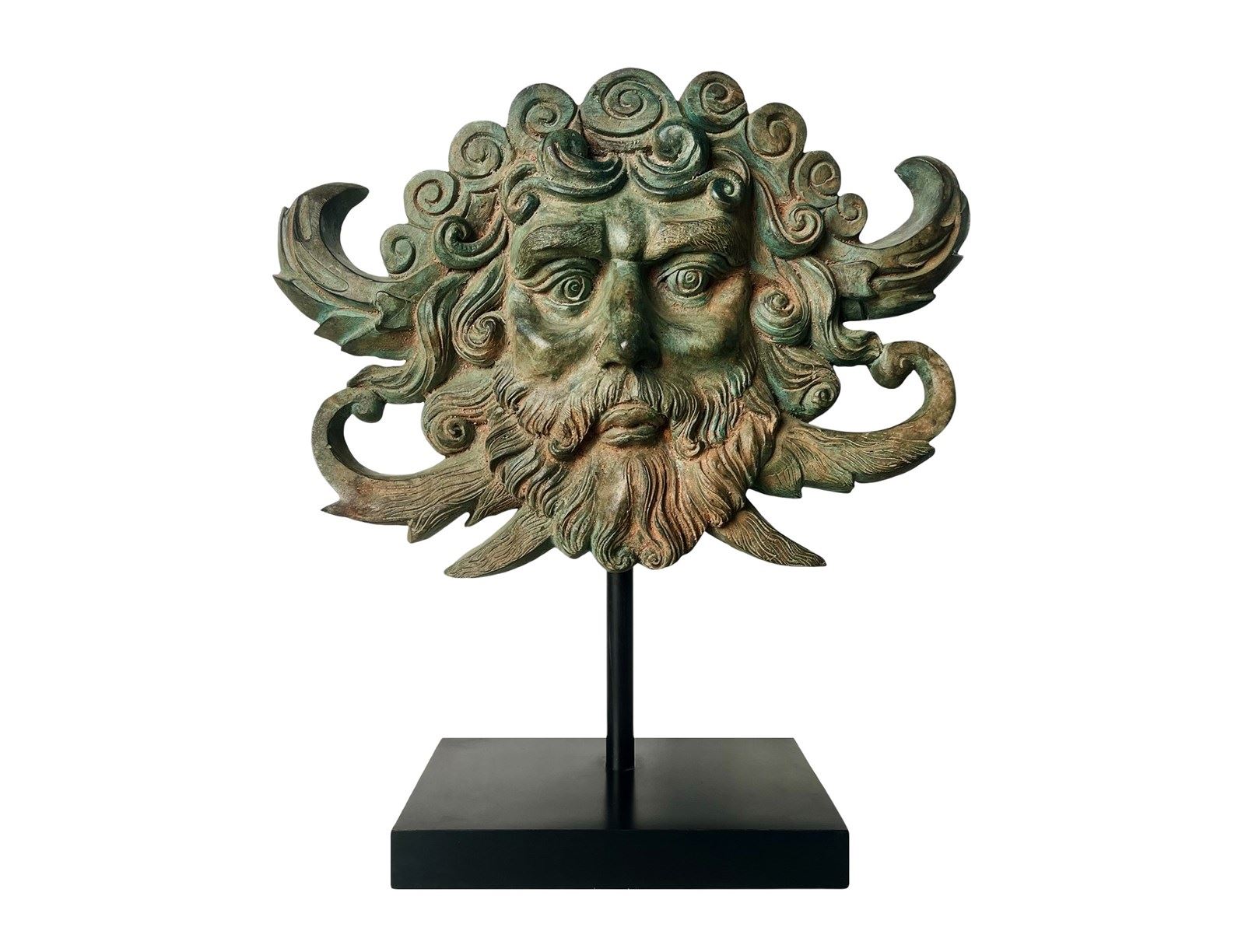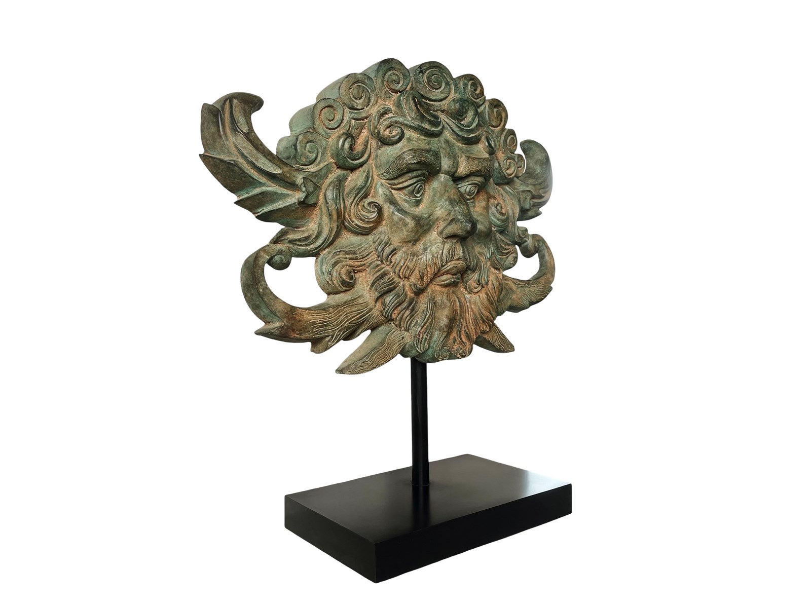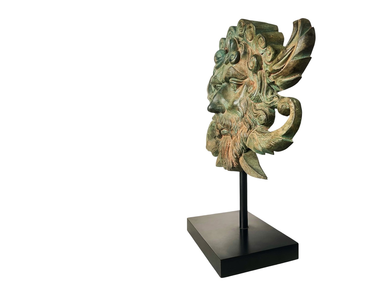 This is an exceptional antique French bronze sculpture depicting the head of Neptune, the Roman god of the sea. He is the counterpart to the Greek god Poseidon. As a major deity, he is often portrait as a powerful and handsome bearded man, which has been a source of the artistic inspiration for centuries. This magnificent Neptune is made from bronze with an outstanding patina in the shades of green. Created with fine artistic quality and mounted on a metal stand for a great display it measures about 48.5 x 46.5 x 16.5 cm or approximately 19 x 18.3 x 5.5 inches [including the stand]. In great condition and exactly as I discovered it recently in Avignon in the South of France. For the full condition please refer to the images!
