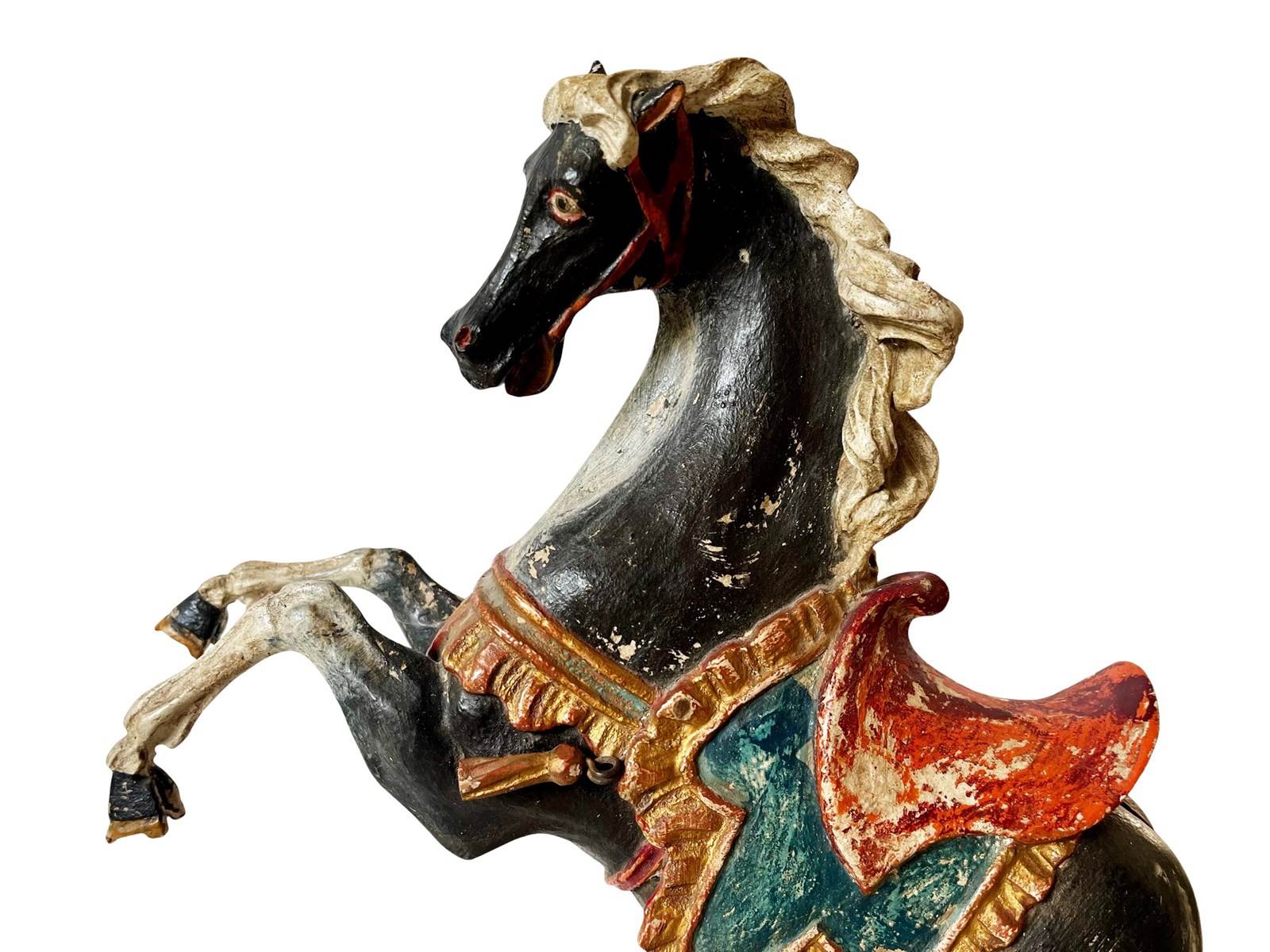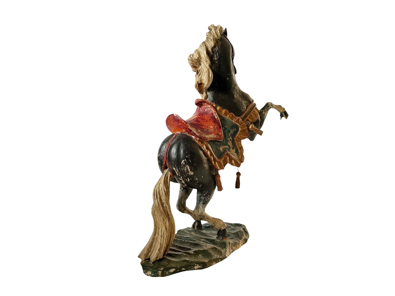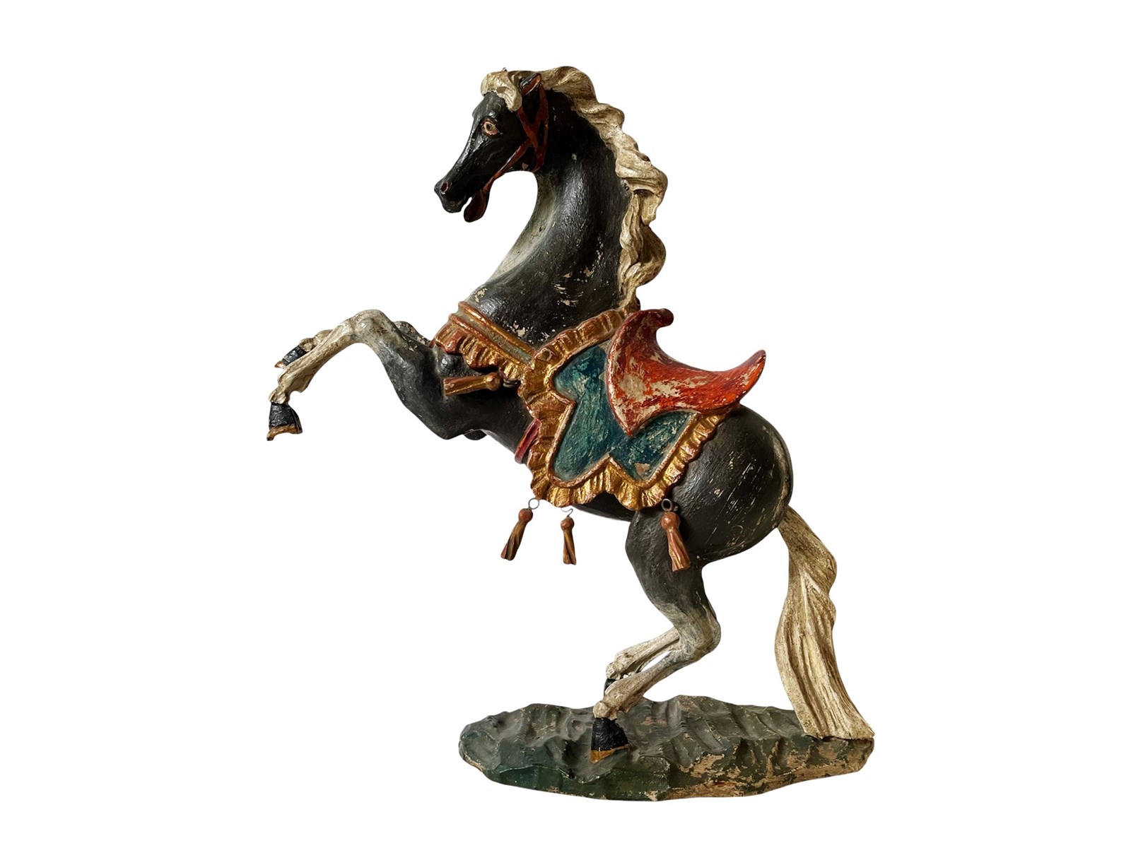 This is a truly fabulous and extremely rare German Baroque horse that dates from the late 18th century. Discovered recently this magnificent antique statue of a black horse is hand carved from wood and painted. The horse is adorned by a colourful saddle with tassels and it measures about 36 x 34 x 11 cm or approximately 14.1 x 13.3 x 4.3 inches. What makes it even more amazing today in my opinion is its stunning timeworn patina that brings so much unique appeal and splendour today. It is exactly as I discovered it. For the full condition please refer to the images!