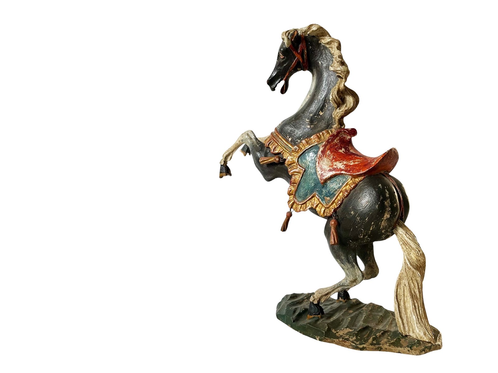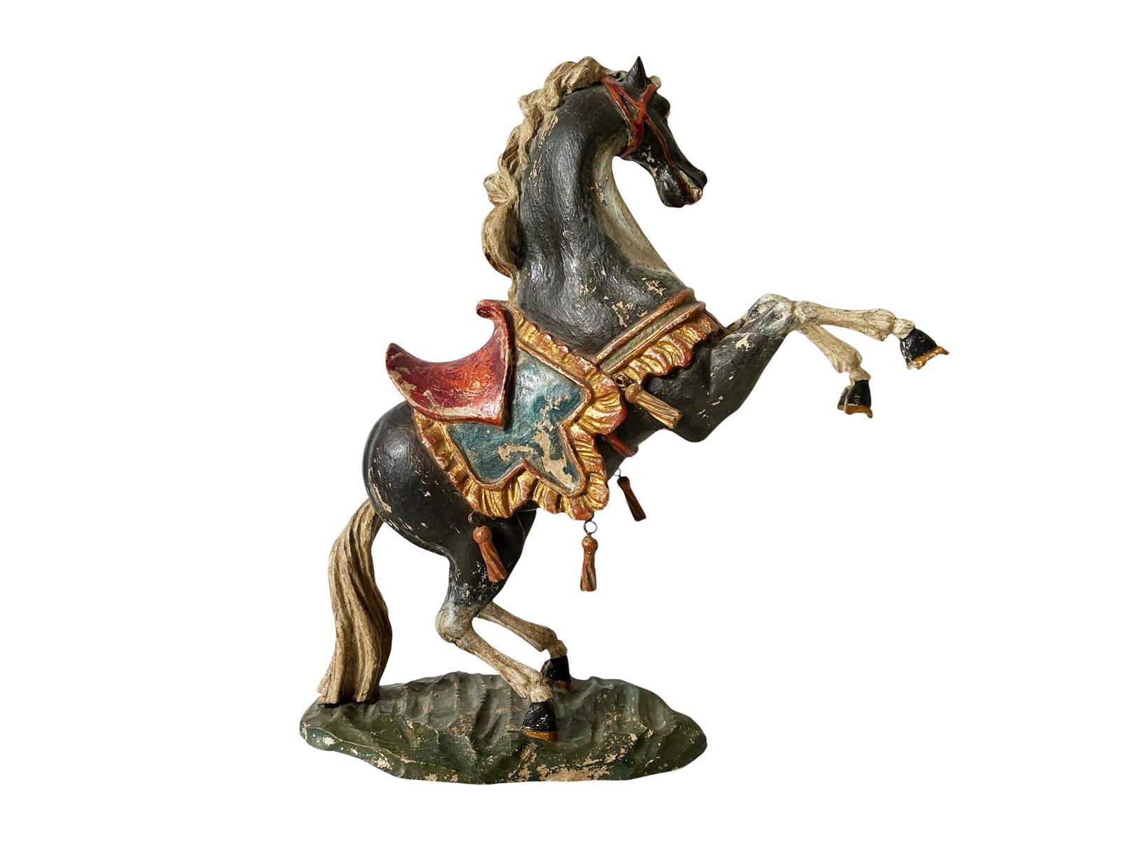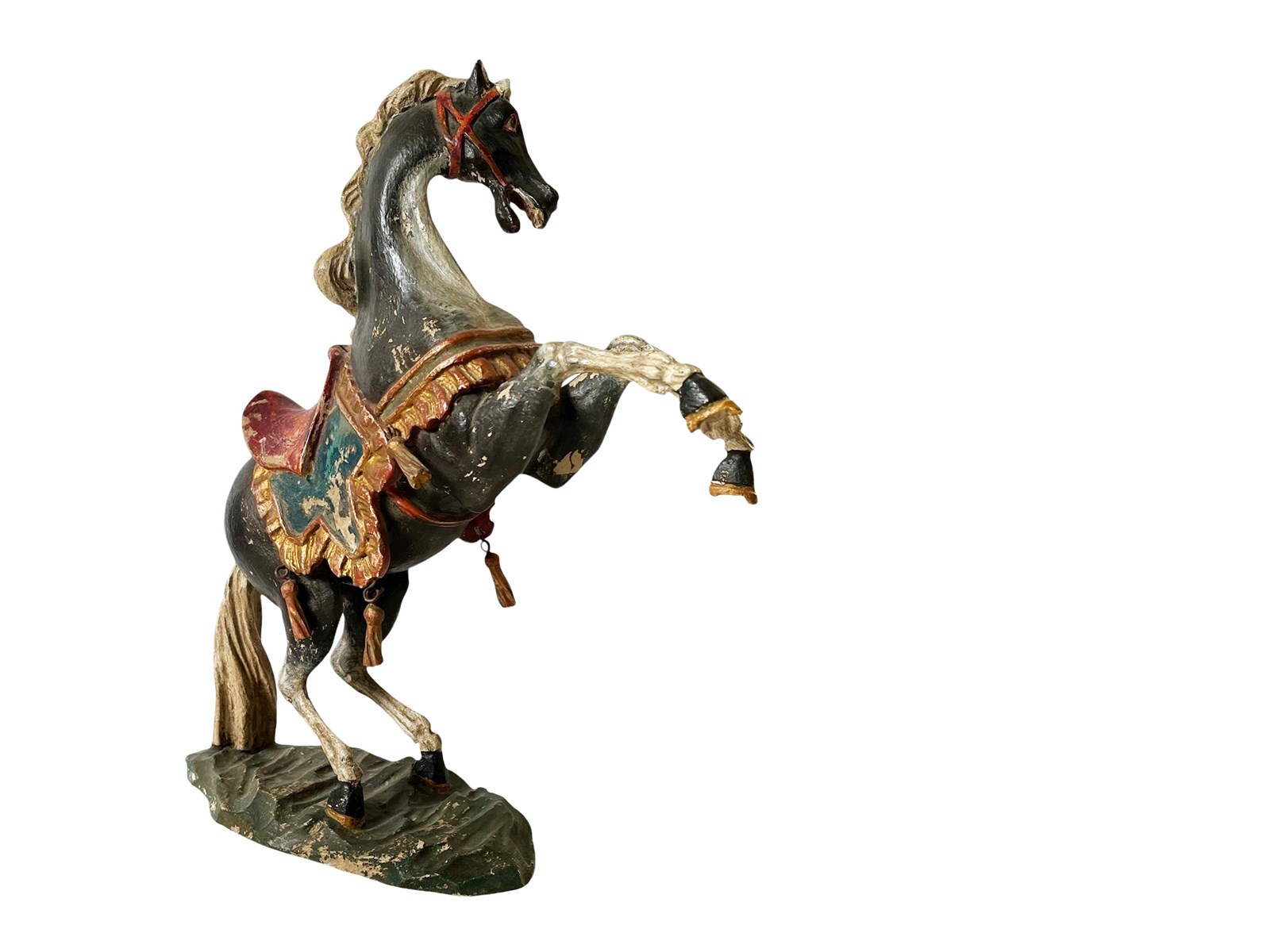 This is a truly fabulous and extremely rare German Baroque horse that dates from the late 18th century. Discovered recently this magnificent antique statue of a black horse is hand carved from wood and painted. The horse is adorned by a colourful saddle with tassels and it measures about 36 x 34 x 11 cm or approximately 14.1 x 13.3 x 4.3 inches. What makes it even more amazing today in my opinion is its stunning timeworn patina that brings so much unique appeal and splendour today. It is exactly as I discovered it. For the full condition please refer to the images!
