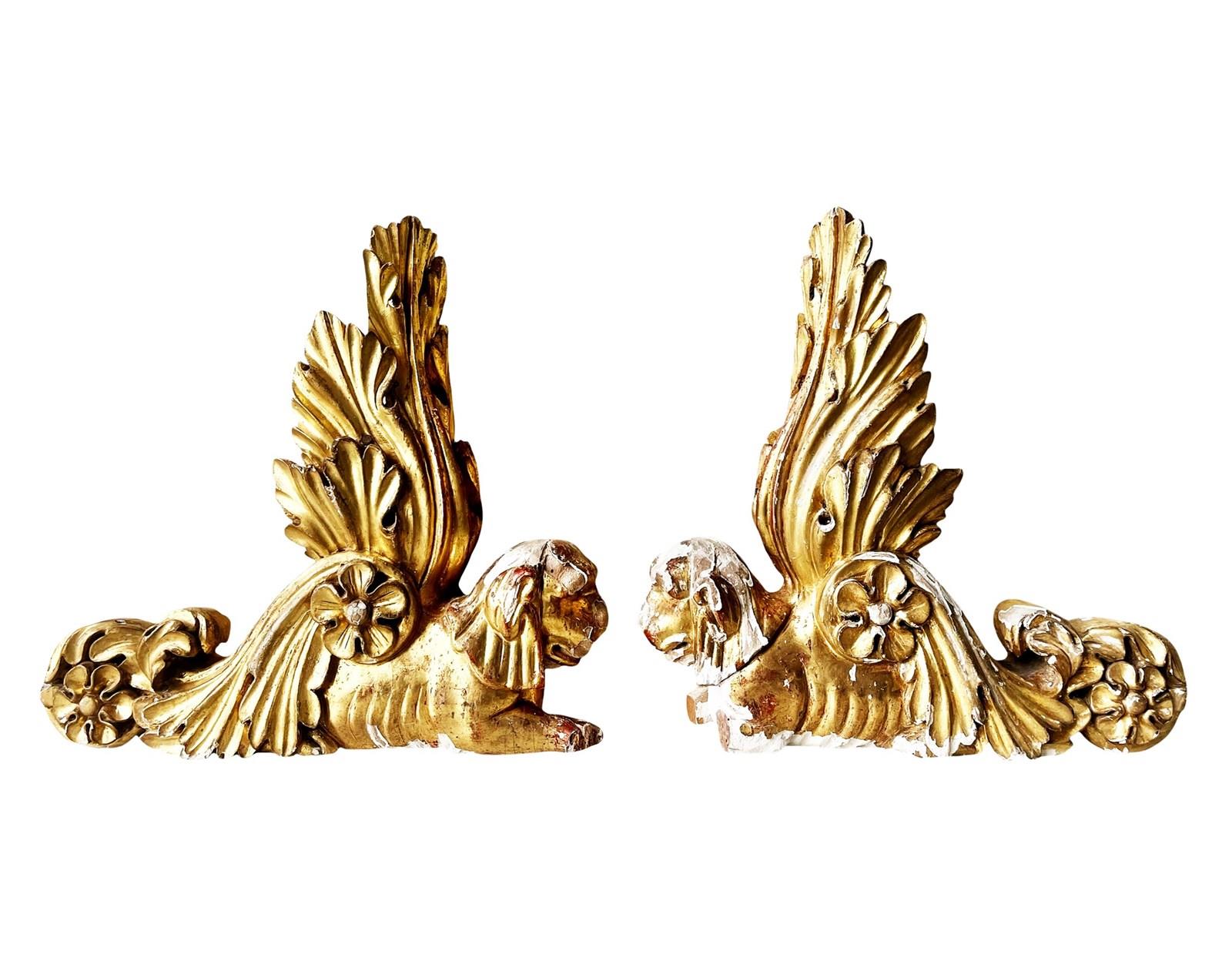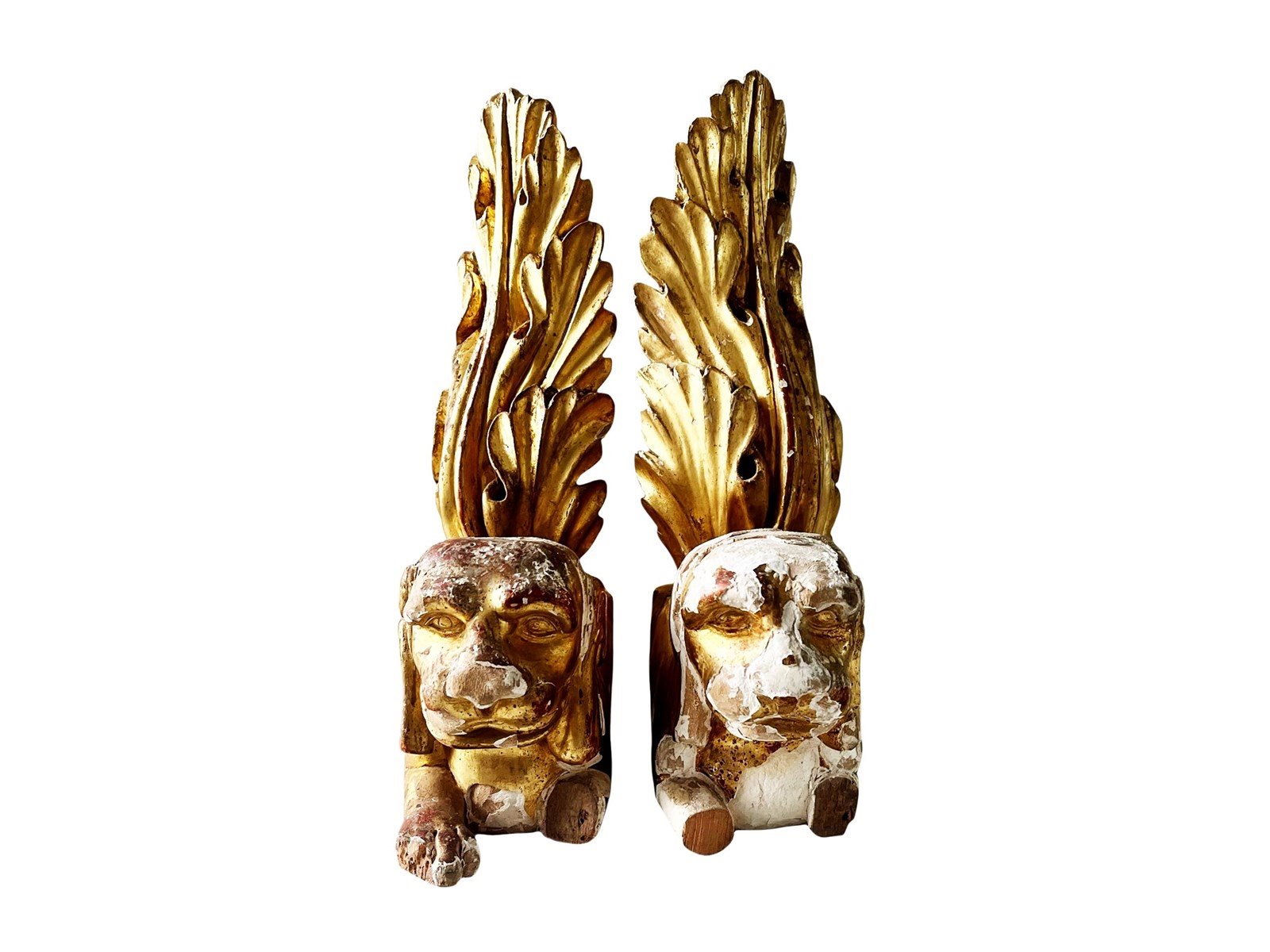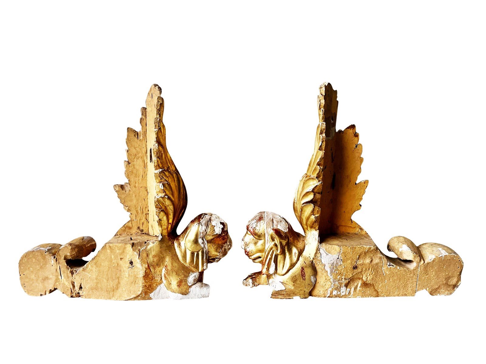 This is a fabulous pair or rare antique French architectural fragments that date from the second half of the 18th century. They are created from gilded and hand carved wood in the form of winged dogs adorned with floral details. Once they were a part of a grand interior of a chateau in the South of France. Through the passage of time some of the gilding has flaked away creating in the process a mesmerising distressed patina of captivating beauty. In my opinion this enhances even further their highly decorative presence. Each one measures about 34 x 34 x 9 cm or approximately 13.3 x 13.3 x 3.5 inches. They are free standing and in lovely timeworn antique condition that could be displayed in so many creative ways. These are fantastic adornments and exactly as I discovered them at the beginning of 2026 in Avignon. For the full condition please refer to the images!