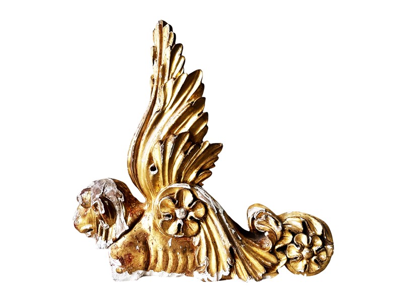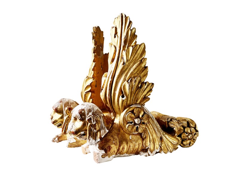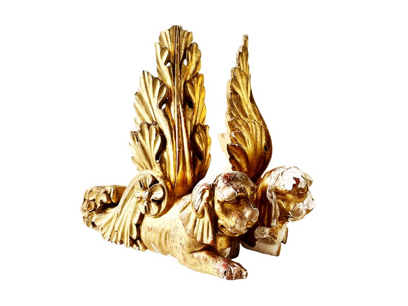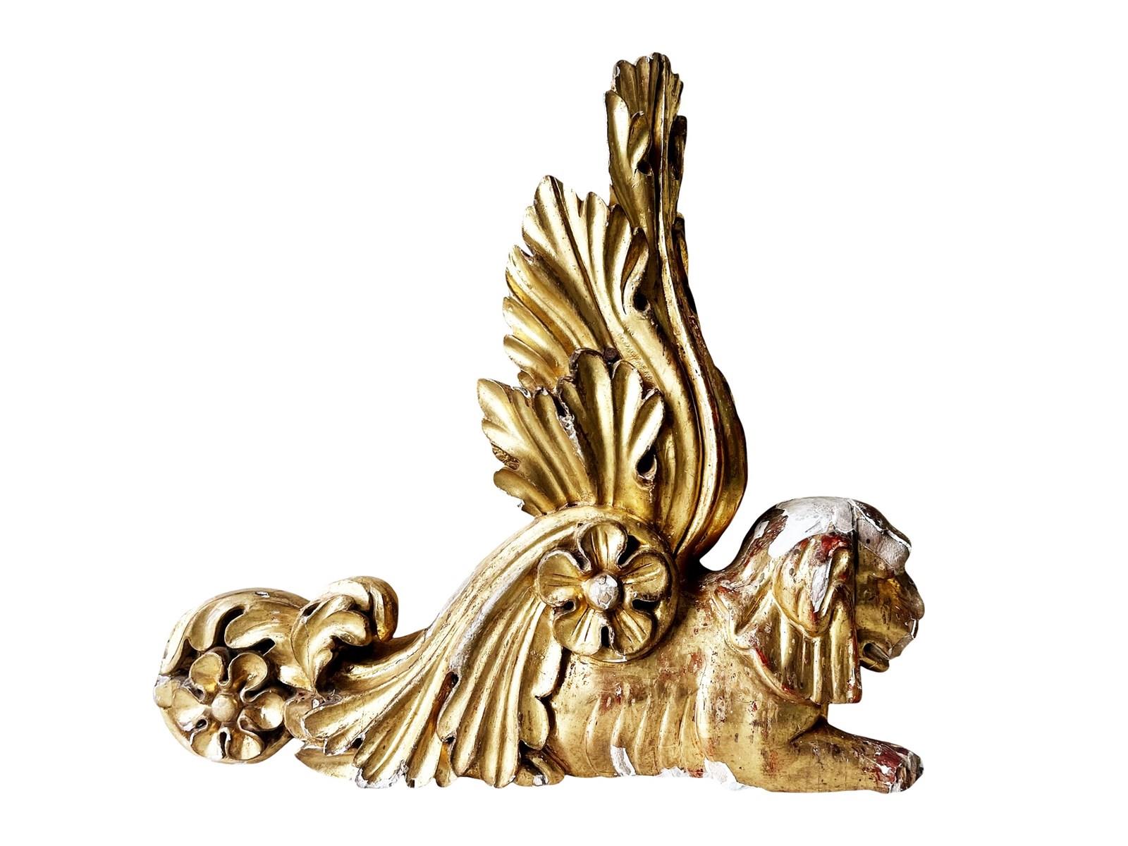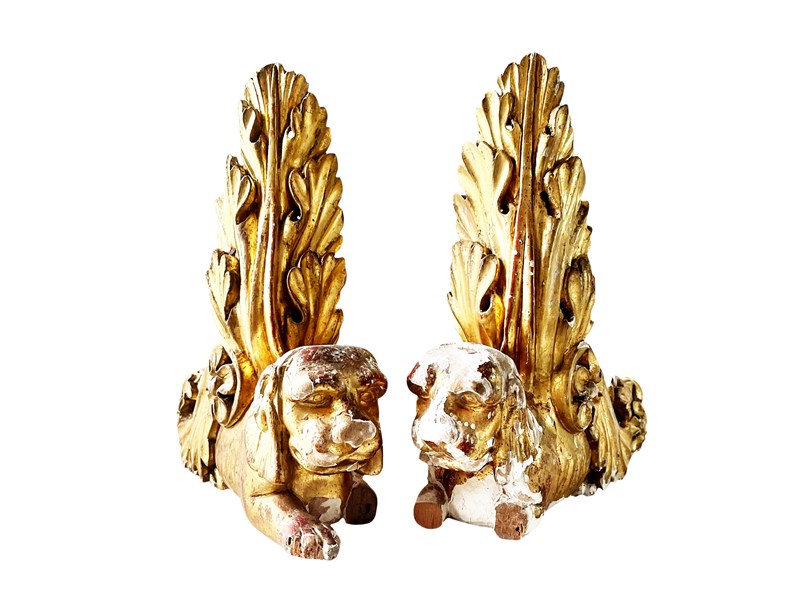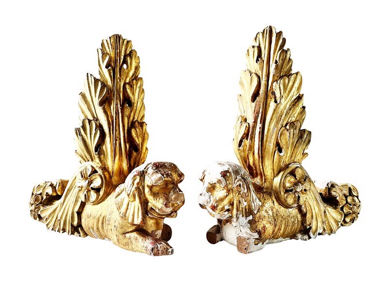 This is a fabulous pair or rare antique French architectural fragments that date from the second half of the 18th century. They are created from gilded and hand carved wood in the form of winged dogs adorned with floral details. Once they were a part of a grand interior of a chateau in the South of France. Through the passage of time some of the gilding has flaked away creating in the process a mesmerising distressed patina of captivating beauty. In my opinion this enhances even further their highly decorative presence. Each one measures about 34 x 34 x 9 cm or approximately 13.3 x 13.3 x 3.5 inches. They are free standing and in lovely timeworn antique condition that could be displayed in so many creative ways. These are fantastic adornments and exactly as I discovered them at the beginning of 2026 in Avignon. For the full condition please refer to the images!