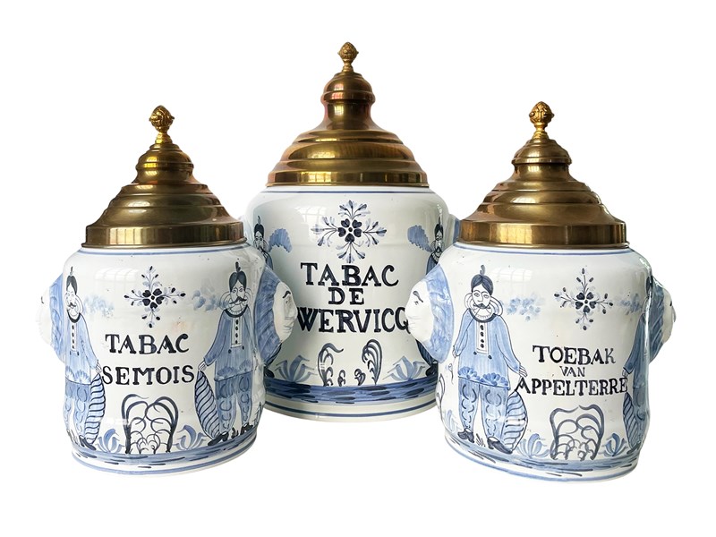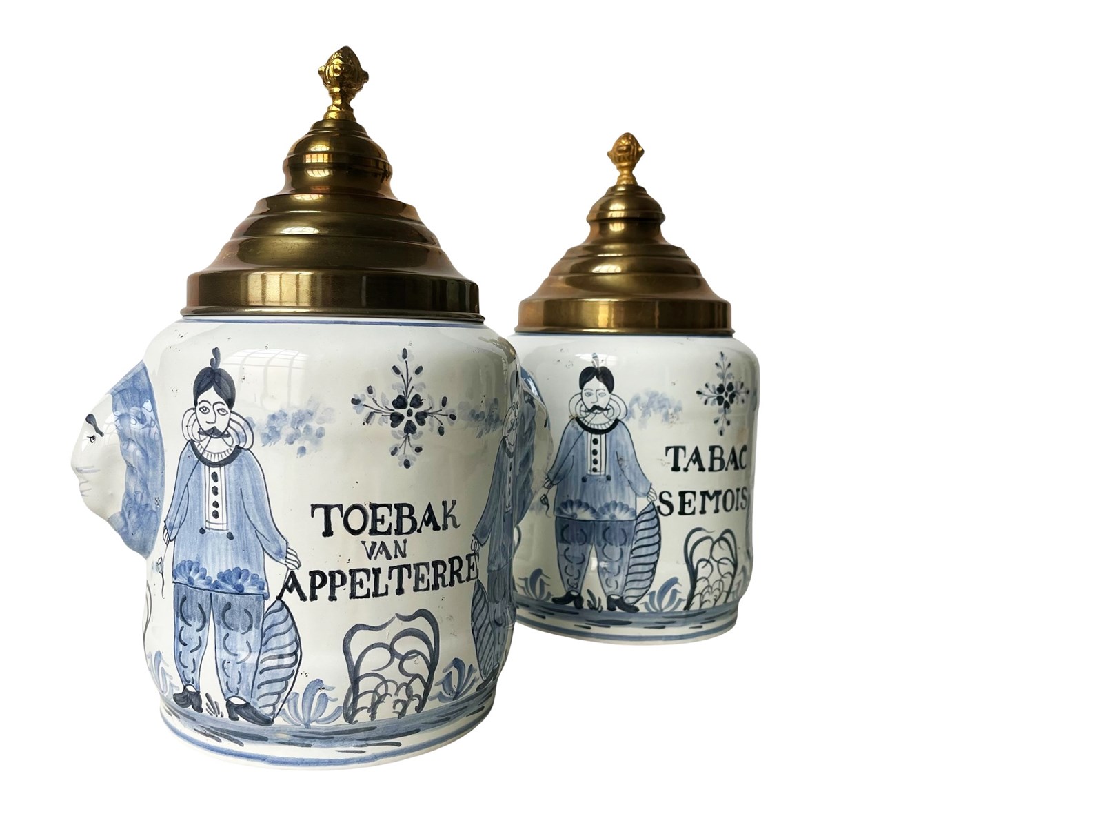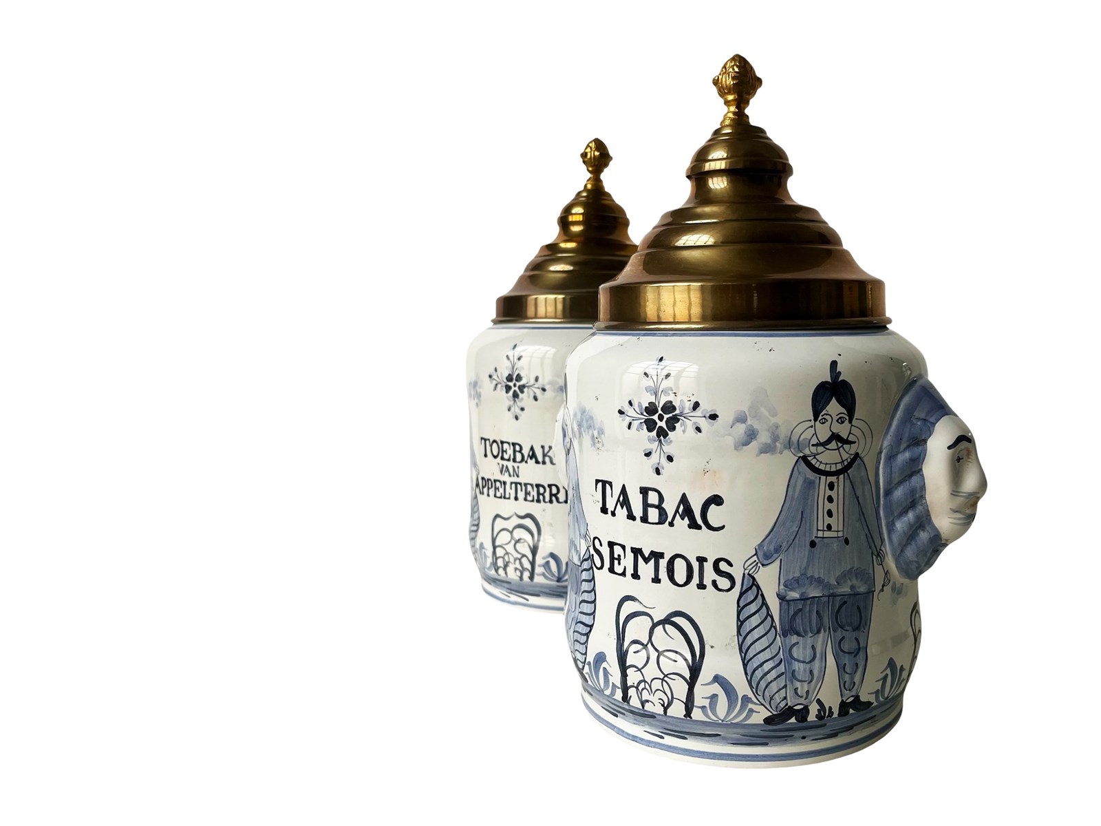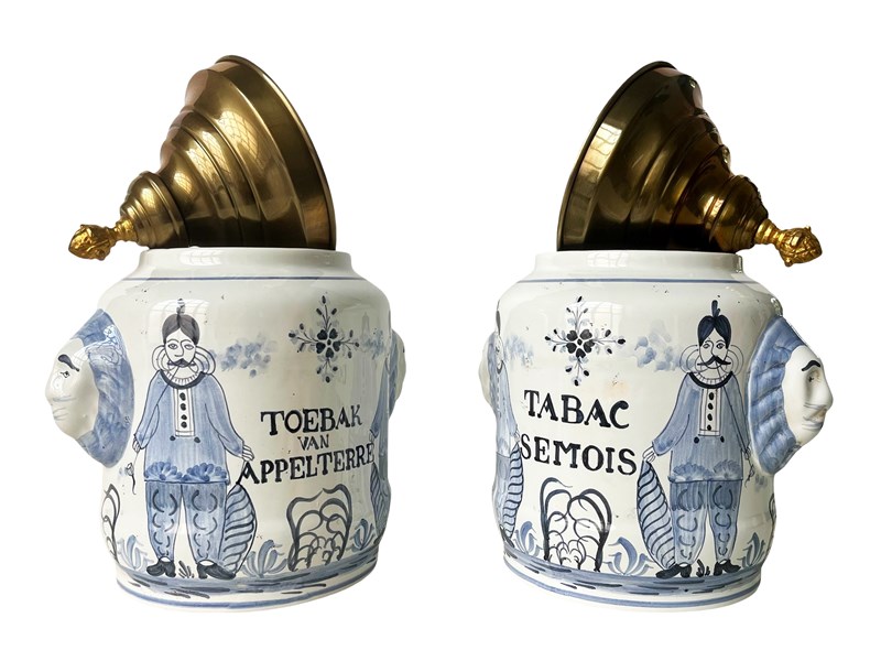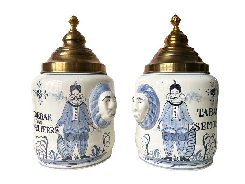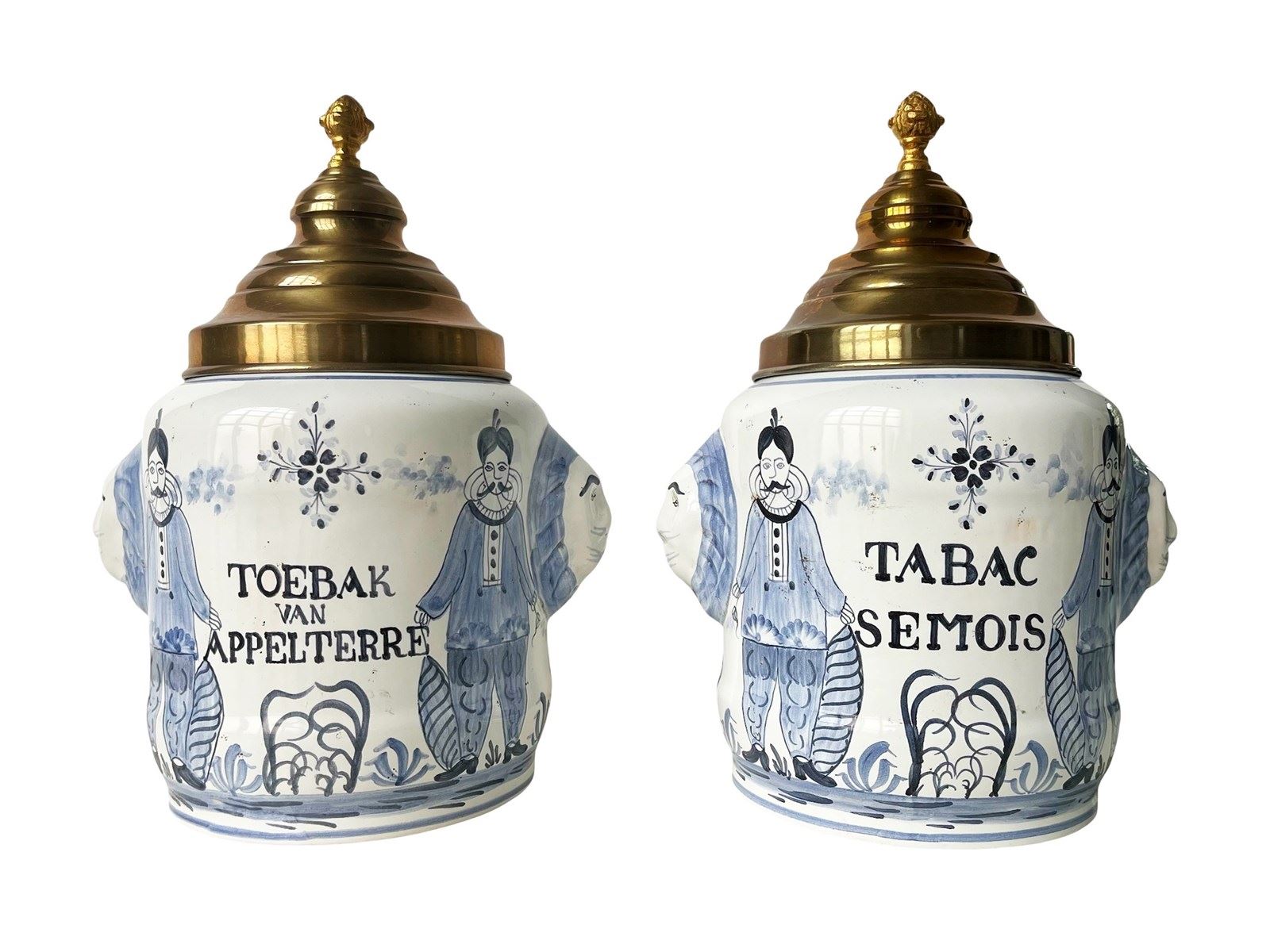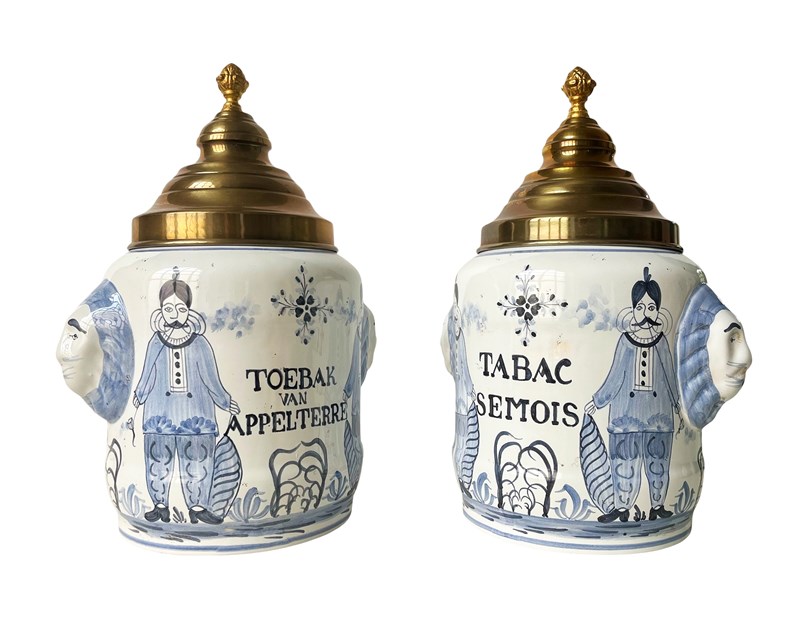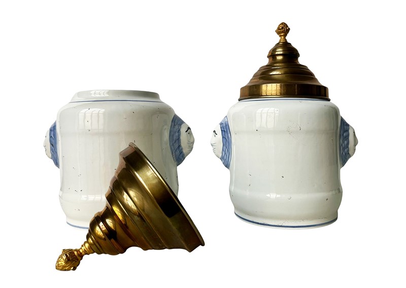 This is a fabulous pair of antique pharmaceutical or apothecary jars that were discovered recently in Antwerp, Belgium. Dating from the 19th century these highly decorative treasures are created masterfully from porcelain with hand painted details in blue. Their artistic quality is truly magnificent. Each jar has two side handles in the shape of lions' heads and a gorgeous metal lid. Once they were containers for dried tobacco. Considering their age the jars are in great antique condition and exactly as I discovered them. Each one measures about 31 x 23 x 18 cm or approximately 12.2 x 9 x 7 inches. For the full condition please refer to the images!