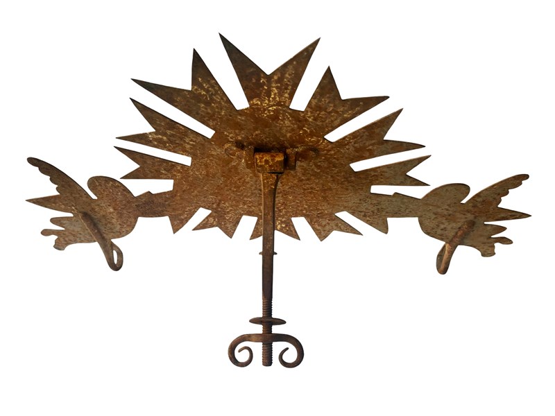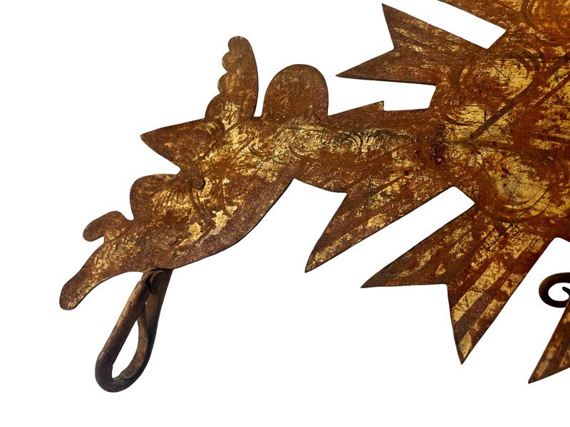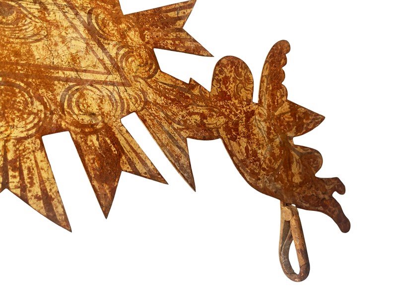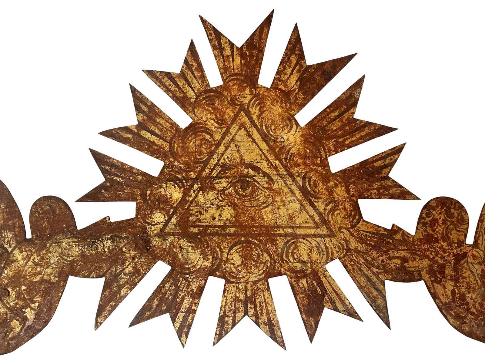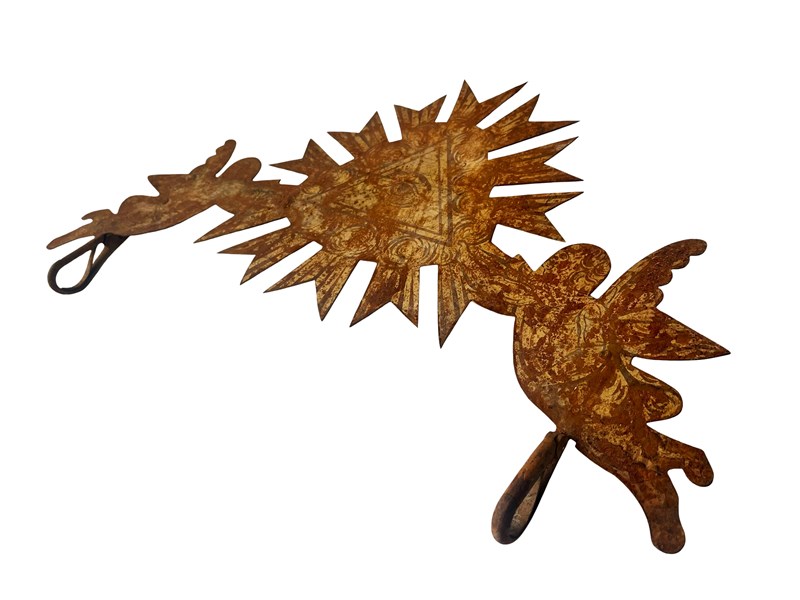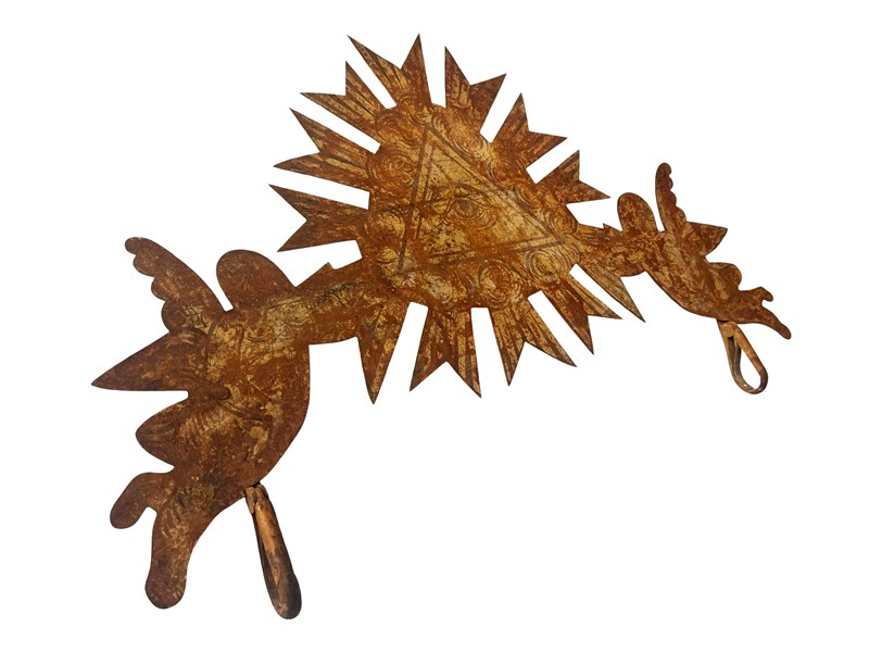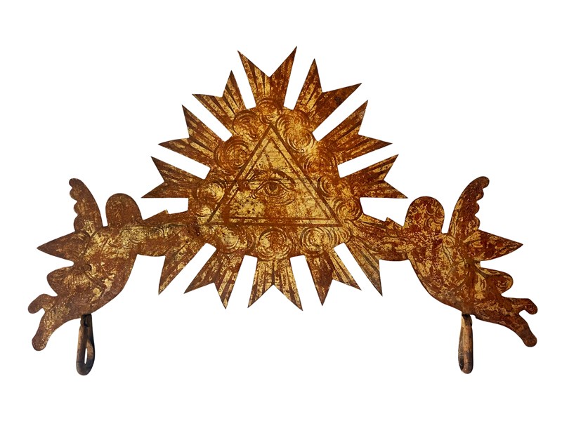 This is an incredible and extremely rare antique French shop sign that consist of the Eye of God or Eye of Providence held by two angels. The eye is surrounded by clouds and rays of light, denoting to the heavens. This one of a kind treasure is made of metal and once it was fully gilded. This has flaked away during the centuries creating in the process a mesmerising timeworn and distressed patina that is just exquisite. Below the angels are two hooks which once held the name of the shop [not in existence any longer]. On the back there is still the original fitting with a long part that could be used as the easel "leg". This way it could be displayed on a flat surface with this support [as shown in the last image]. Otherwise it could also look exceptional if shown on a wall. It measures about 33 x 50 cm or approximately 13 x 20 inches and it is exactly as I discovered it recently in the South of France with signs of ageing that in my opinion only bring forth its true beauty and splendour today. For the full condition please refer to the images!