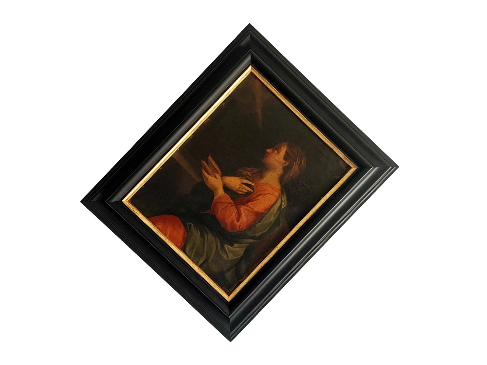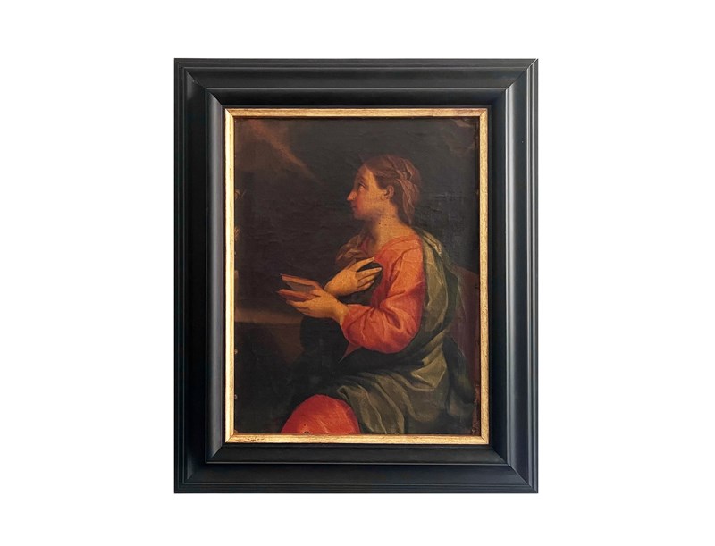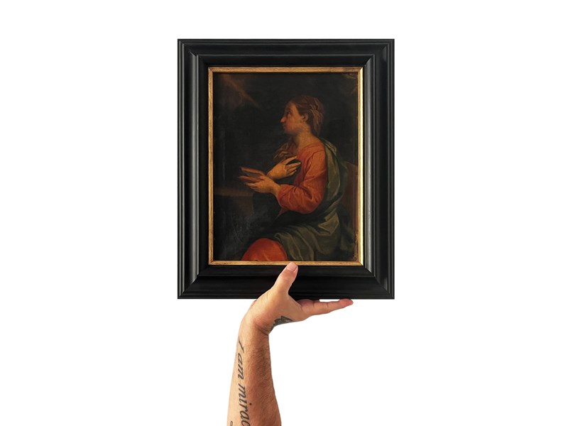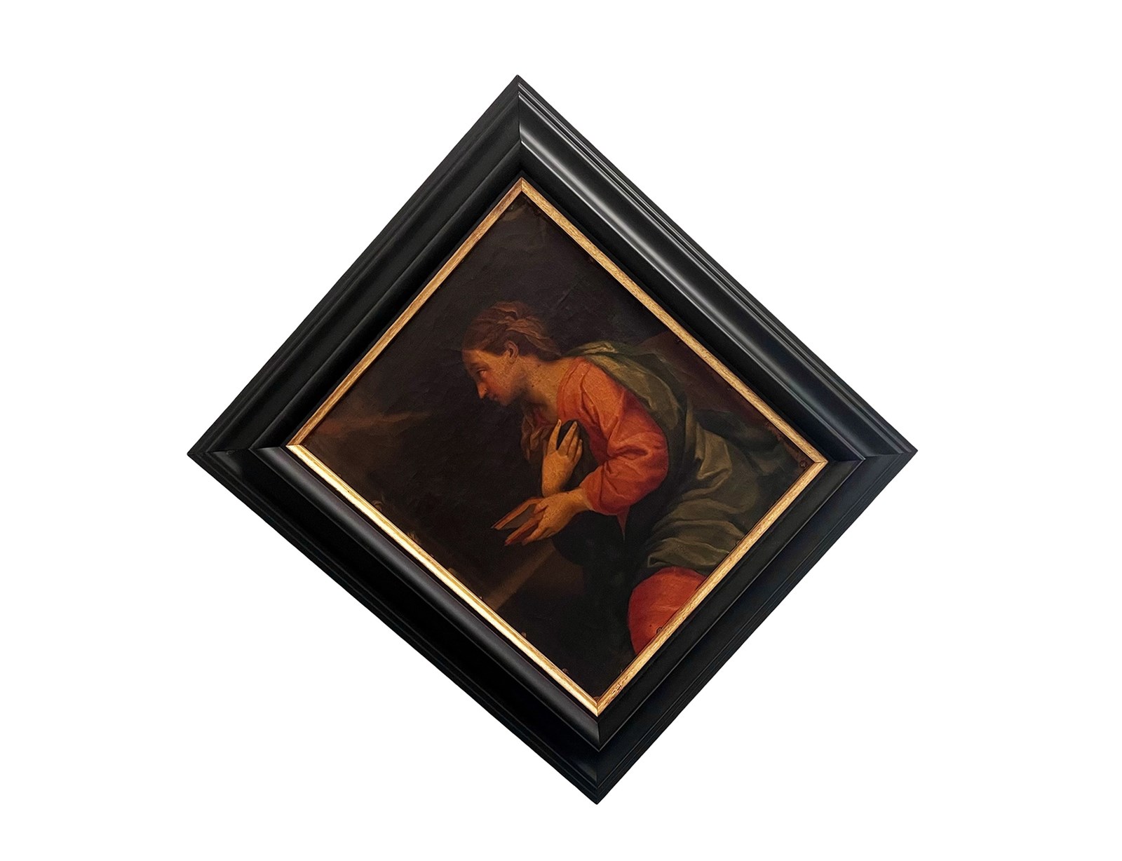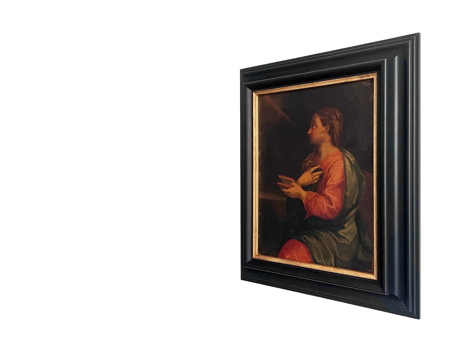 This is a beautiful antique Italian painting of the Madonna that was discovered recently in Florence. Dating from the 18th century this wonderful oil on canvas depicts the Virgin Mary in a contemplative pose giving it a peaceful allure. The canvas size is about 34 x 27 cm or approximately 13.3 x 10.6 inches. Recently it was framed in a wooden frame measuring 47 x 40 x 4.5 cm or about 18.5 x 15.7 x 1.7 inches. The painting is in lovely antique condition with minor signs of ageing expected from the items of this age. It is exactly as I discovered it except the frame which is new. For the full condition please refer to the images!
