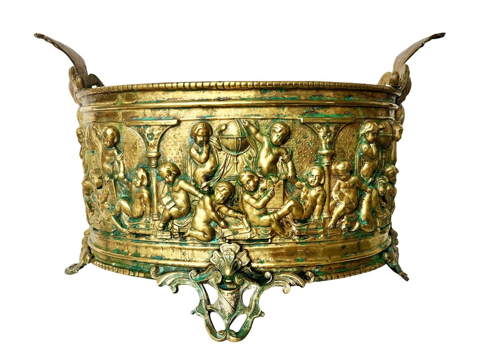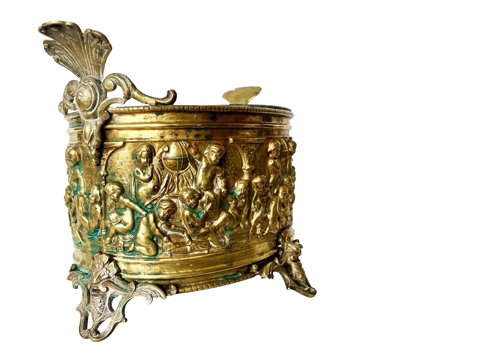 This is an opulent and large antique French jardiniere that dates from the earlier part of the 19th century. Discovered recently in Avignon in the South of France, this gorgeous treasure is captivating in its elaborate design as well as a magnificent patina created by the passage of time. It measures about 28.5 x 46.5 x 32.5 cm or approximately 11.2 x 18.3 x 12.7 inches and it is created from brass with great attention to detail and craftsmanship. It also bears the number and embossed name of its maker. The jardiniere comes with a zinc inlay. This is a large vessel so it could hold a few pots of orchids for example or be used as a fruit bowl or a container of other treasures if desired. Its sculptural appeal is just magnificent. The jardinere is exactly as I discovered it with signs of ageing mainly seen in a glorious patina that is just exquisite. This in my opinion only enhances its true beauty and splendour today. For the full condition please refer to the images!