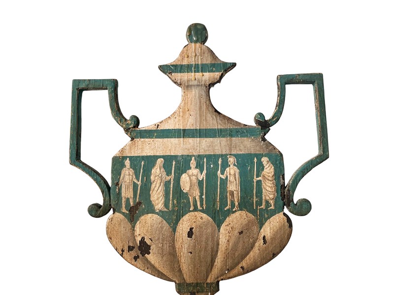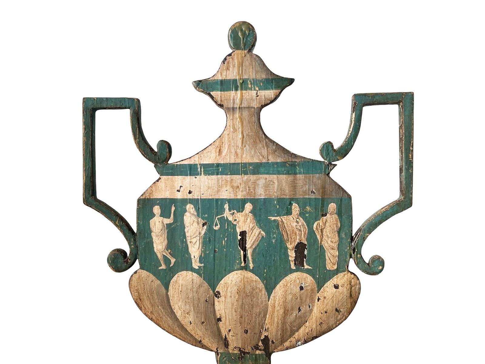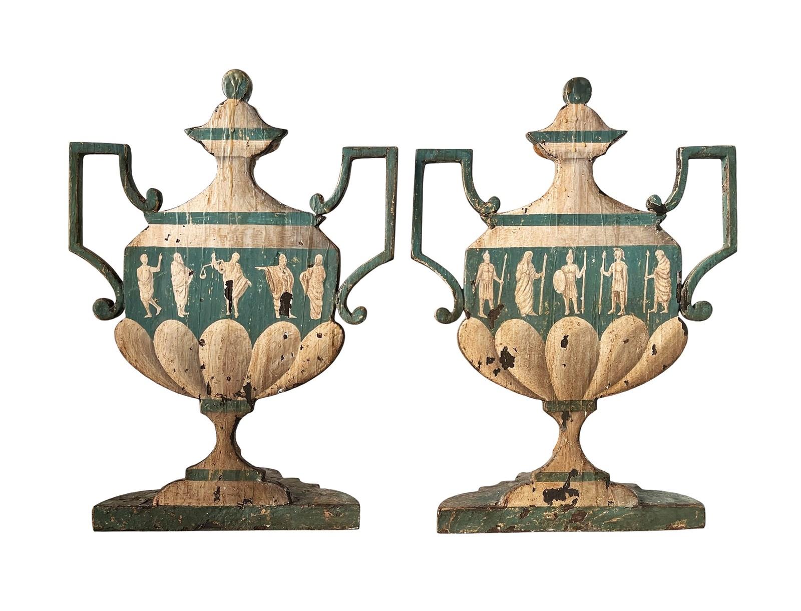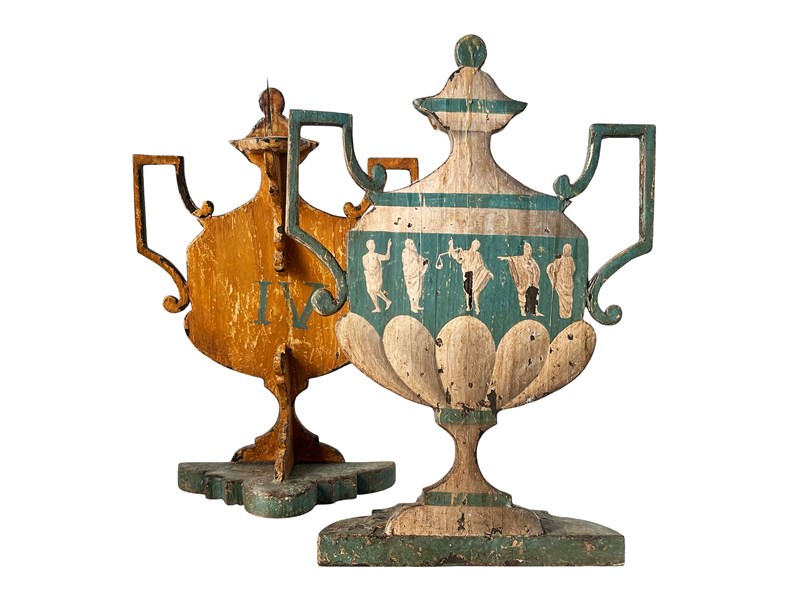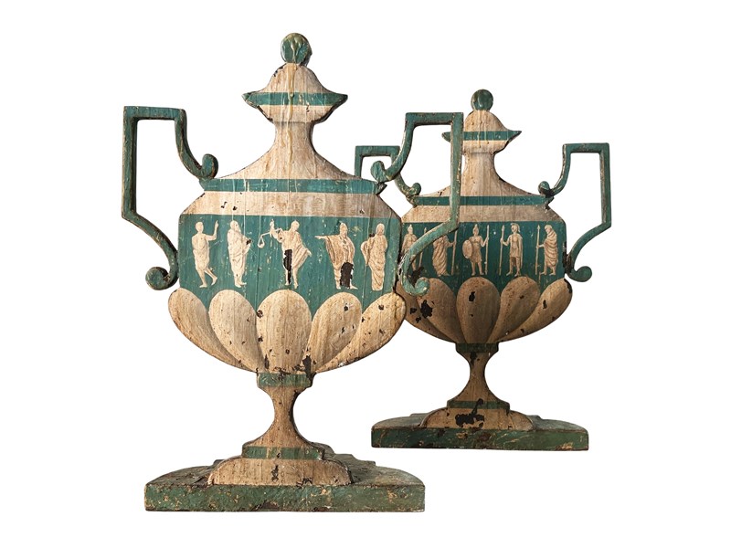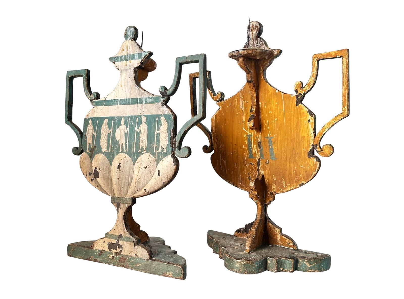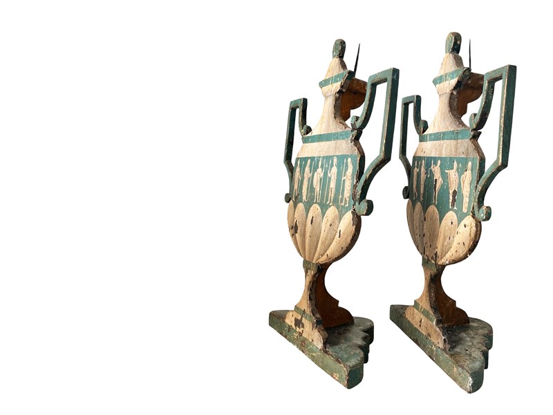 This is a remarkable pair of Italian chateau candleholders that were discovered recently in Beziers in the South of France. Created from wood in the forms of Ancient Greek vases they were painted with Classical motives in the shades of stunning blue and cream. Through the passage of time a magnificent distressed patina has been created that today gives that such exceptional beauty and appeal. These are highly decorative treasures that date perhaps from the 1800's or earlier and are exactly as I discovered them. Each one measures about 40.5 x 28 x 10 cm or approximately 16 x 11 x 4 inches. For the full condition please refer to the images!
