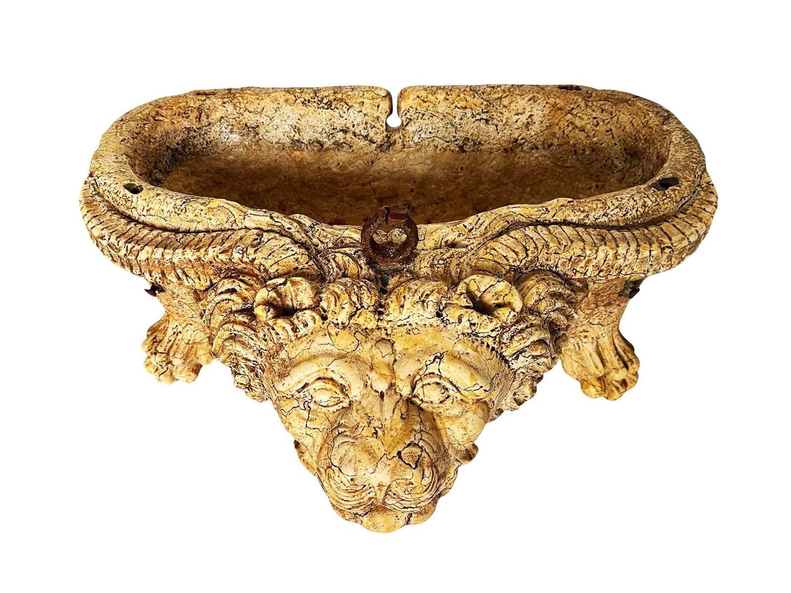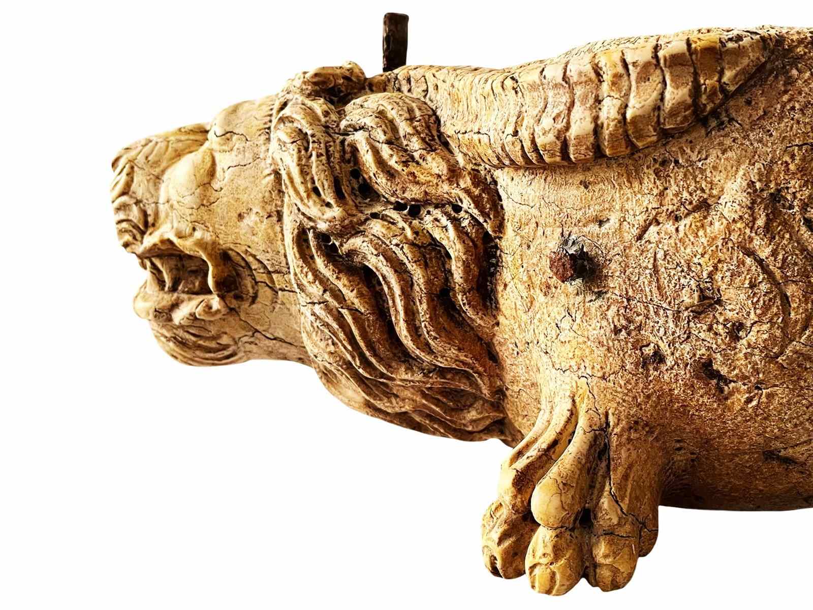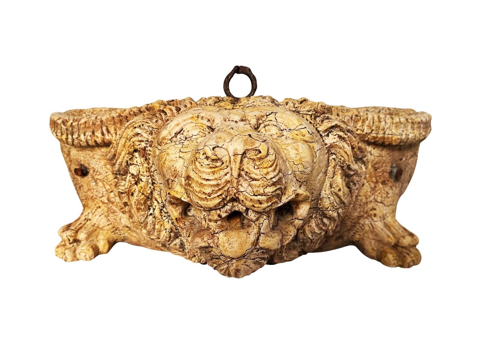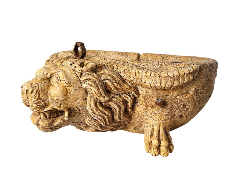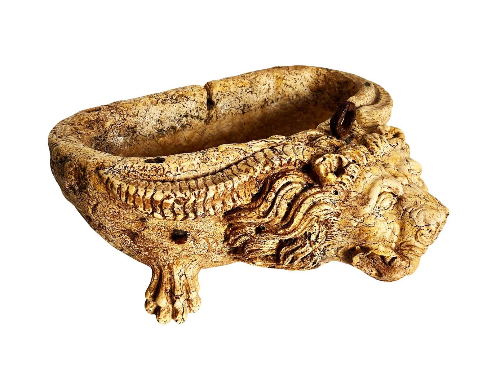 This is a truly remarkable antique Italian treasure that was discovered recently in Verona. Dating from the 17th century or earlier, this magnificent artefact was created as an architectural ornament and most certainly used as a water collecting basin. The front is adorned with a lion's head with paws and long horns. In the past such fantastical creatures would play a significant part in decorating noble palaces and mansions as it was believed that such fierce beasts would protect one's home from evil spirits and entities. The vessel is completely hand carved from a single large block of marble with exceptional artistic quality and craftsmanship. It measures about 23 x 53 x 43 cm or approximately 9 x 21 x 17 inches and it is in lovely antique condition and exactly as I discovered it. For the full condition please refer to the images!