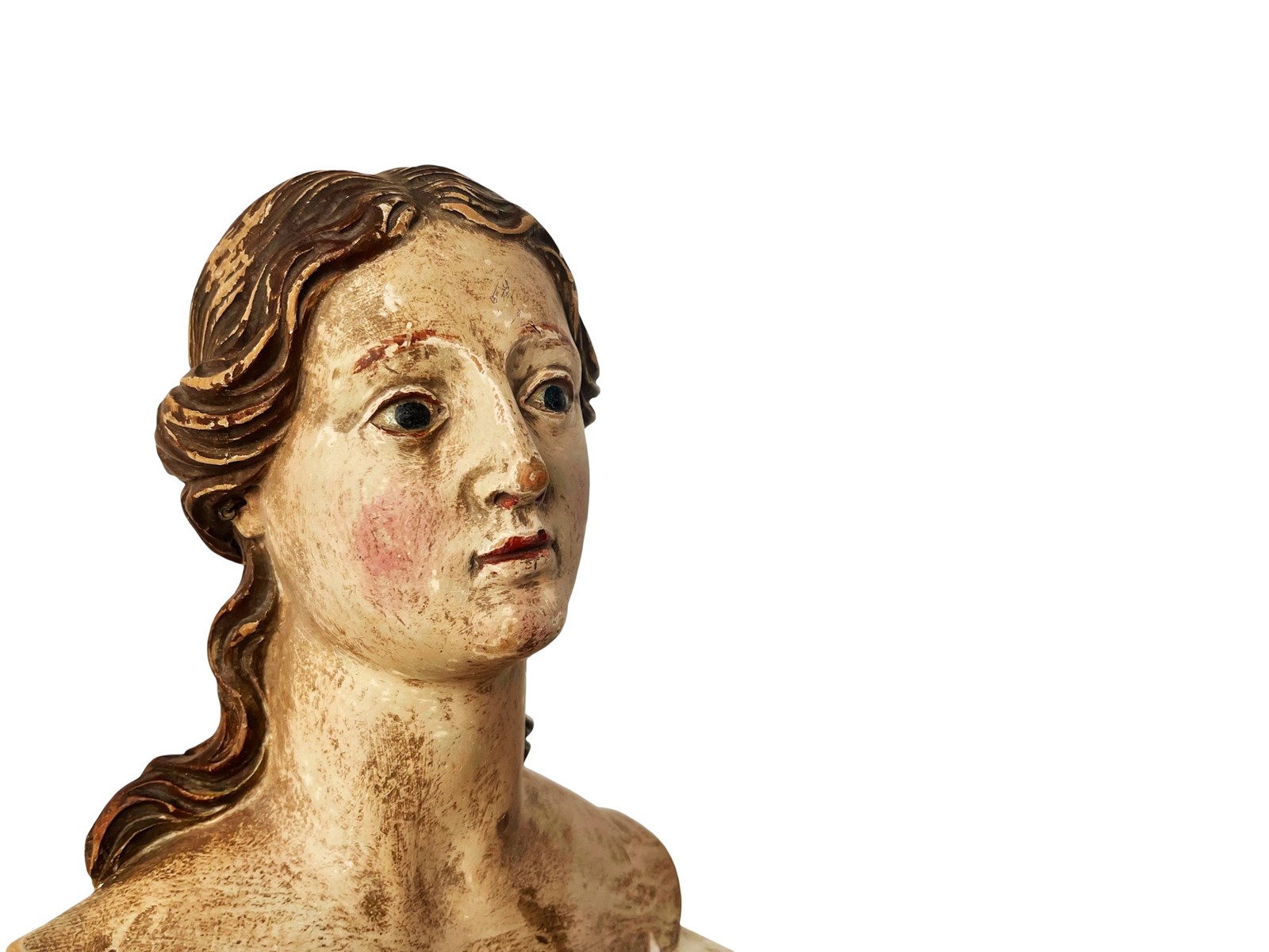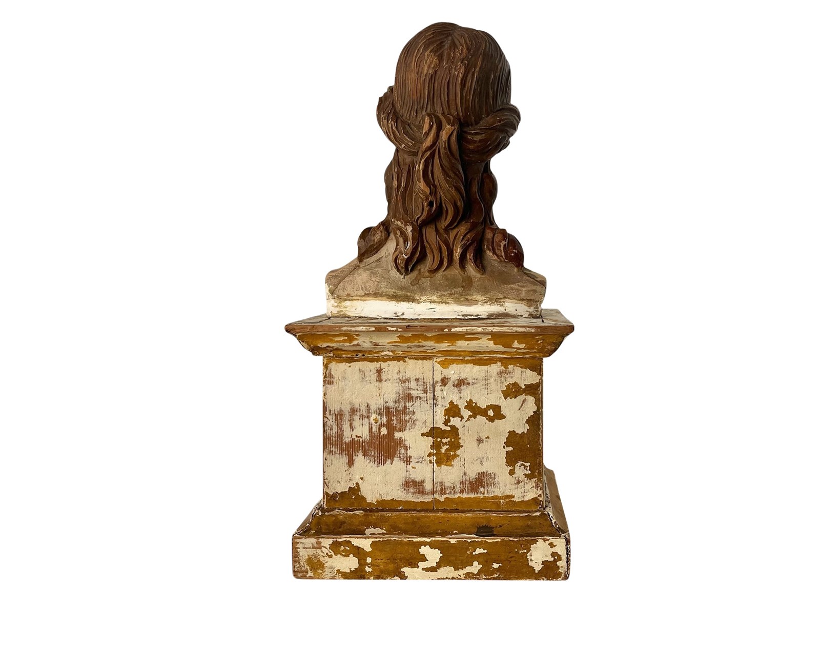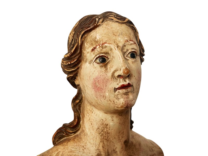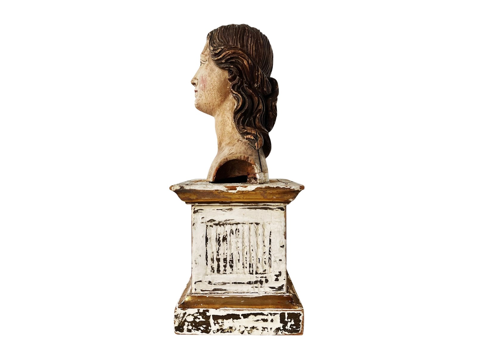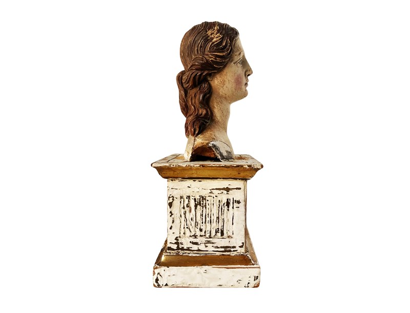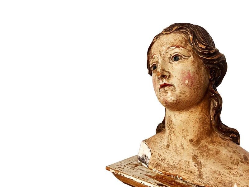 This is a truly remarkable antique Italian bust of a female Santo that was discovered recently in Rome. It dates from the 18th century and it is entirely hand carved from wood that was partially gilded and painted. Through the passage of time a magnificent distressed patina has been created that in my opinion only brings forth its true unique beauty and splendour today. It measures about 33.5 x 17 x 13 cm or approximately 13.1 x 6.6 x 5.1 inches and it is exactly as I discovered it. For the full condition please refer to the images!