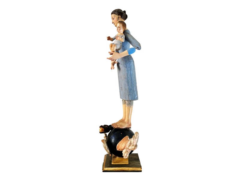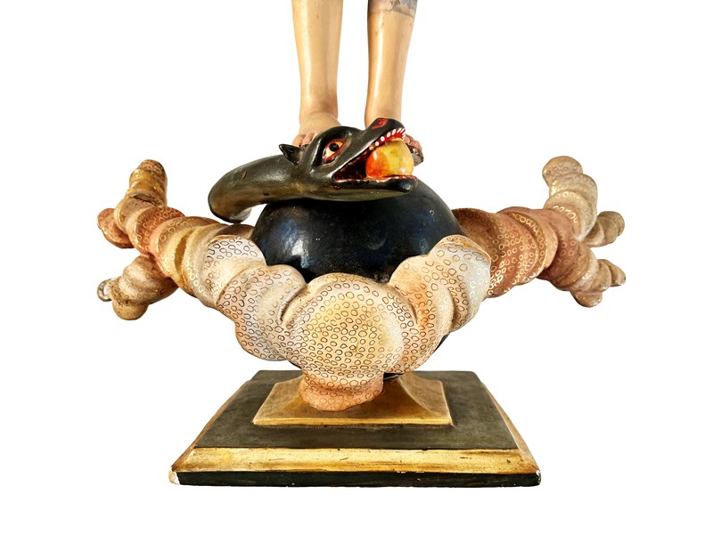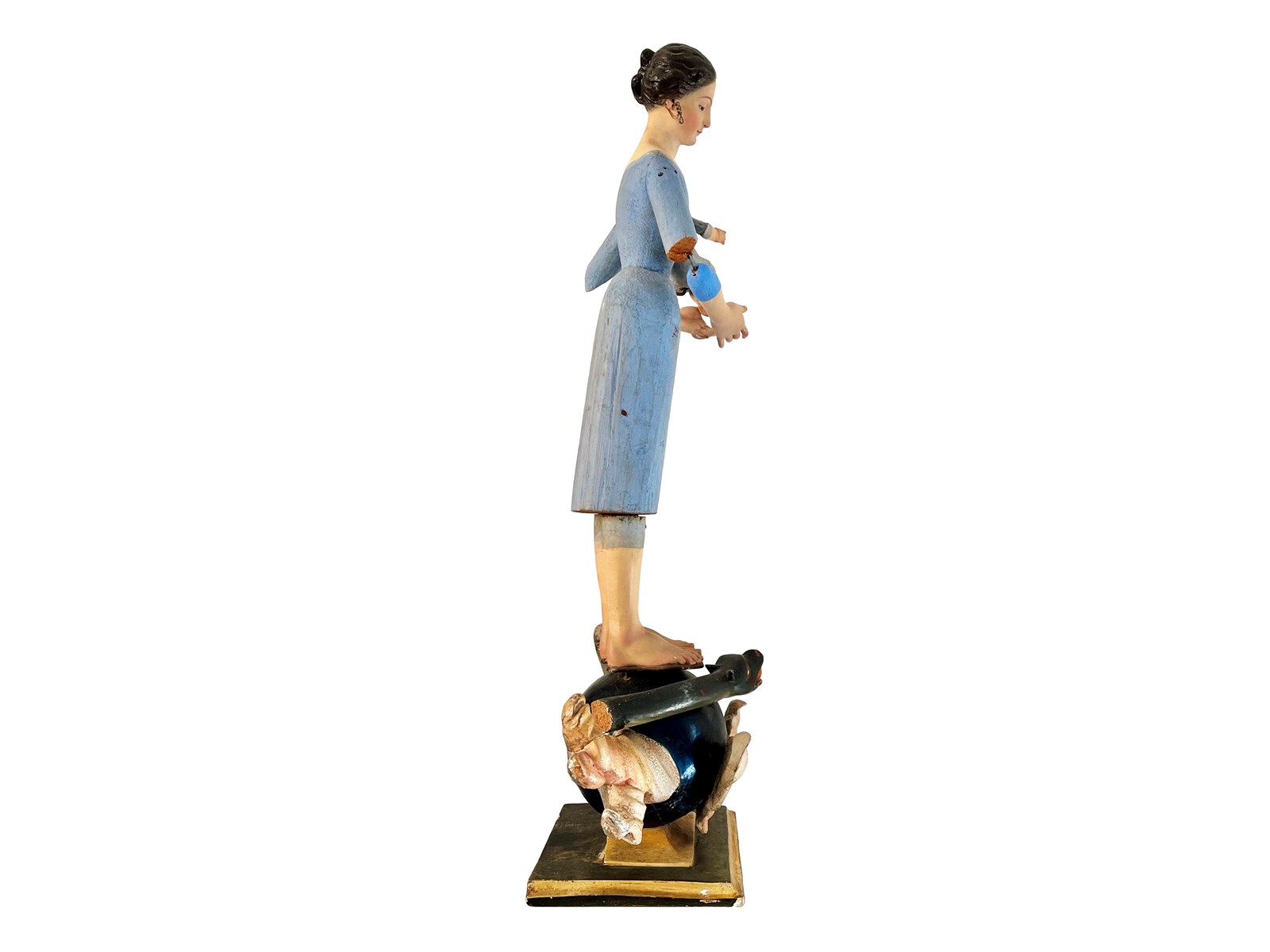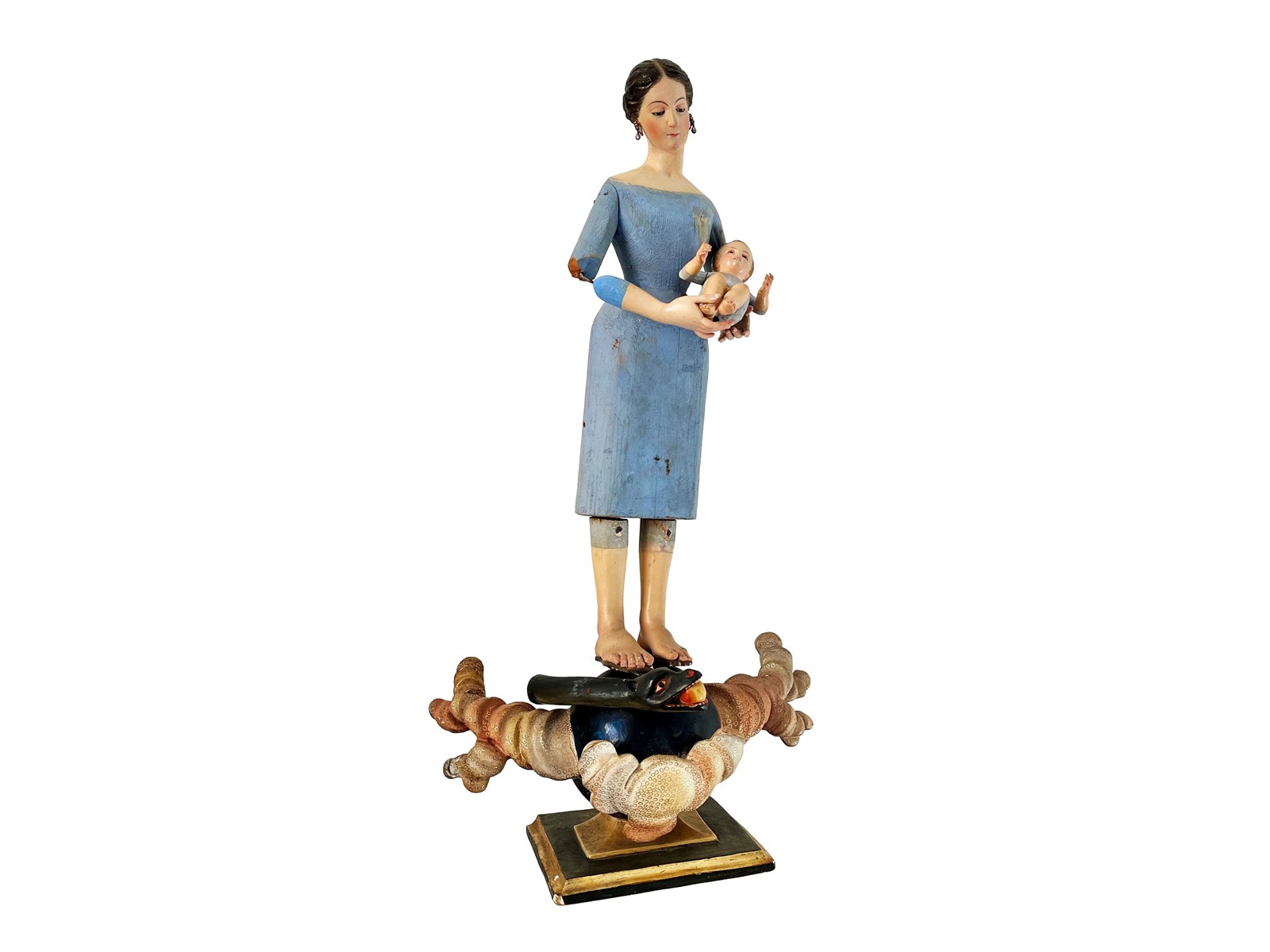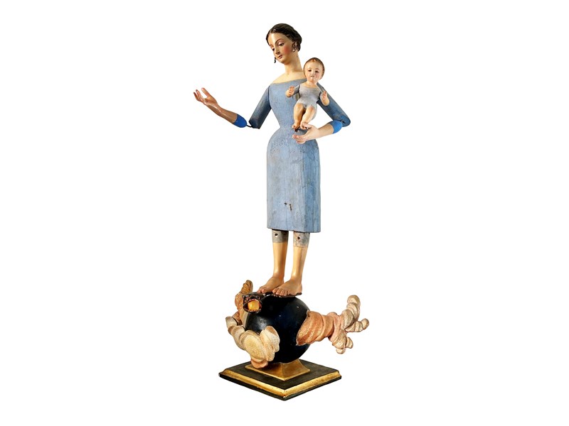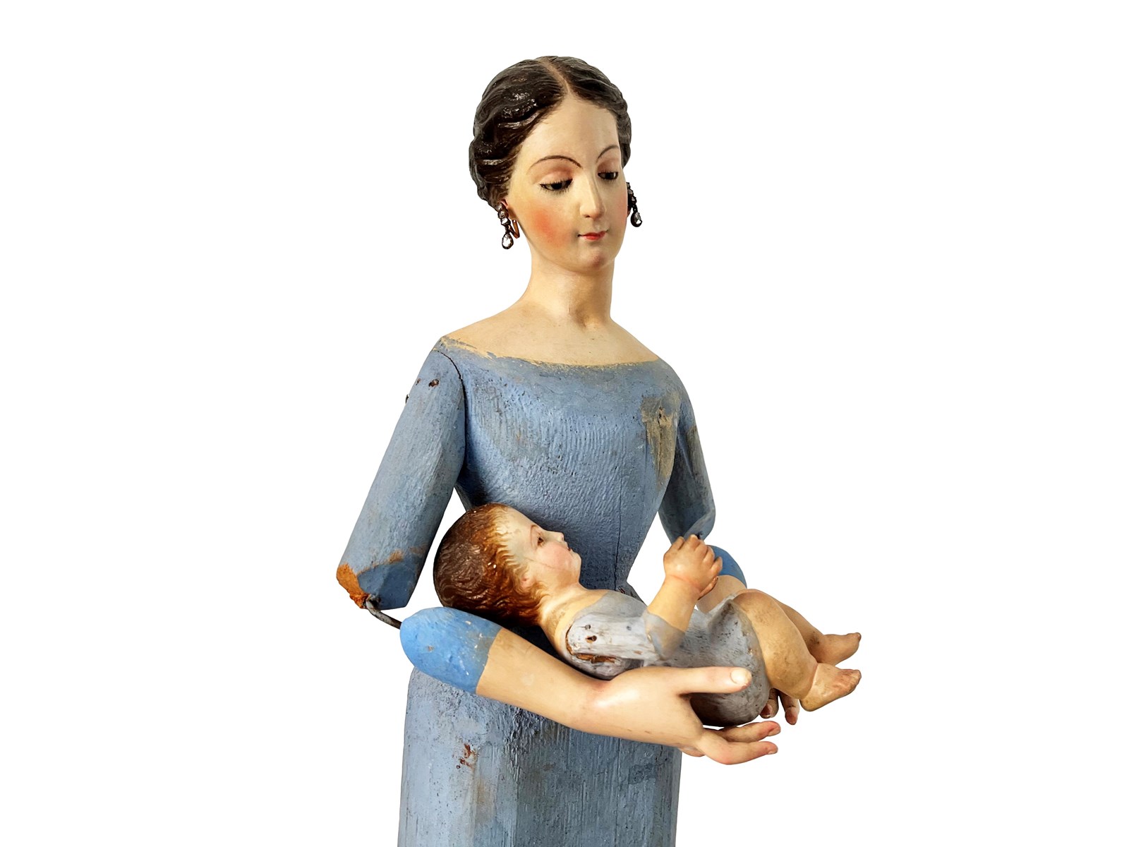 This is a majestic antique Spanish santo of Madonna and Child that dates from the mid 19th century. Exquisite in its breathtaking beauty and tender tranquility it is masterfully hand carved from wood and painted, with exception of the eyes which are made out of glass. The arms of both figures can move slightly so that they could be placed in a desired position. The baby is truly adorable. The Madonna statue that still bears the original cut crystal earrings is mounted on a fascinating stand [partially gilded] with a serpent. This is a remarkable and outstanding treasure that is in lovely antique condition with minor signs of ageing and a stunning patina which in my opinion only brings forth its true beauty and splendour today. It is exactly as I discovered it in Barcelona. For the full condition please refer to the images!