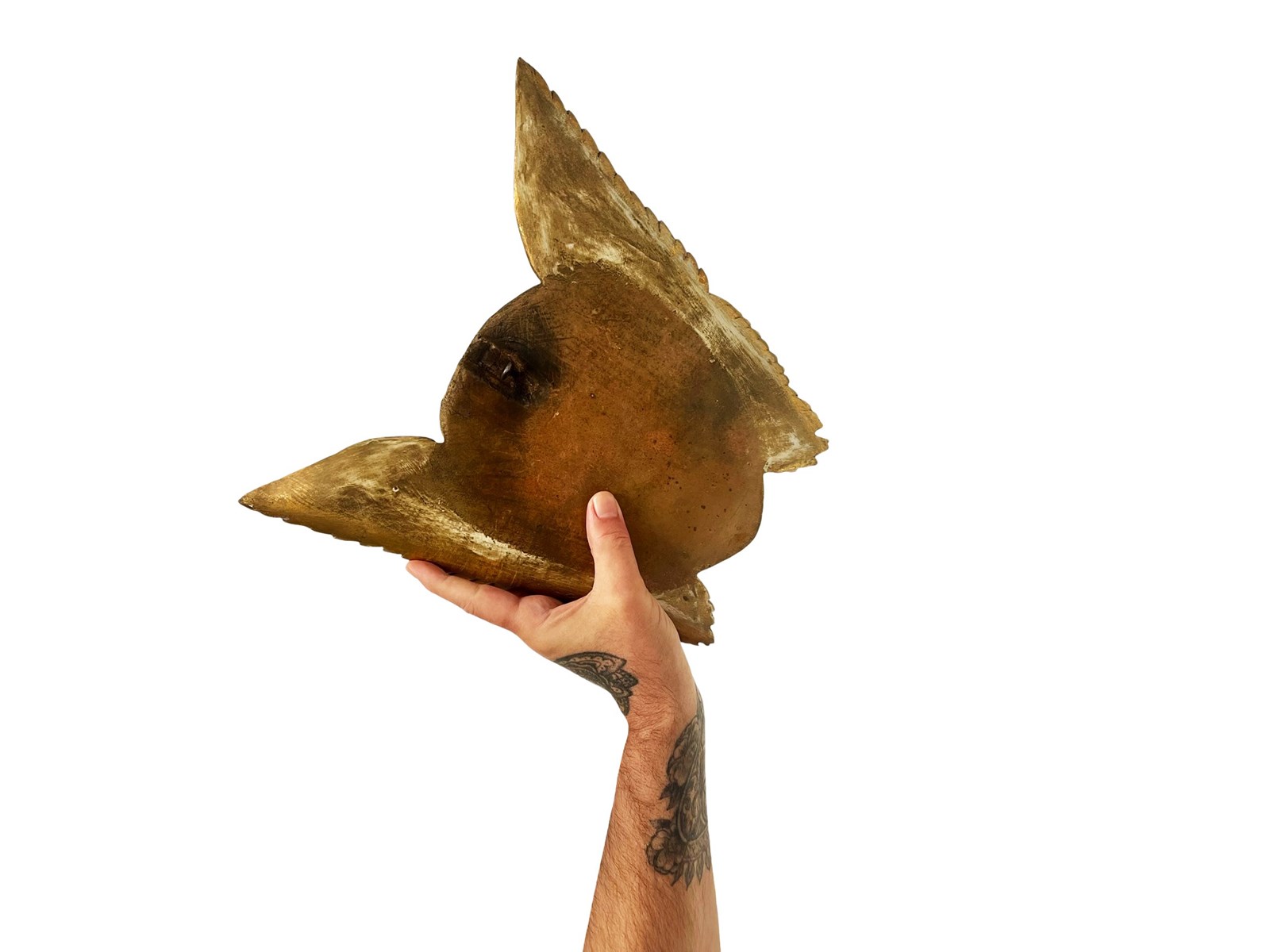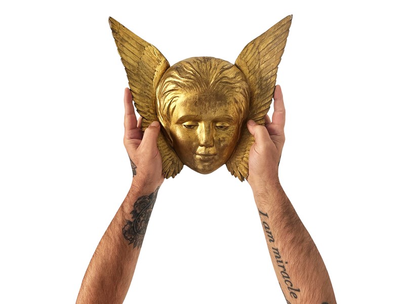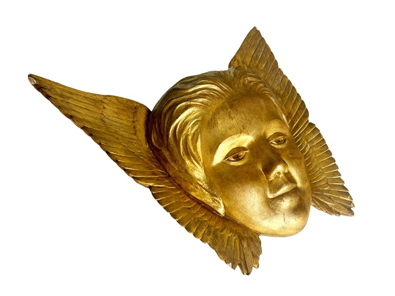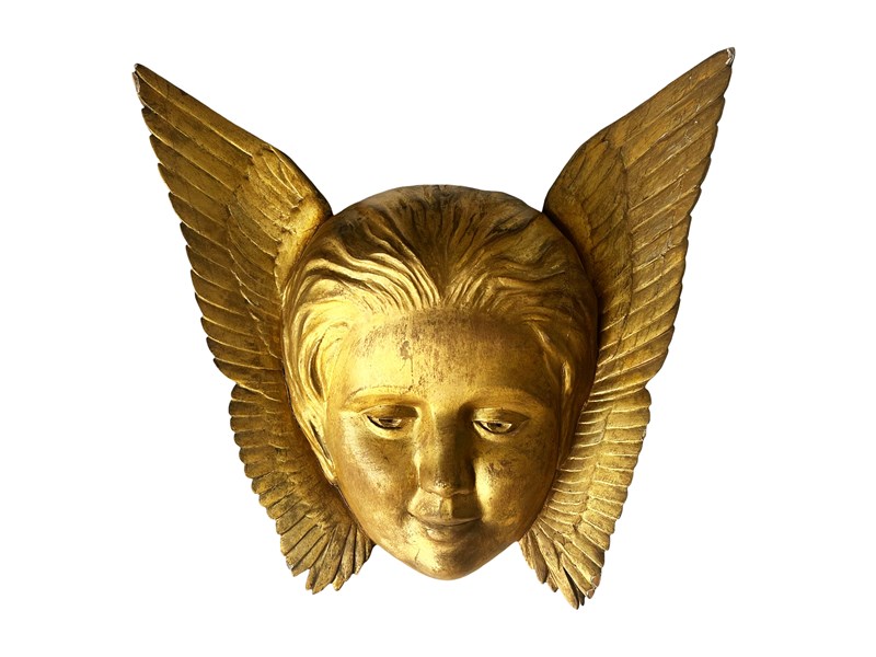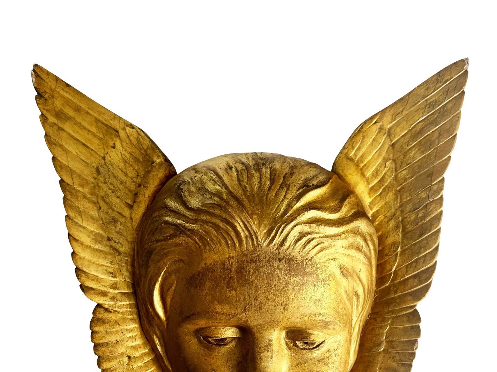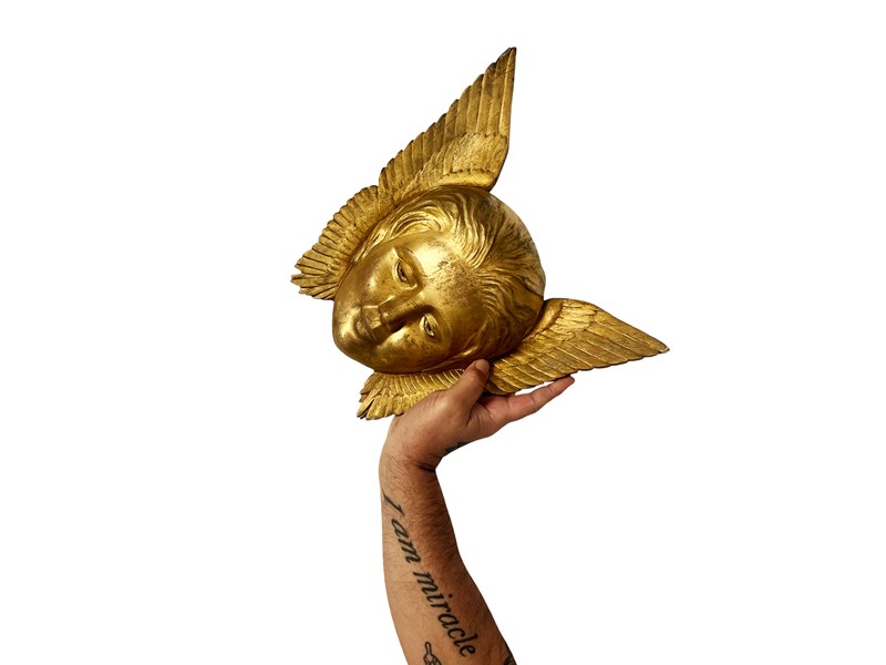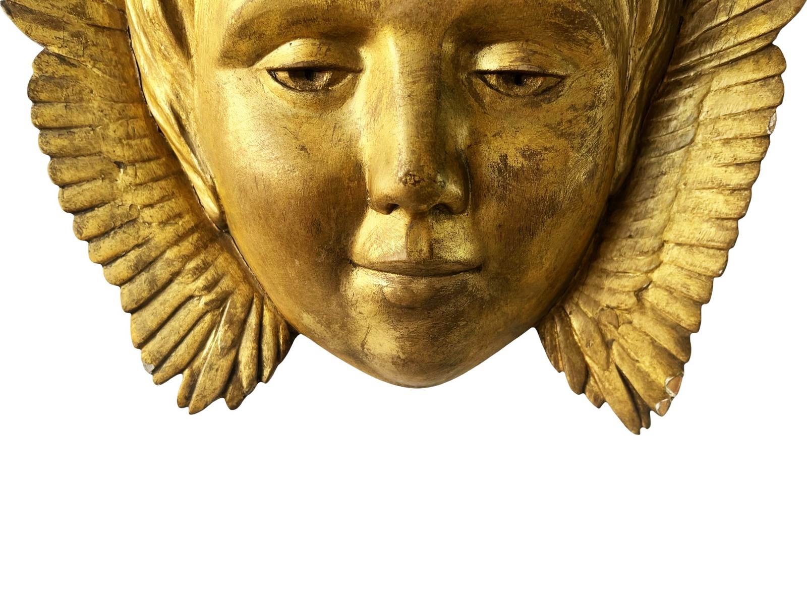 This is a wonderful antique French Angel that was discovered recently in L'Isle-sur-la-Sorgue in the South of France. This gorgeous treasure is hand carved from wood depicting a head of an angel with open wings. The wood is gilded or painted in gold. Through years some of it has flaked away creating in the process a stunning patina. It measures about 31 x 33 x 7 cm or approximately 12.2 x 12.9 x 2.7 inches and it is meant to be displayed on a wall, perhaps above a bed. It is exactly as I discovered it with signs of ageing that in my opinion only brings forth its true beauty and unique appeal today. For the full condition please refer to the images!