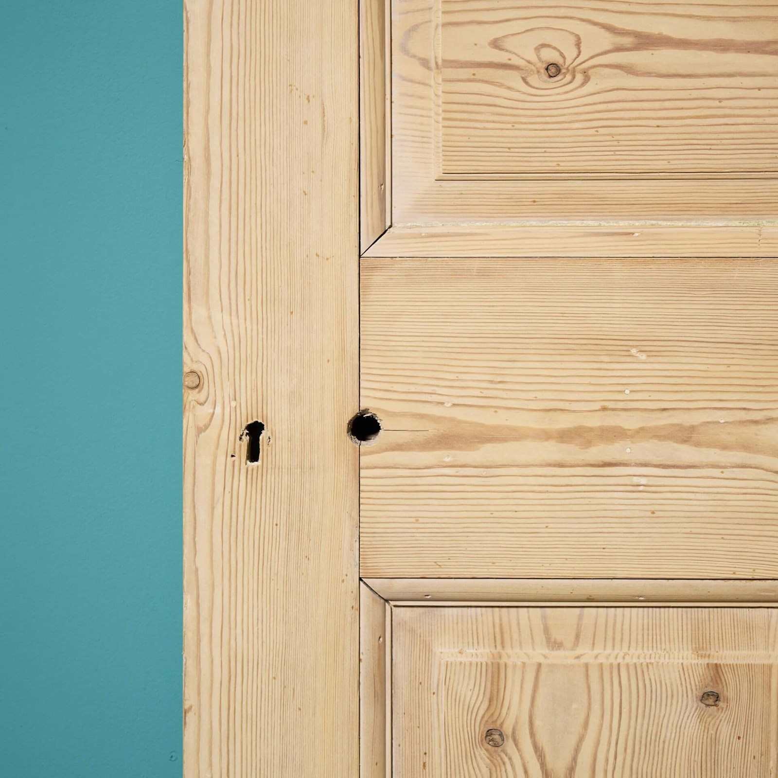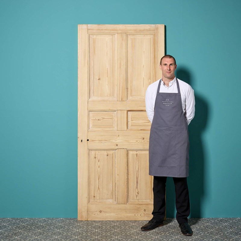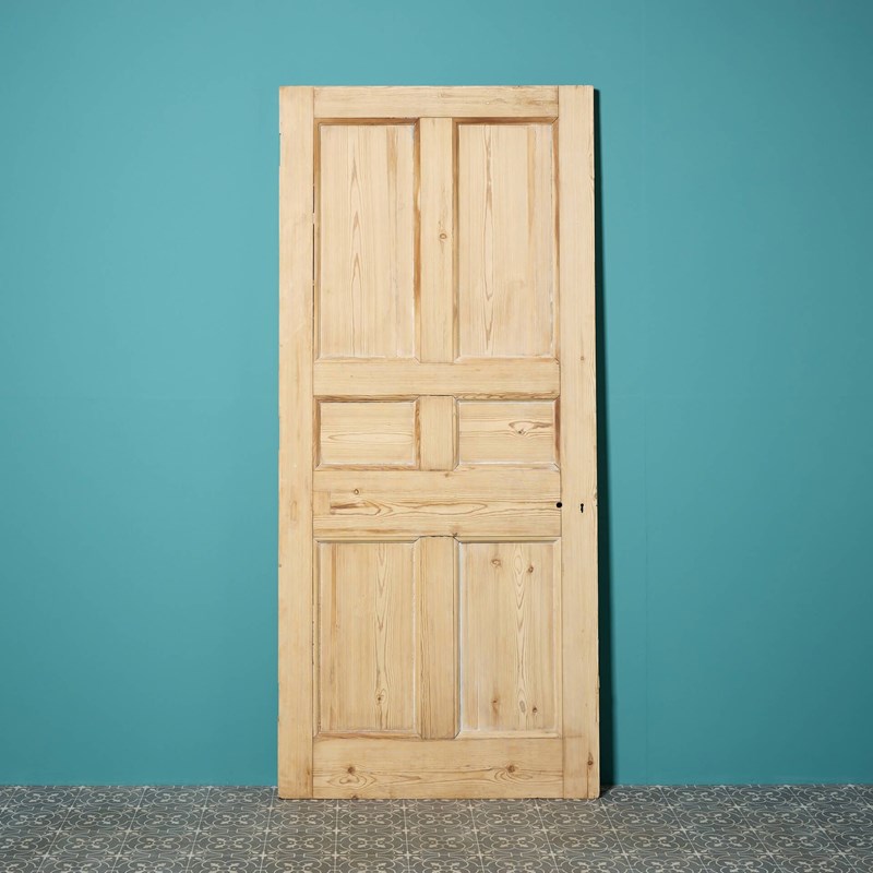 A smart mid-19th century reclaimed pine internal door in the Georgian style with six panels, raised and fielded to one side. Stripped and sanded, this antique pine door can be finished in paint, stain or wax to suit your interior vision.