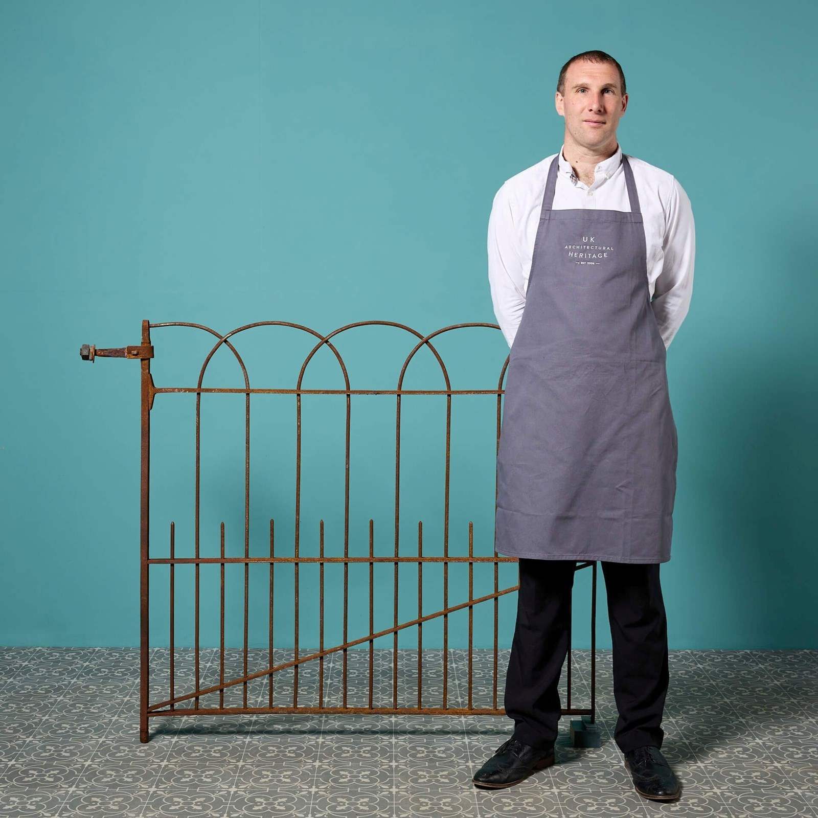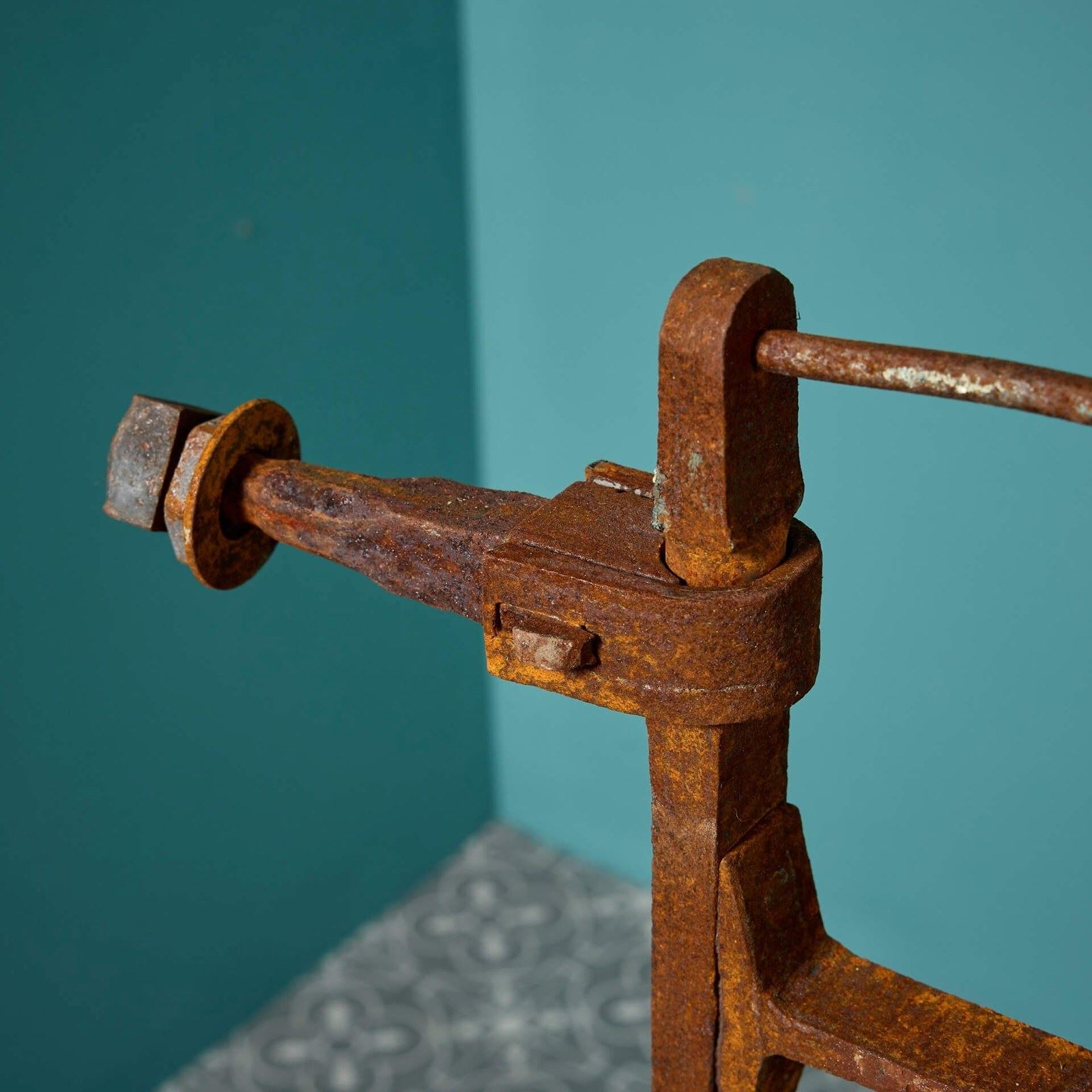 Good structural condition. Light surface rust finish. Original collar hinge. Original working latch. Supplied with replacement pivot cup for base.