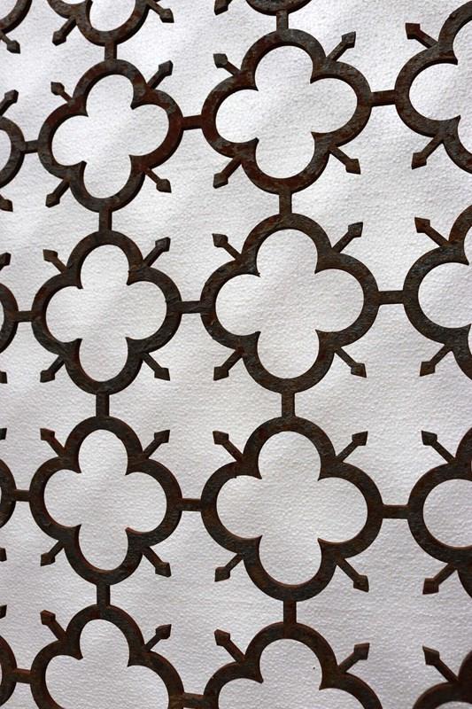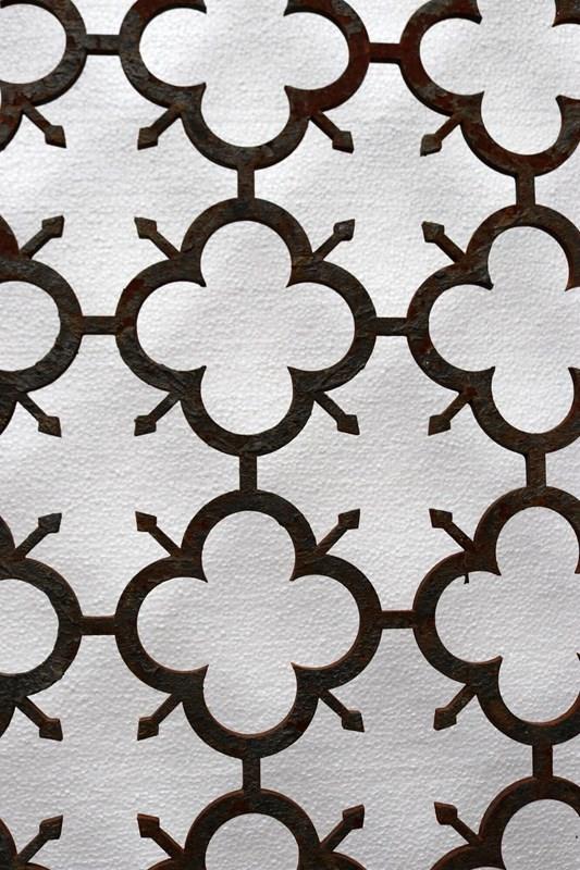 A pair of large arched metal panels, crafted in steel with a repeated quatrefoil pattern. This striking pair could be used as fixed panels within a garden scheme as decorative garden trellis panels or metal garden screens, making a distinguished impression with their openwork design and ecclesiastical style. Made in steel, they date from the late 20th century and are in excellent, strong condition, only light surface rust revealing their age. Together, the pair make for classic styling in a smart modern garden whether used as a decorative feature or a unique trellis for plants and greenery.