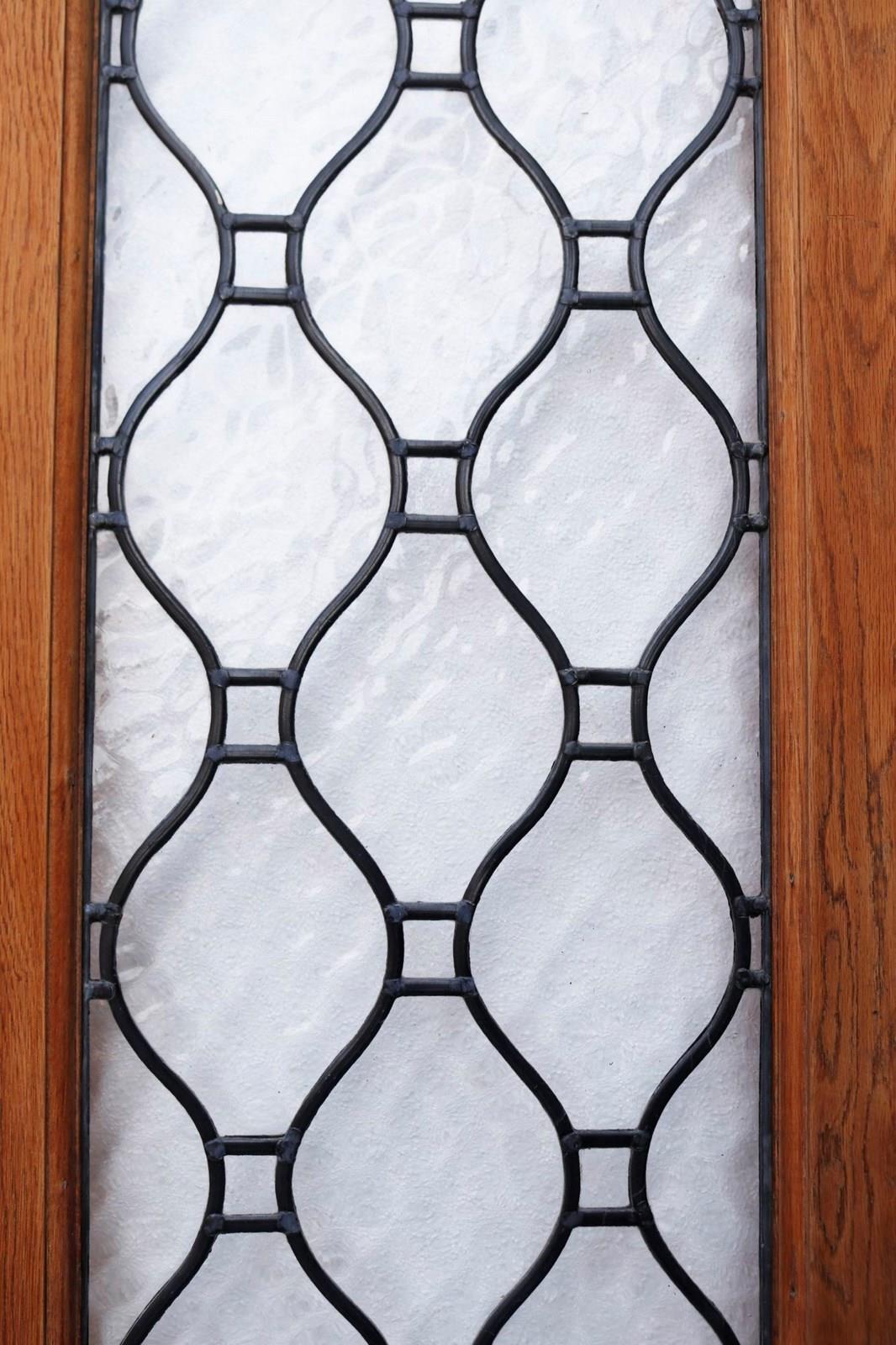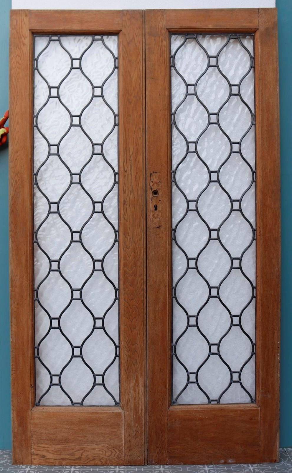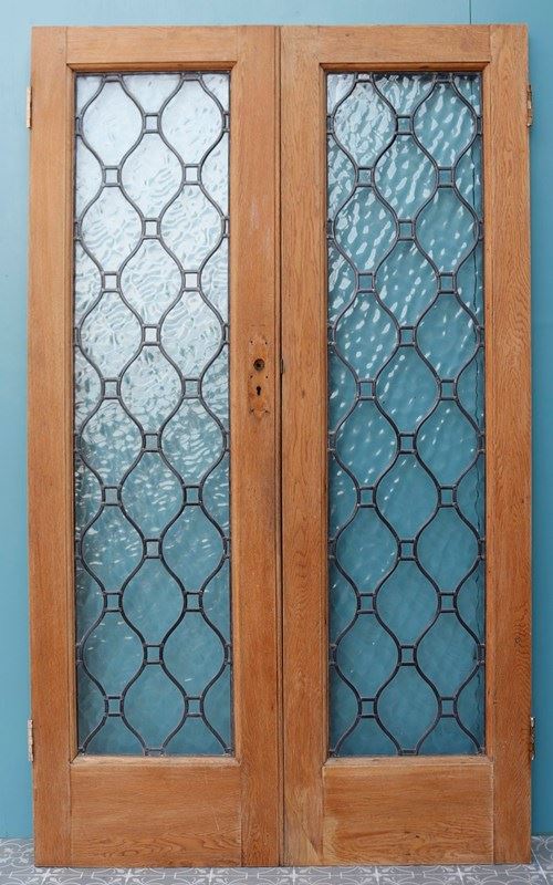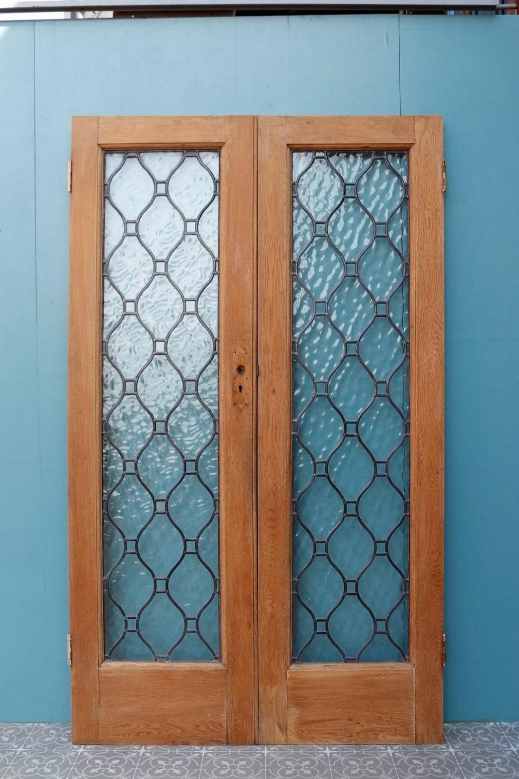 A set of Oak double doors with leaded textured glass panels. We have two sets available.