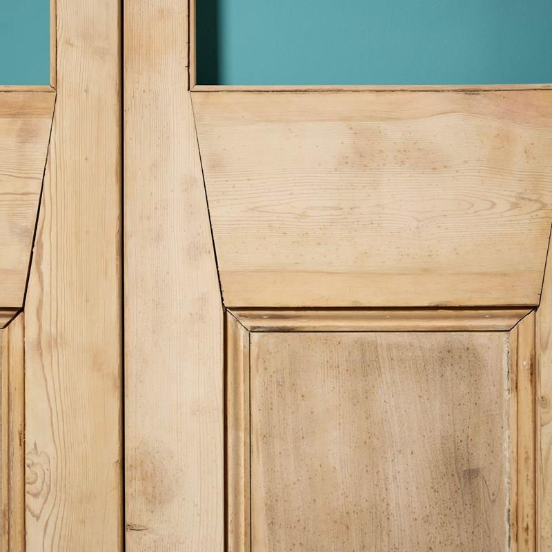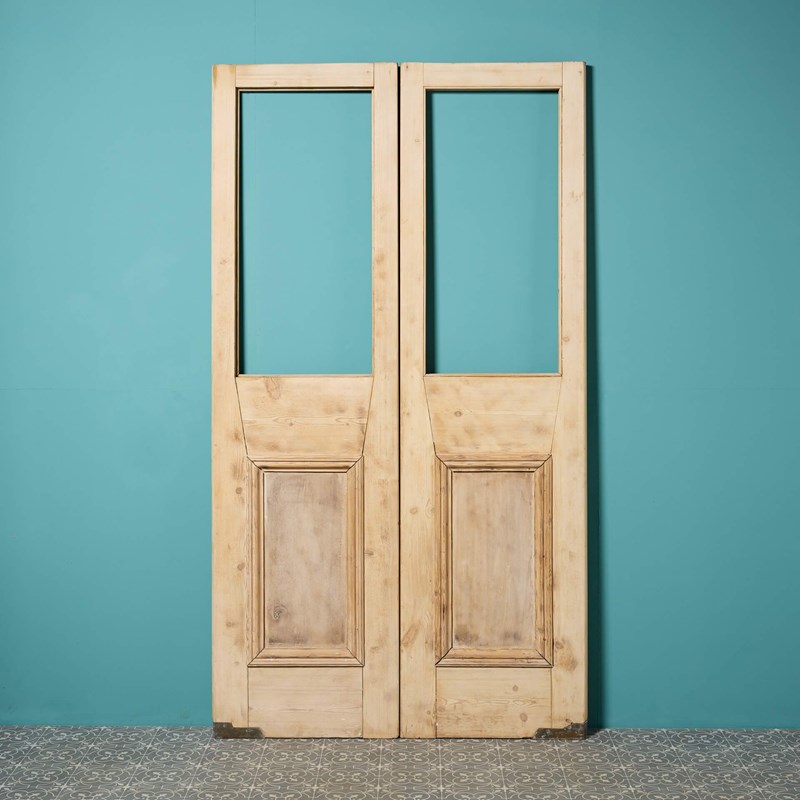 A set of unglazed antique pine double doors suitable for interior use, previously used as swing doors. Dating from the late 19th century, these reclaimed doors have two empty window panes allowing for bespoke glazing, while the stripped and sanded wood finish can be applied with paint, stain or wax to suit your interior vision.