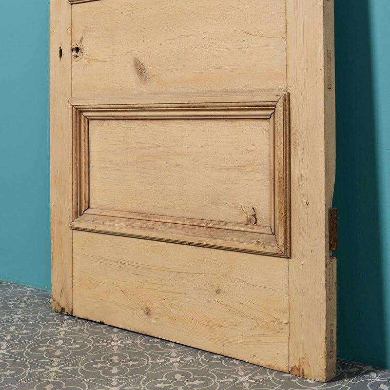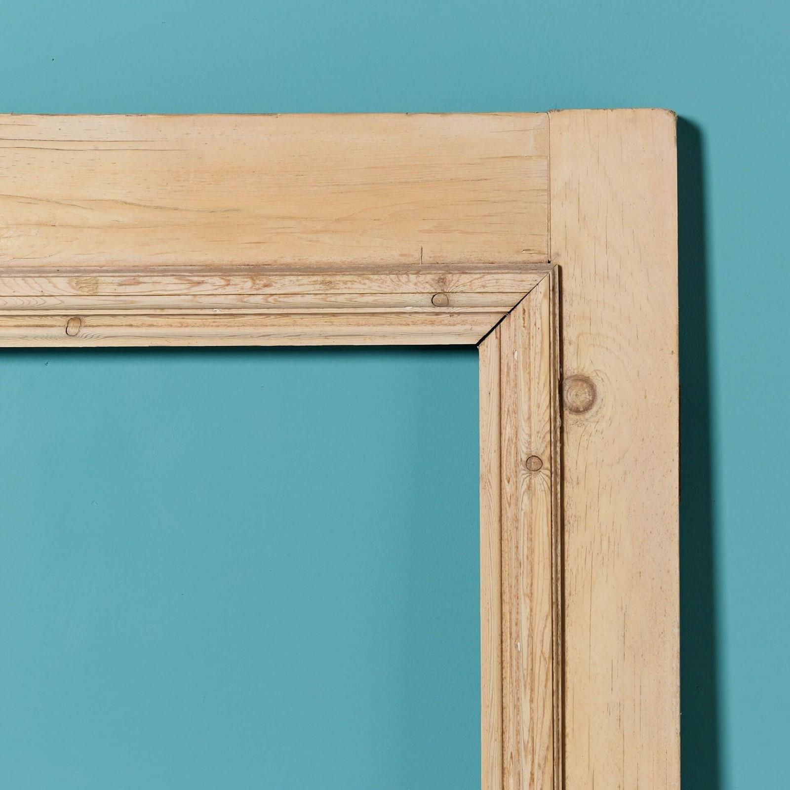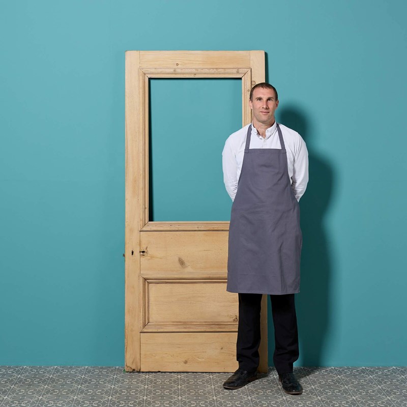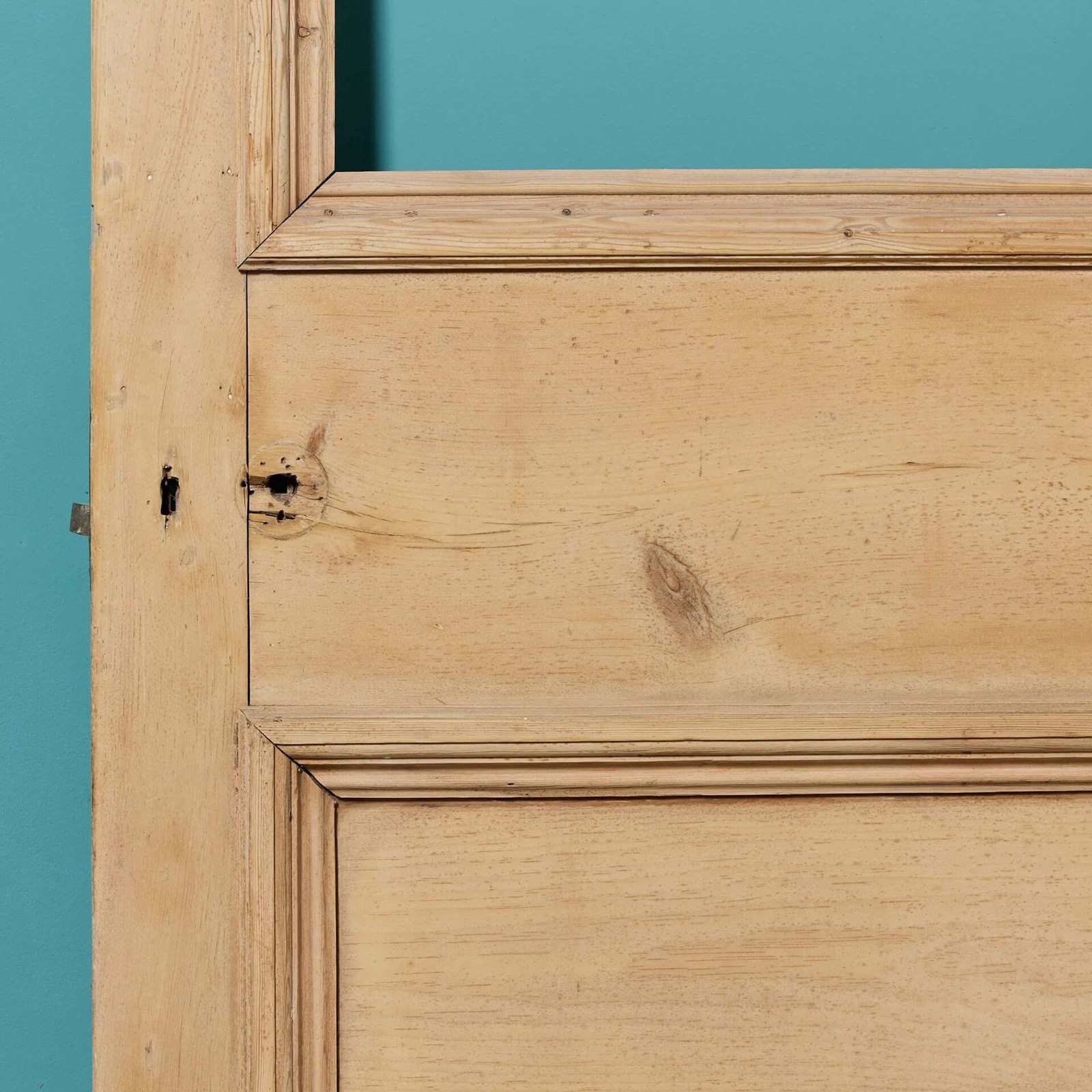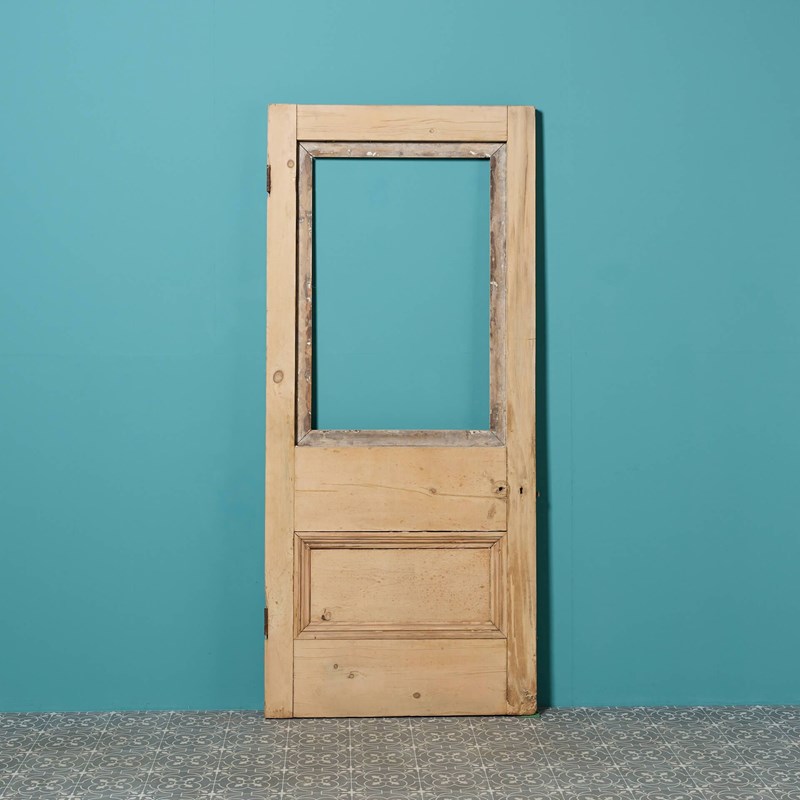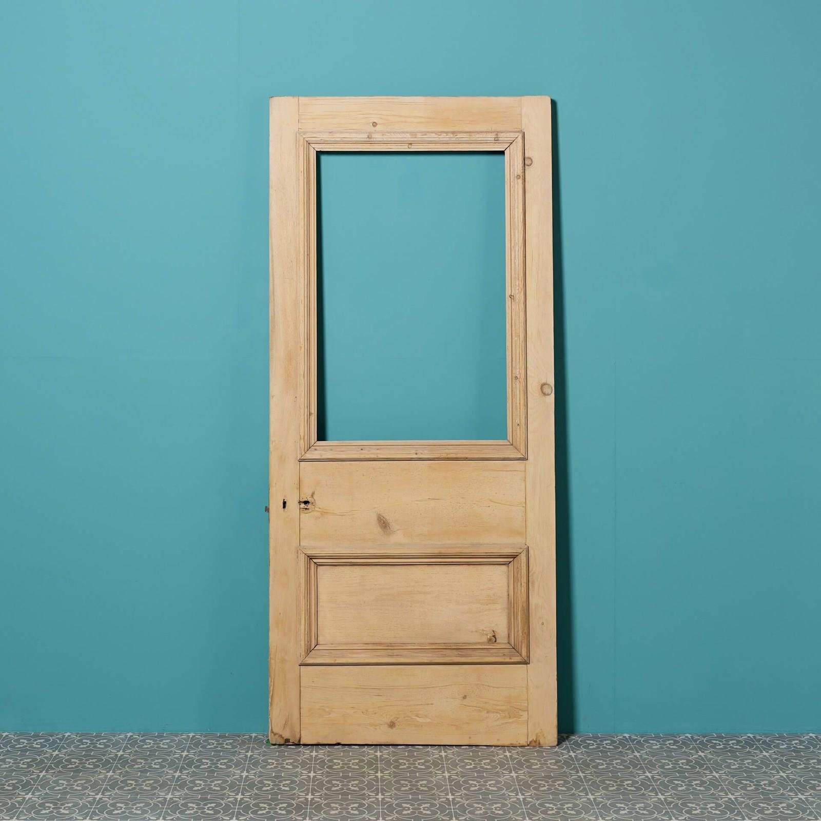 A smart unglazed antique pine front door dating from the late 19th century. This reclaimed door has a large empty pane, ready for fitting with glass, above a moulded panel with a sanded finish, ready for paint, stain or wax as desired.
