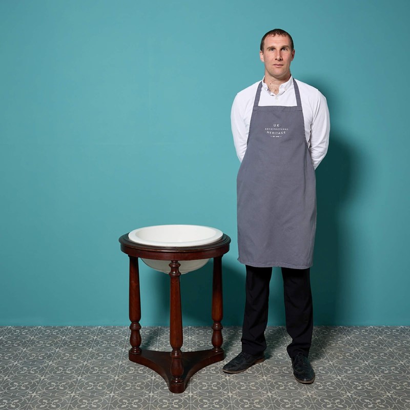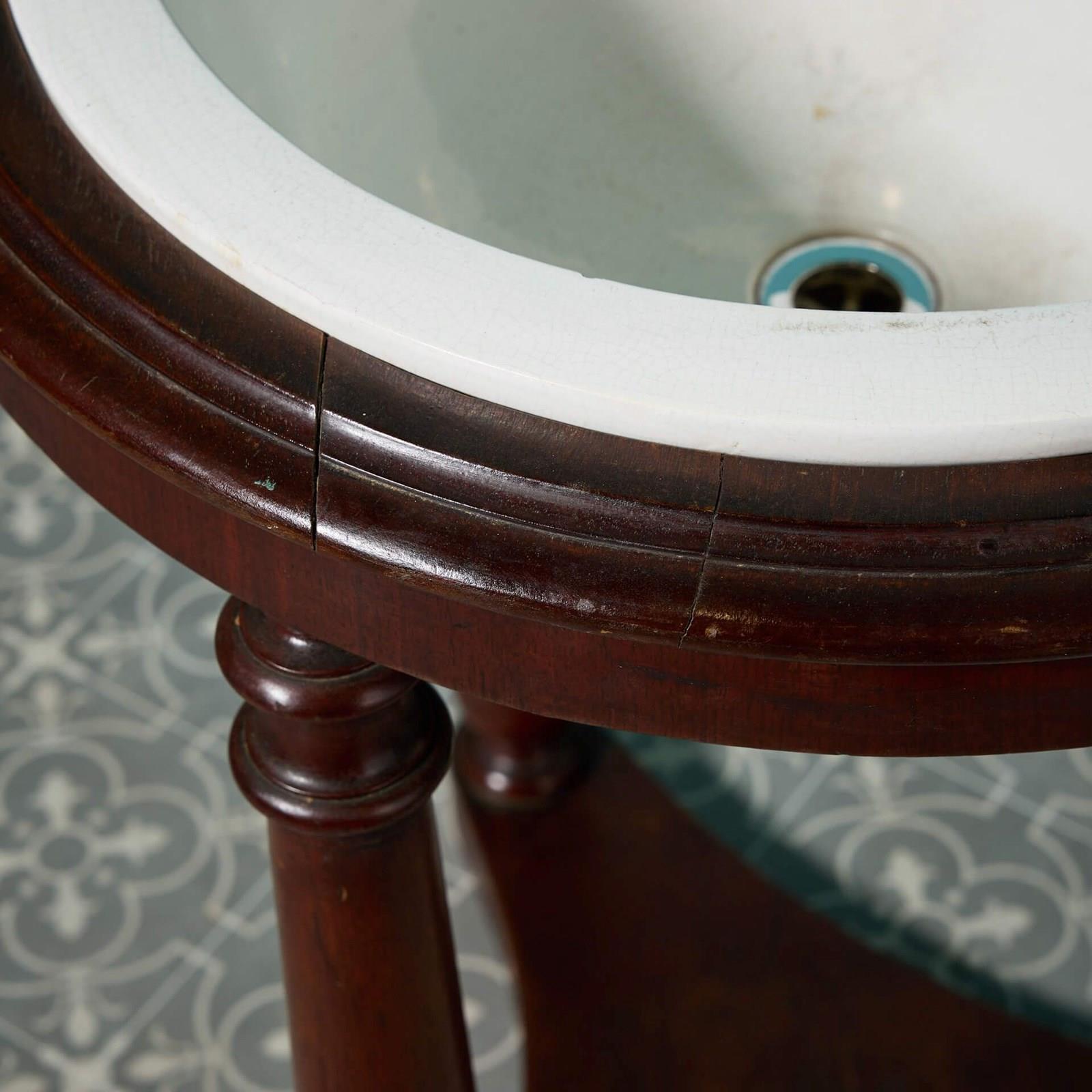 Good structural condition. There are some superficial marks to the basin. One hairline crack. There are no cracks to the basin but there are some minor chips and crazing. The basin and stand come in two parts. Mahogany stand with some light wear. This unit would look very smart when fitted with a nickel waste pipe.