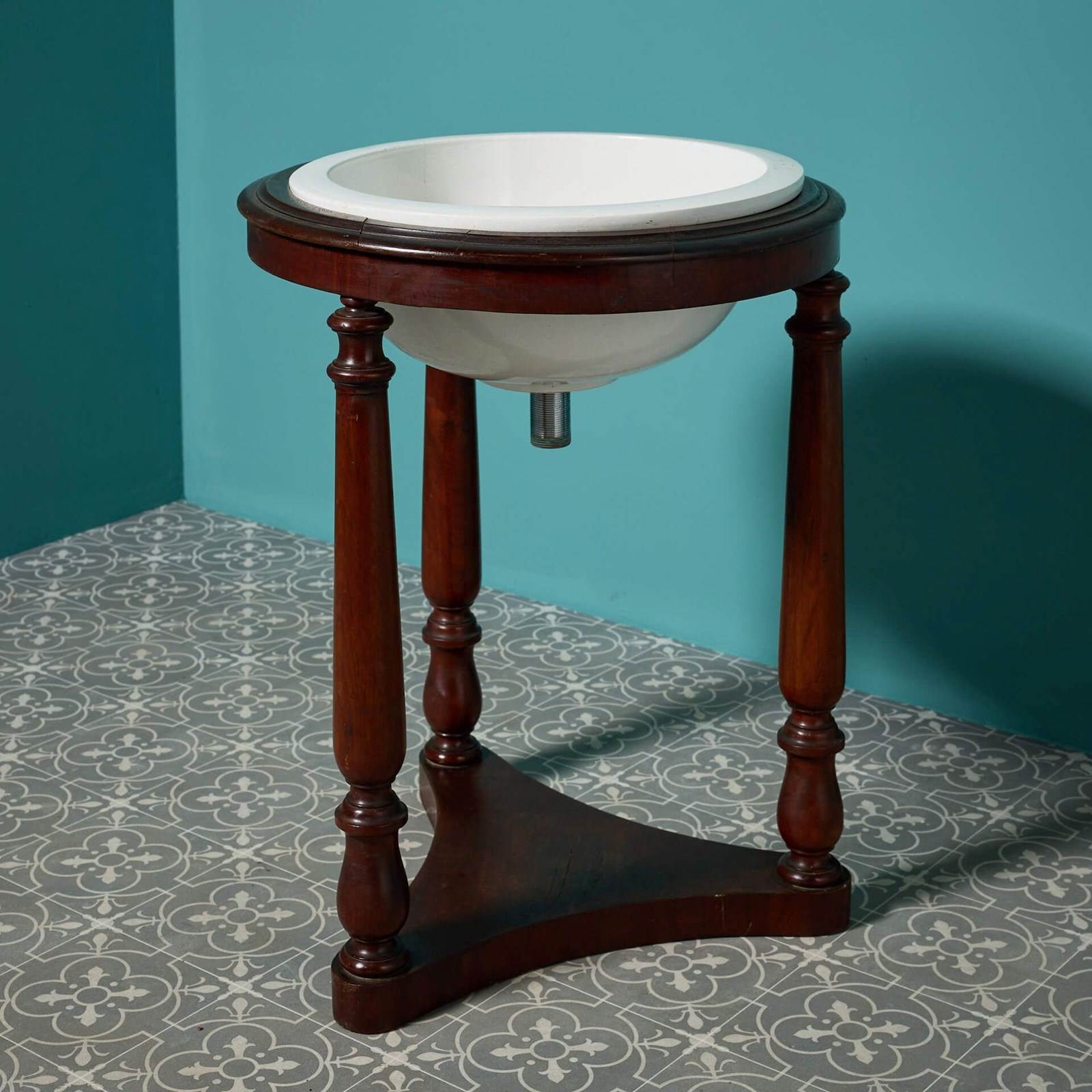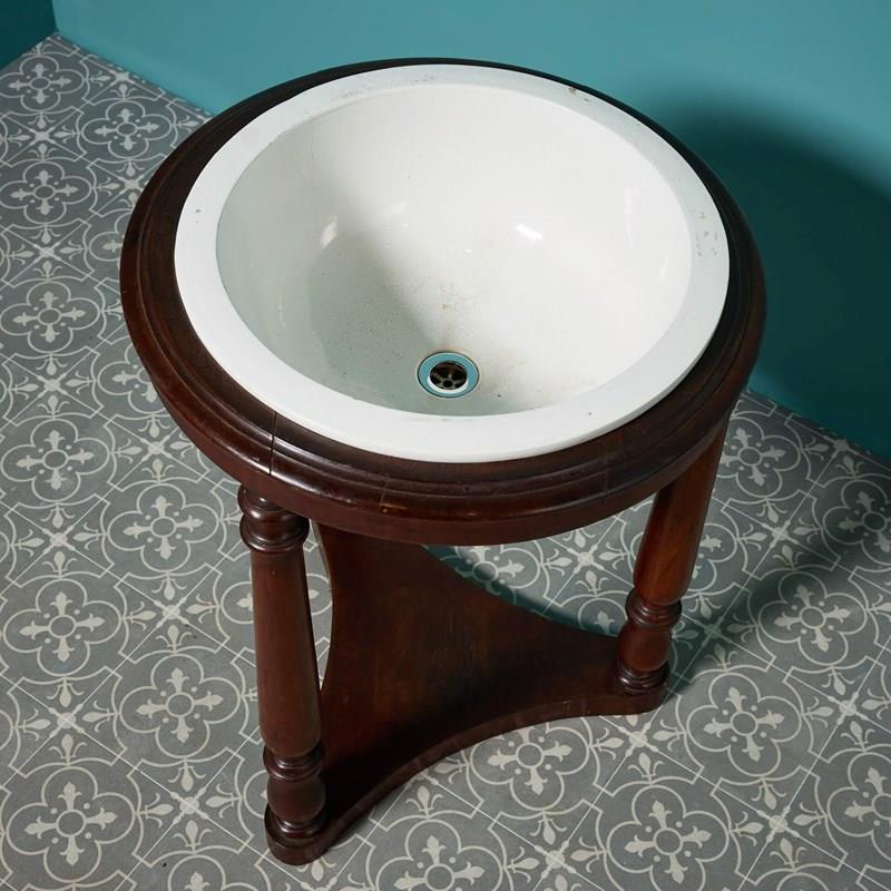 This large sink has a simple yet elegant white porcelain basin held on a striking mahogany one tier triform base with original fittings.