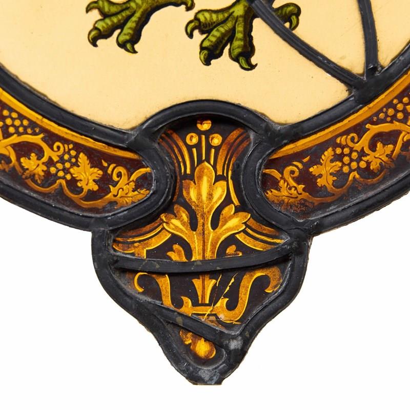An armorial stained glass panel depicting the vivid scene of a beastly dragon.