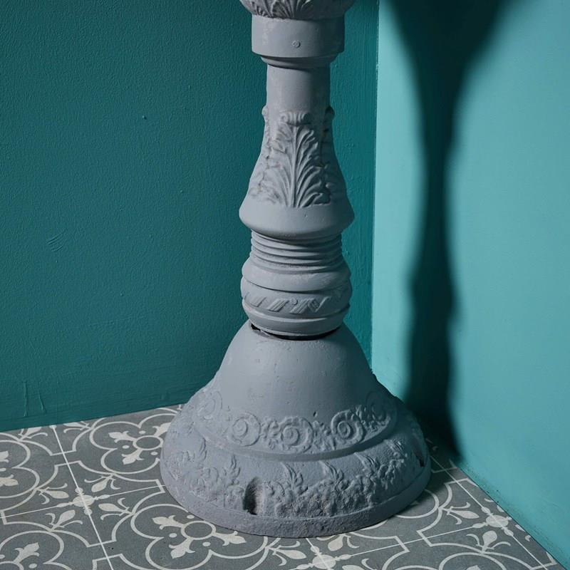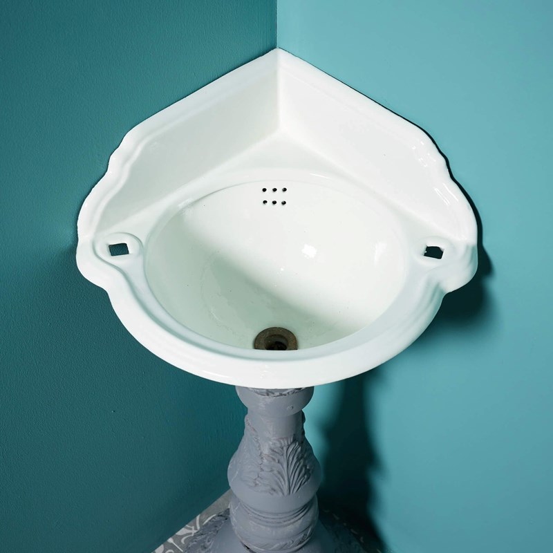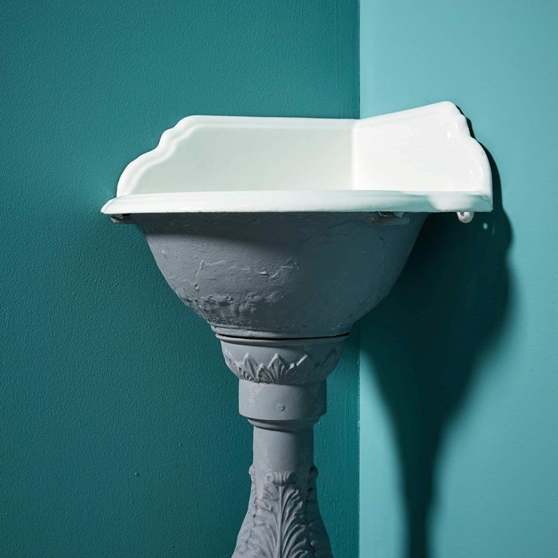 Produced in the late 19th century, this reclaimed corner sink sees a ceramic basin elevated on a cast iron pedestal, beautifully decorated with classical leaves. With an air of elegance, it will look stunning as a heritage feature of a Victorian ensuite or country cottage cloakroom.