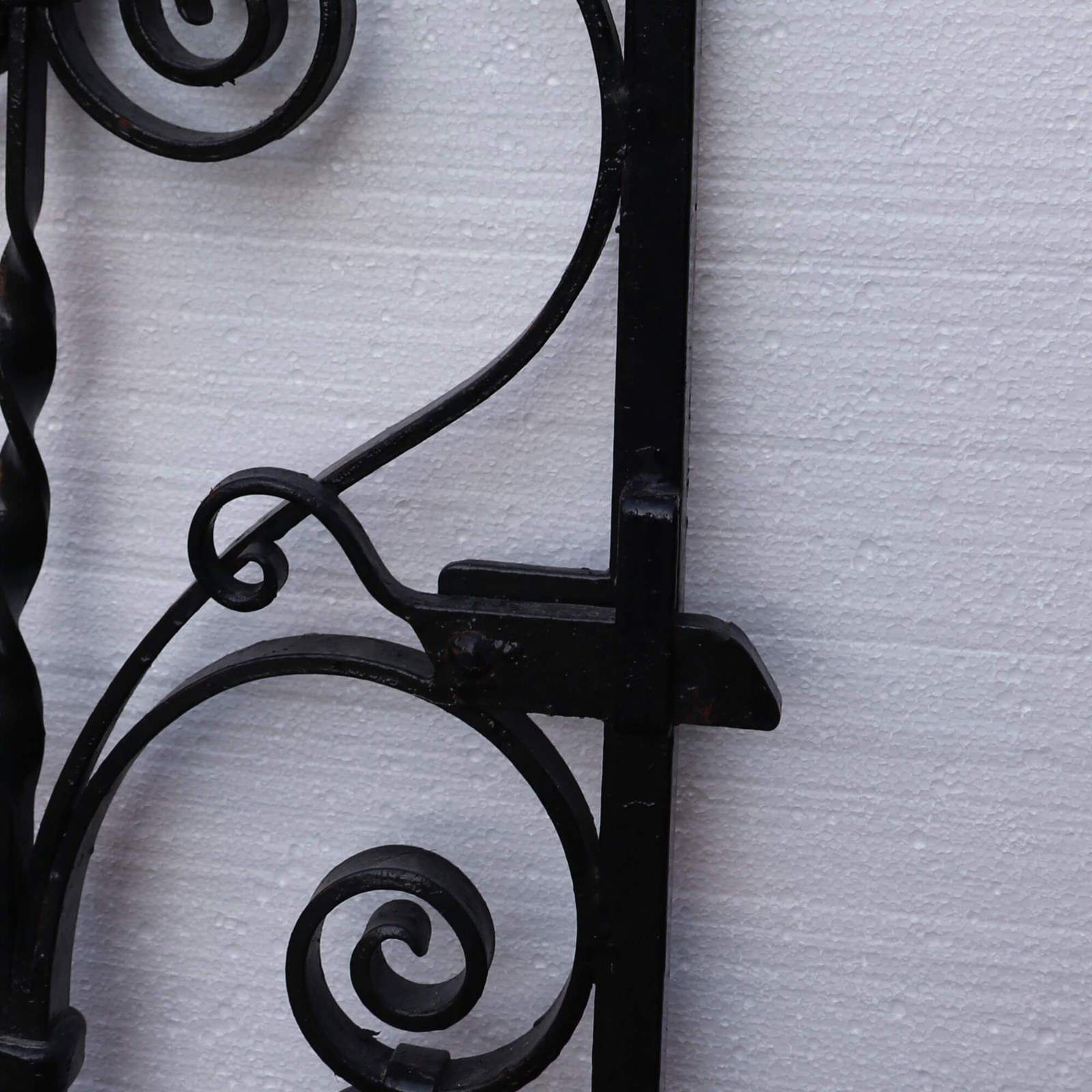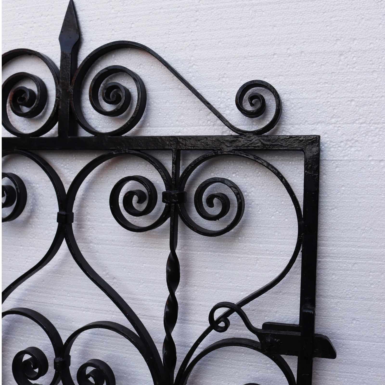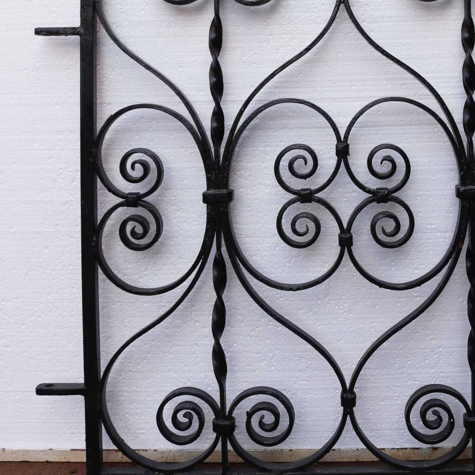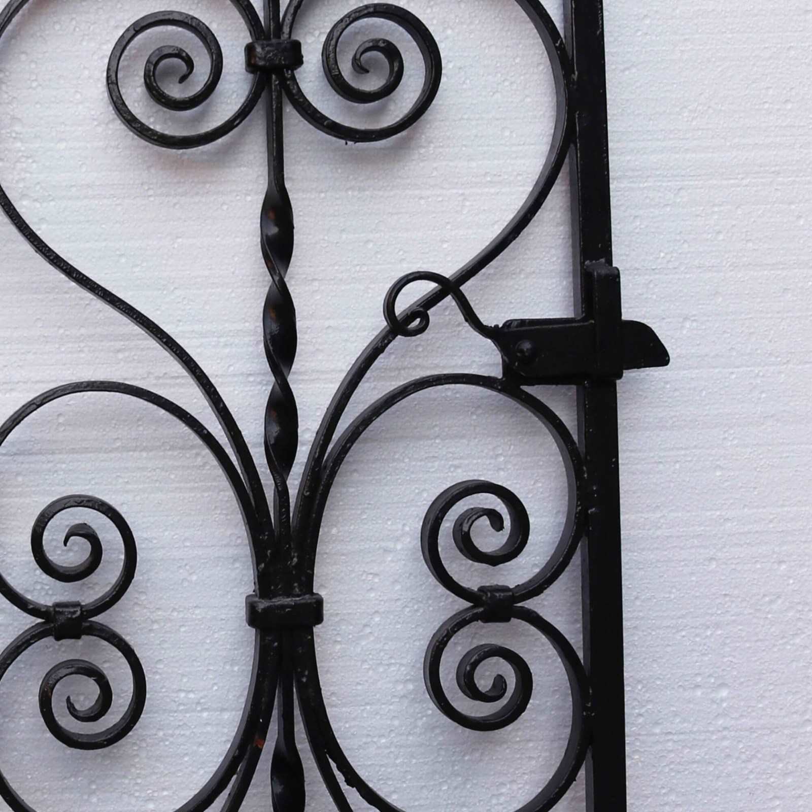 Antique Edwardian scrollwork side gate. Ready to hold pride of place outside any home, its English 1930s heritage will continue to shine with its original working latch, modern hinges and no need for extra restoration. Time has been kind to this gate as it remains in good decorative and structural condition. The scrolls throughout its middle and along its top, as well as its crisp black colour, give it a classic, stylish finish.