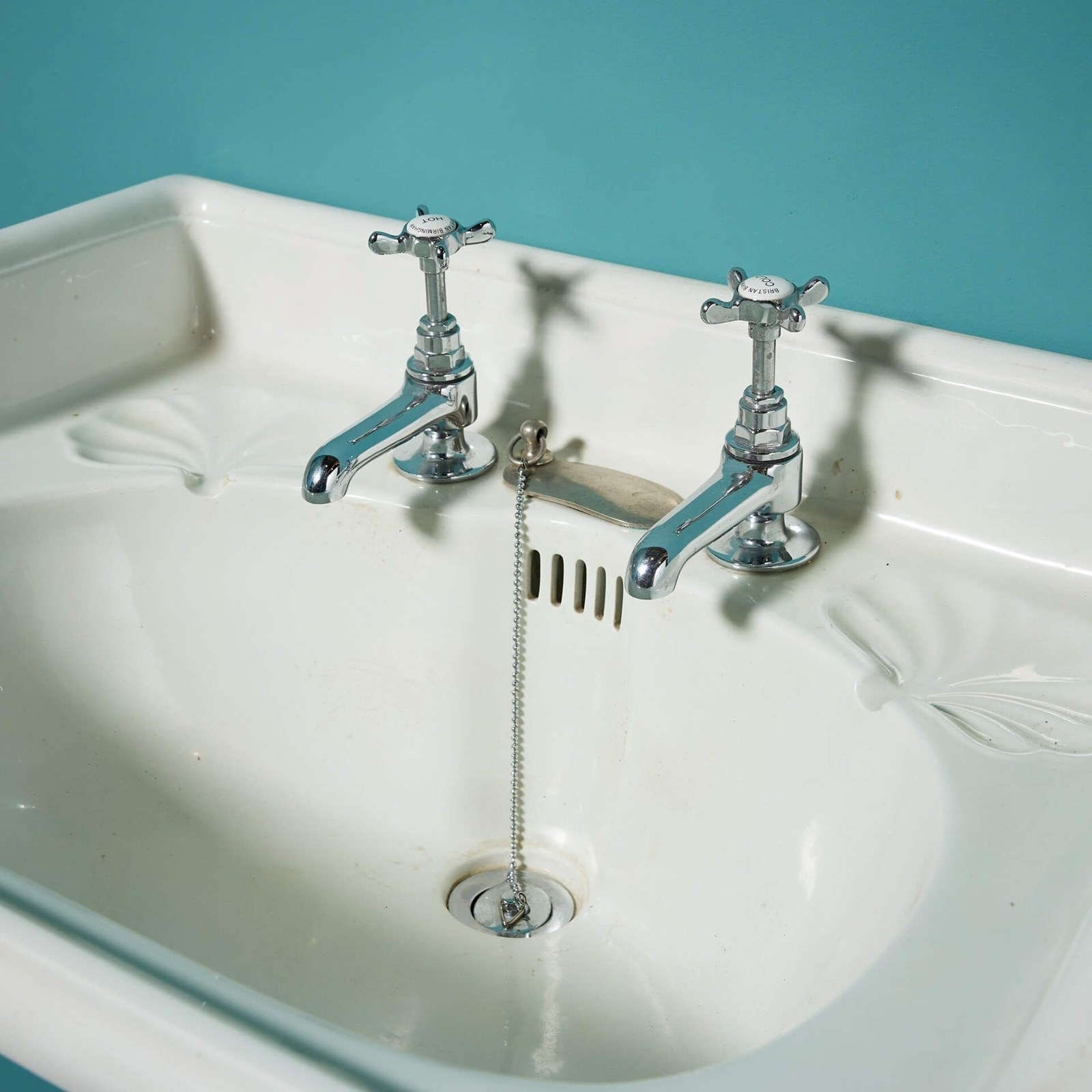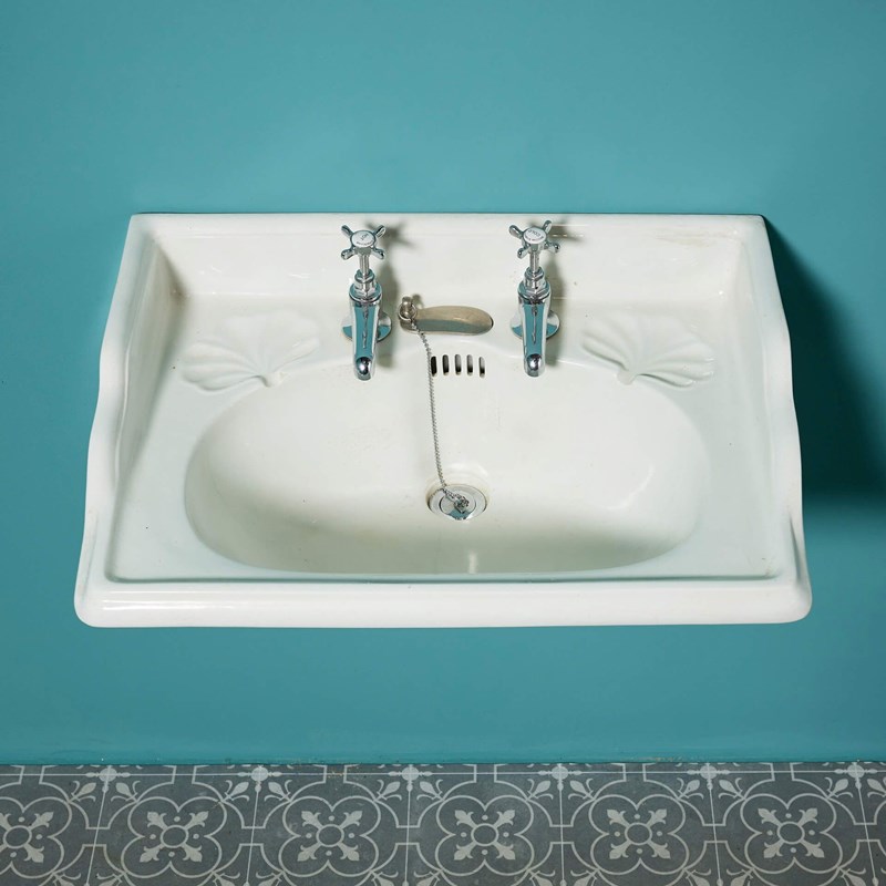 A classic early 20th century antique Edwardian style ceramic sink with modern, traditional style taps and silvered cast iron bracket for affixing to a wall. This reclaimed basin will make an elegant sink in a vintage-inspired bathroom as well as a period ensuite or cloakroom, complete with beautiful leaf-shaped soap dishes.