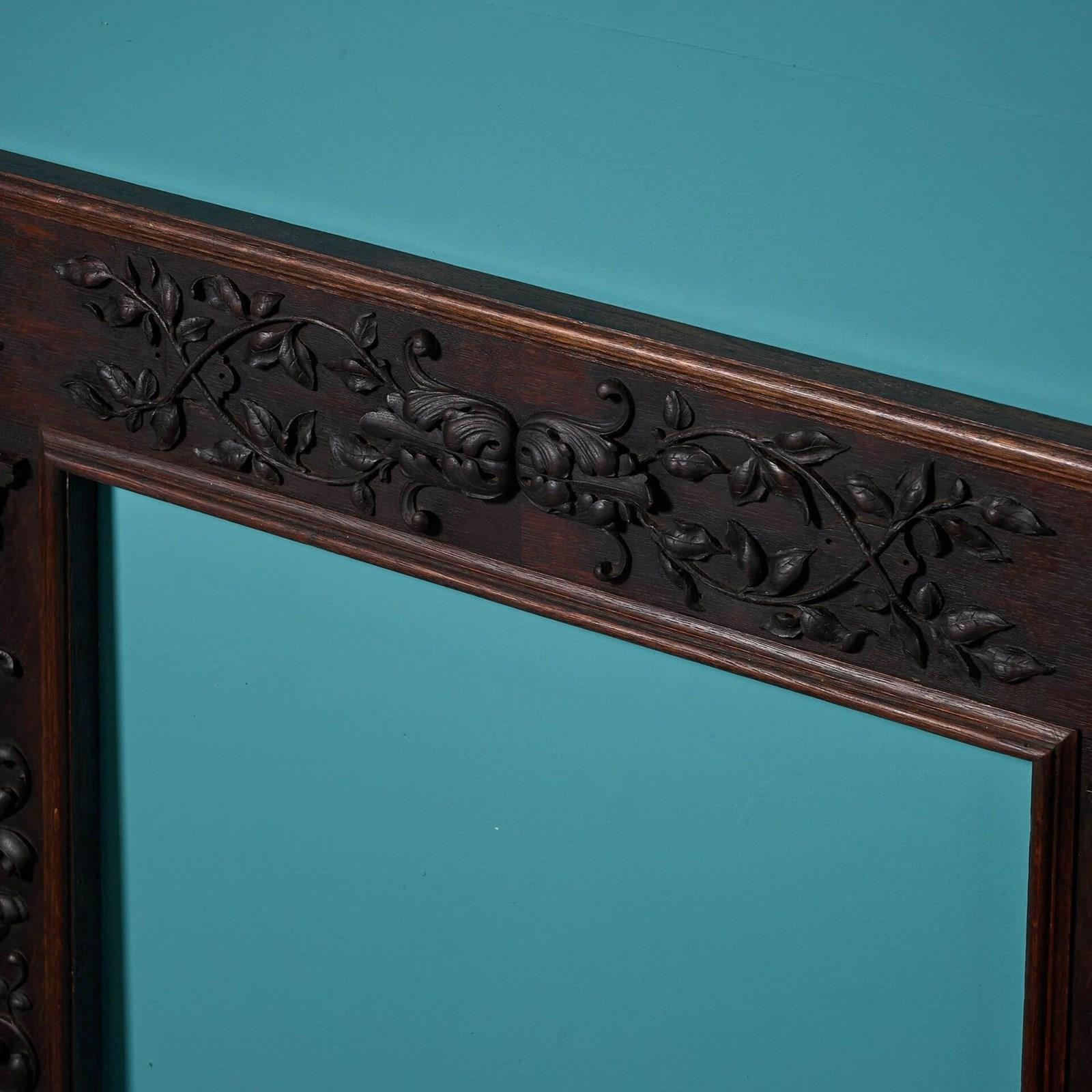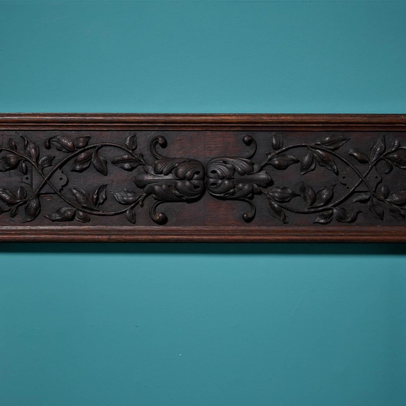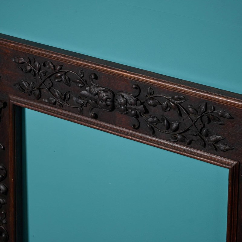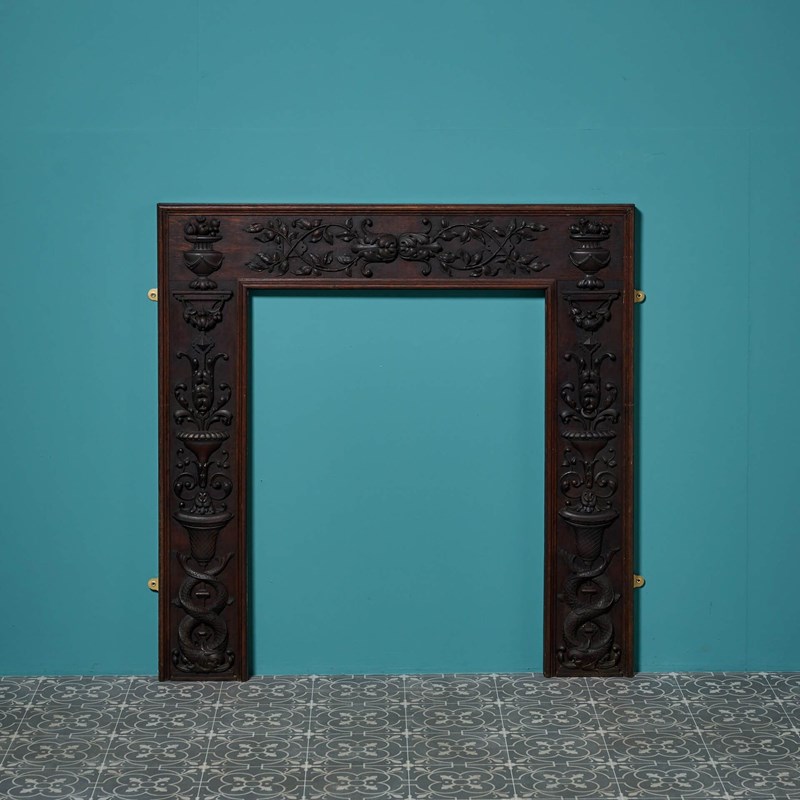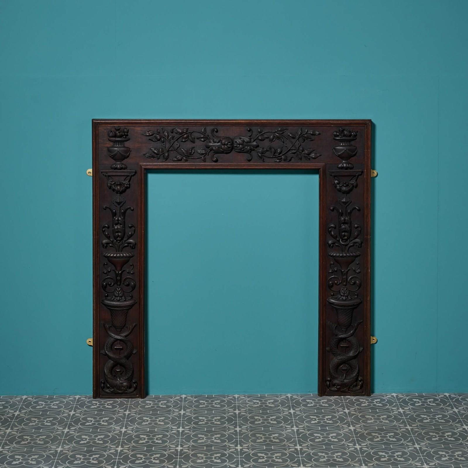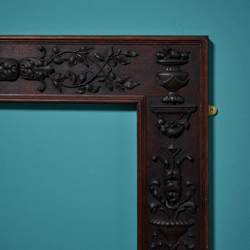 An antique English neoclassical/Georgian style carved oak fireplace. Finely detailed, with intricate hand carved scrolling designs.