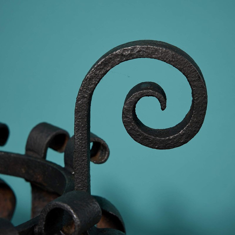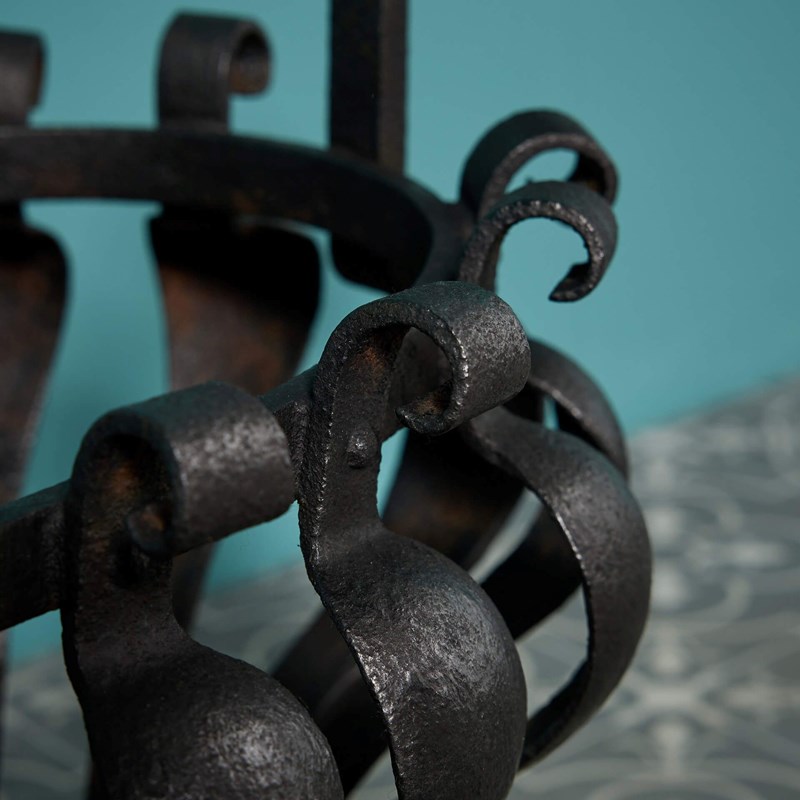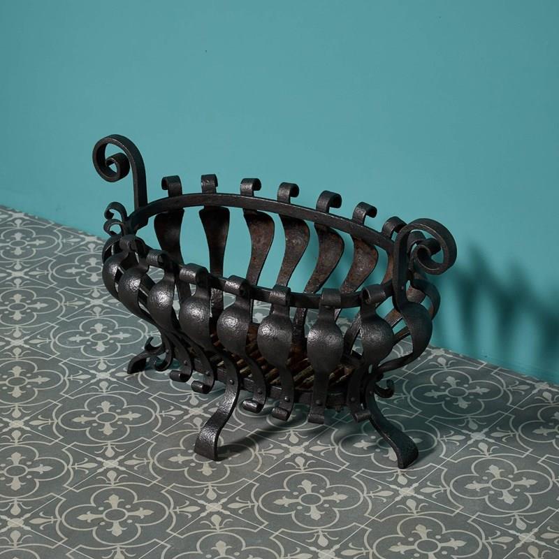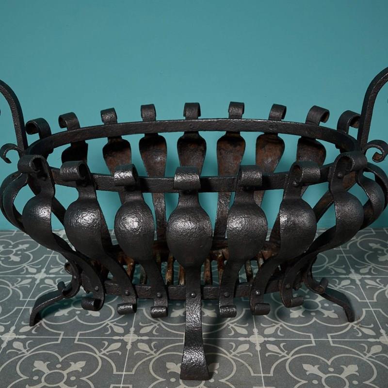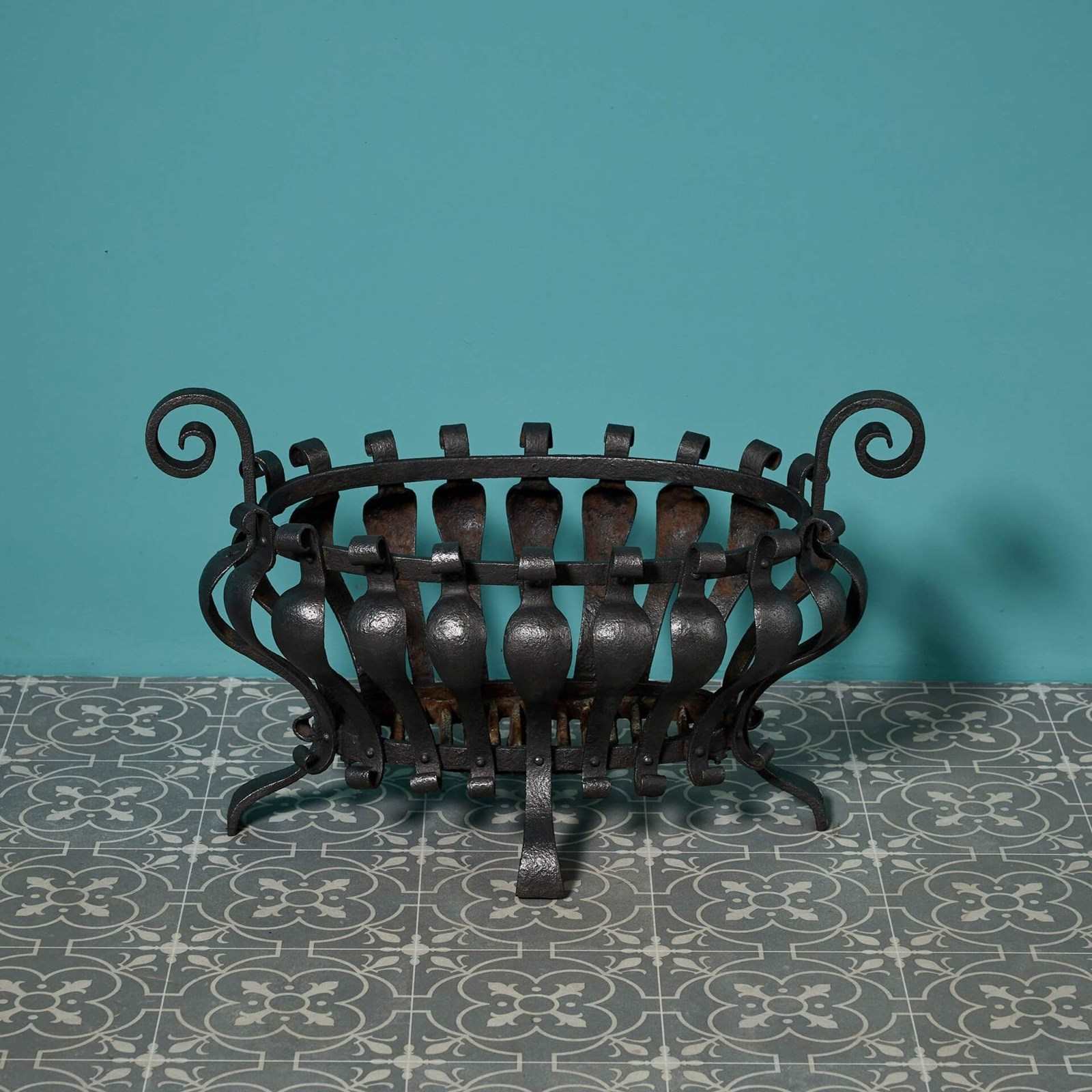A beautiful antique English oval scrolling fire basket, circa 1880. Crafted at the hand of a talented 19th century blacksmith, this wrought iron fire grate is a character addition to any fireplace with its bulbous form and timeless scrolls.