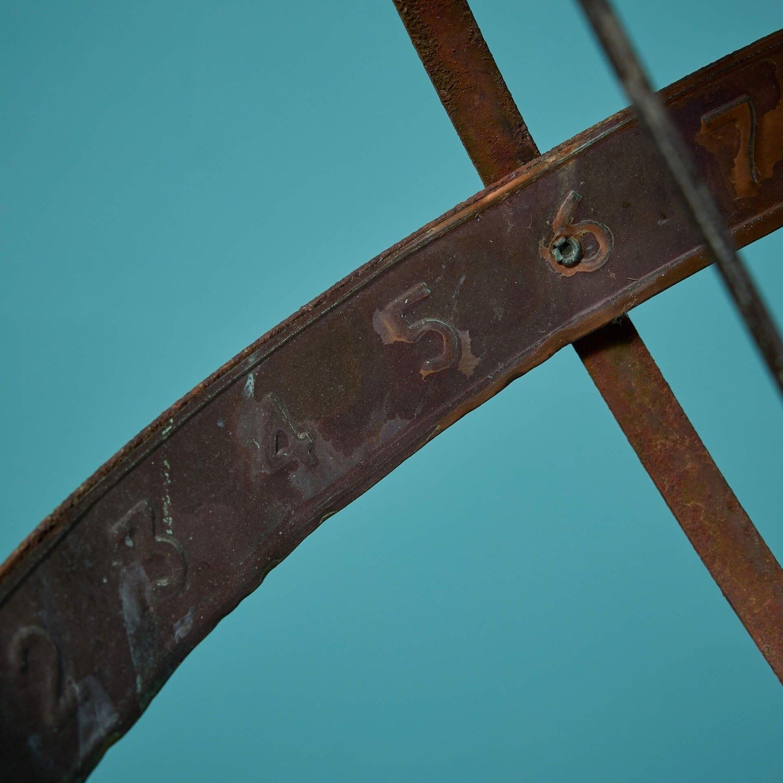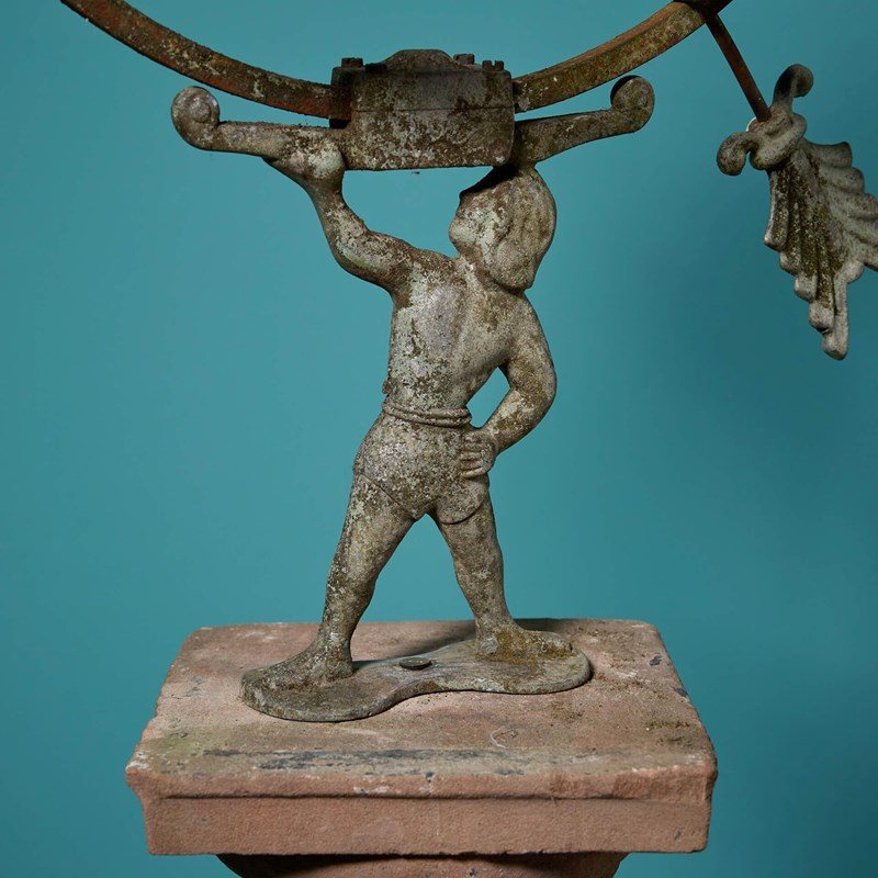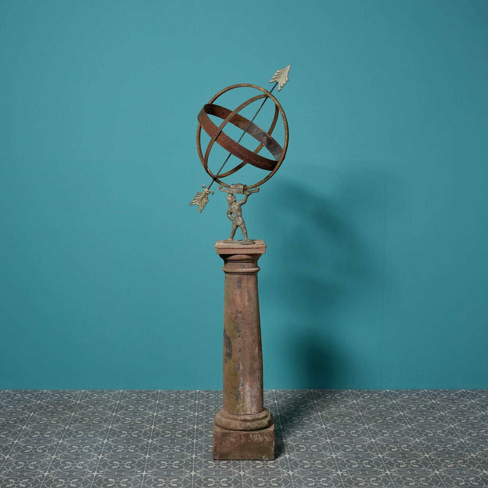 Certain to look stunning at the centre of a courtyard, the steel sundial features a small patinated bronze figure holding up the sphere, lifting it towards the heavens with the strength of just one hand.
