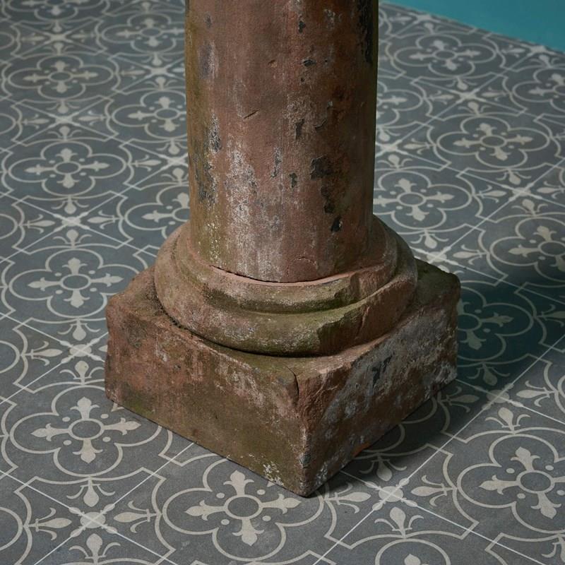 A striking antique Georgian style armillary sundial featuring an unusual 20th century armillary sphere mounted upon a beautifully weathered Georgian era red sandstone column plinth.