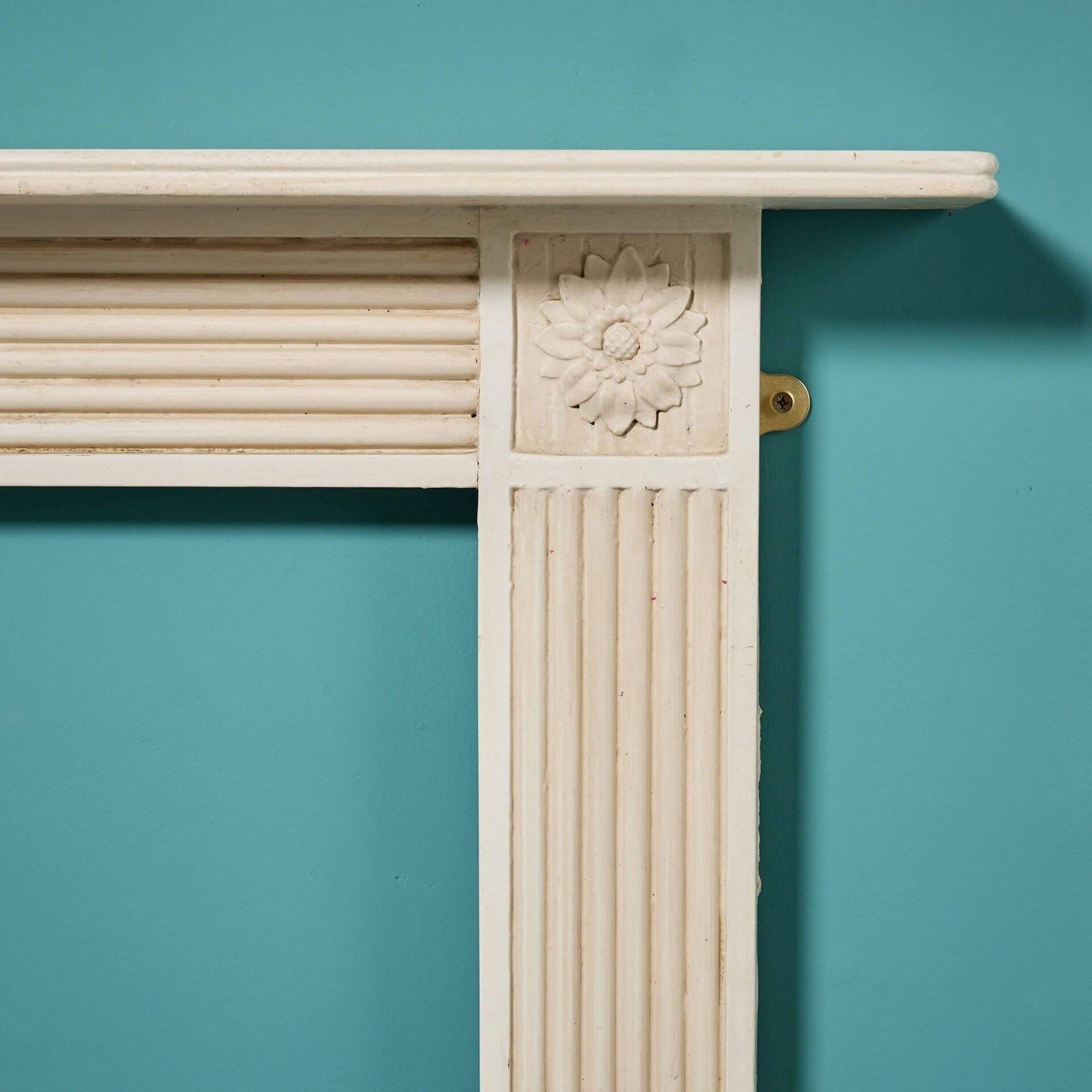 An antique Georgian style painted pine fire surround, carved with flower ‘bullseye’ roundels to the end blocks, reclaimed from a property in south-east England.