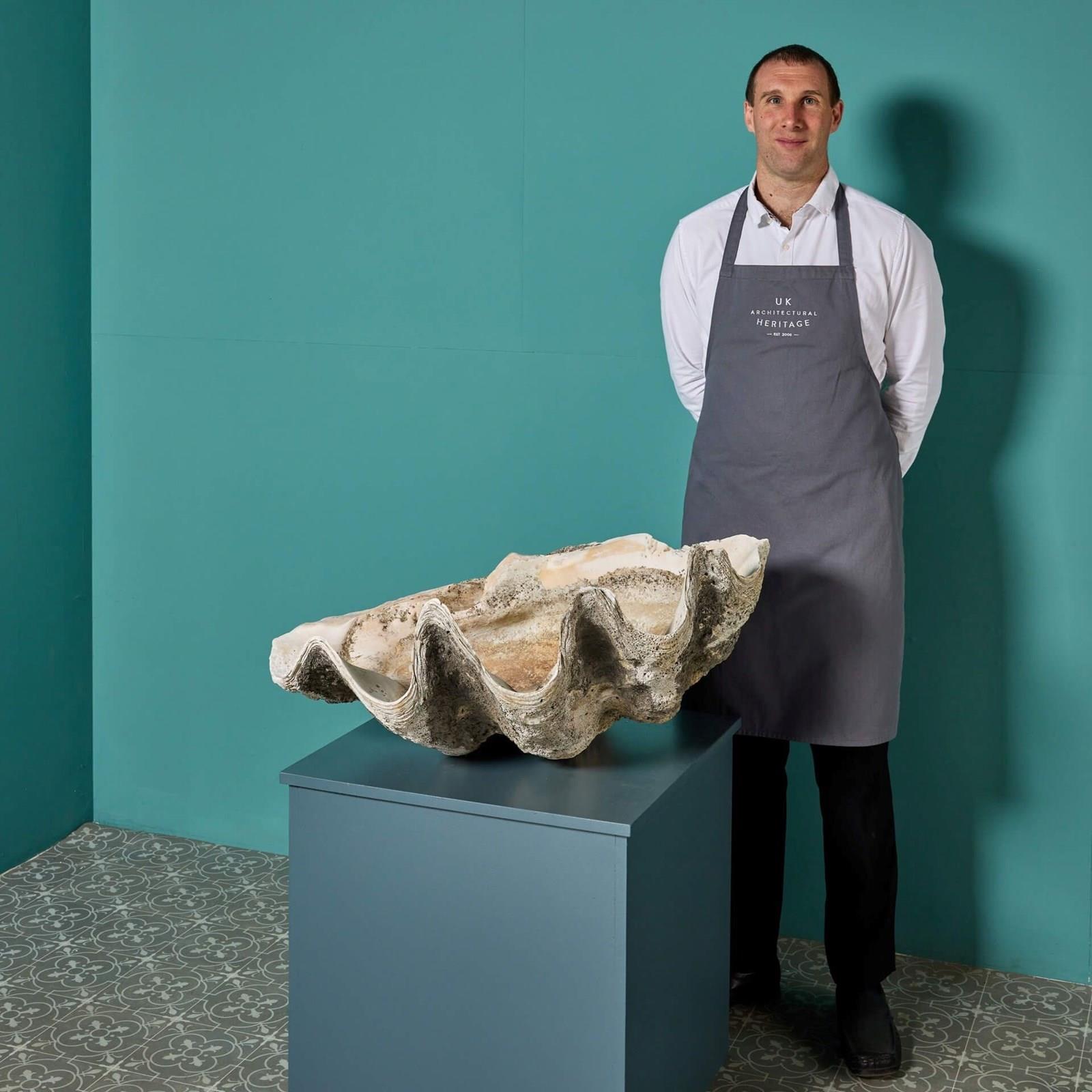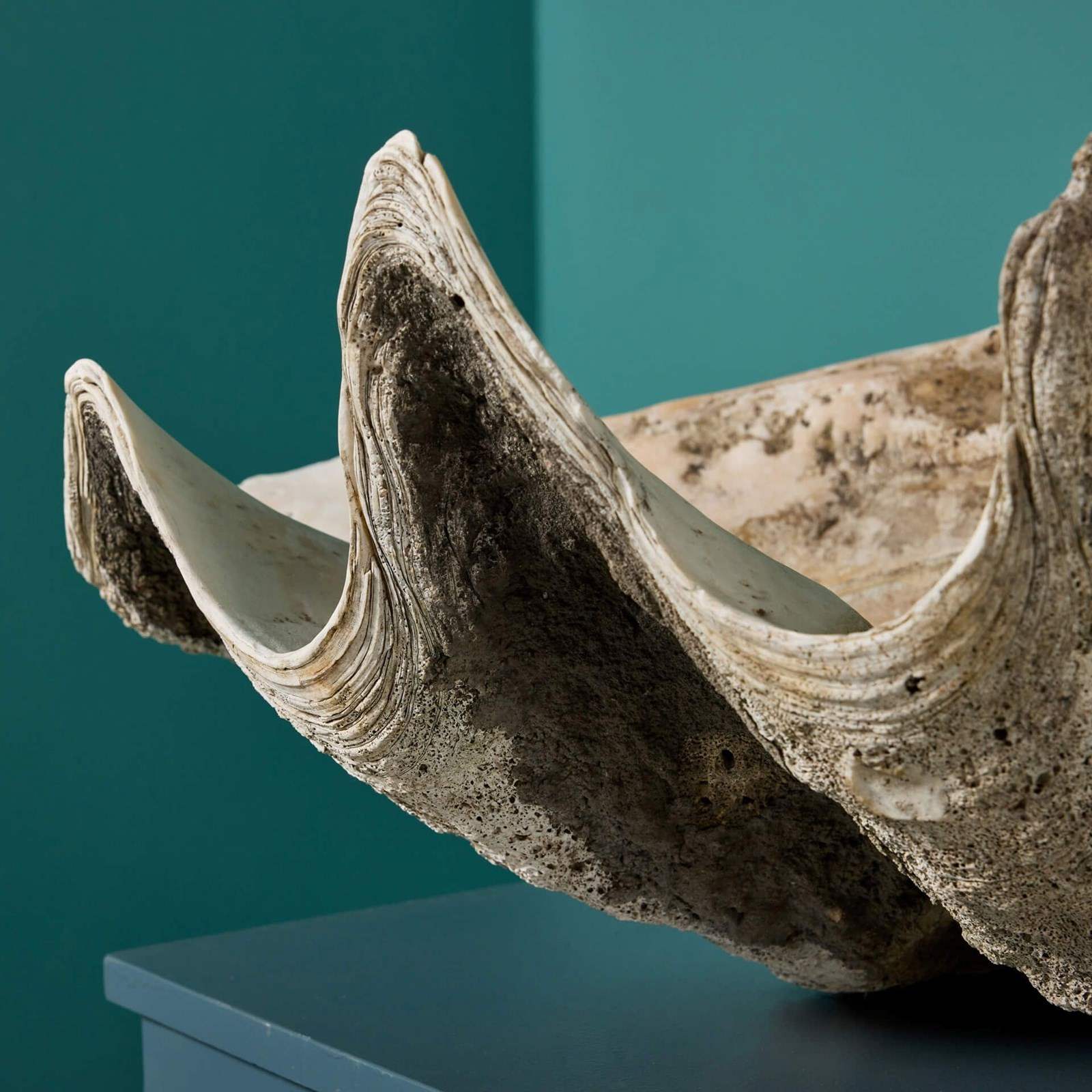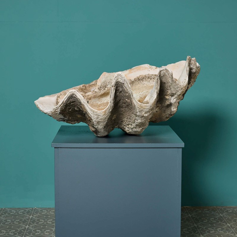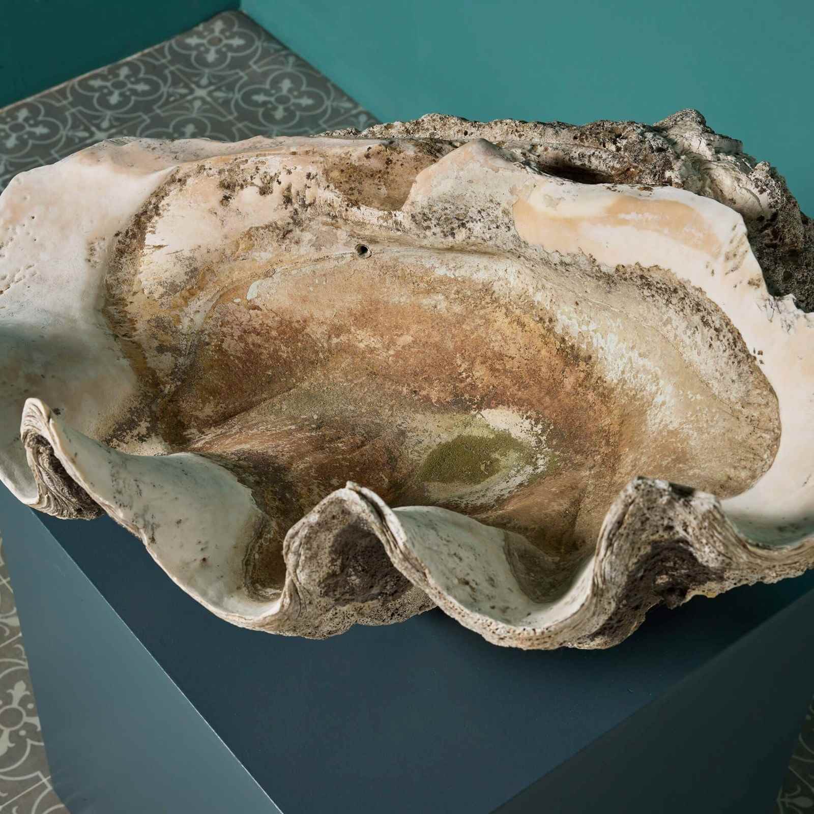 An antique giant clam shell, reclaimed from a garden and previously used as a fountain. Also known by its Latin name Tridacna gigas, this clam is of a large scale. It could be used externally, perhaps as a water feature, or internally as a basin in a home. Alternatively, it would look stunning on display due to its impressive appearance.