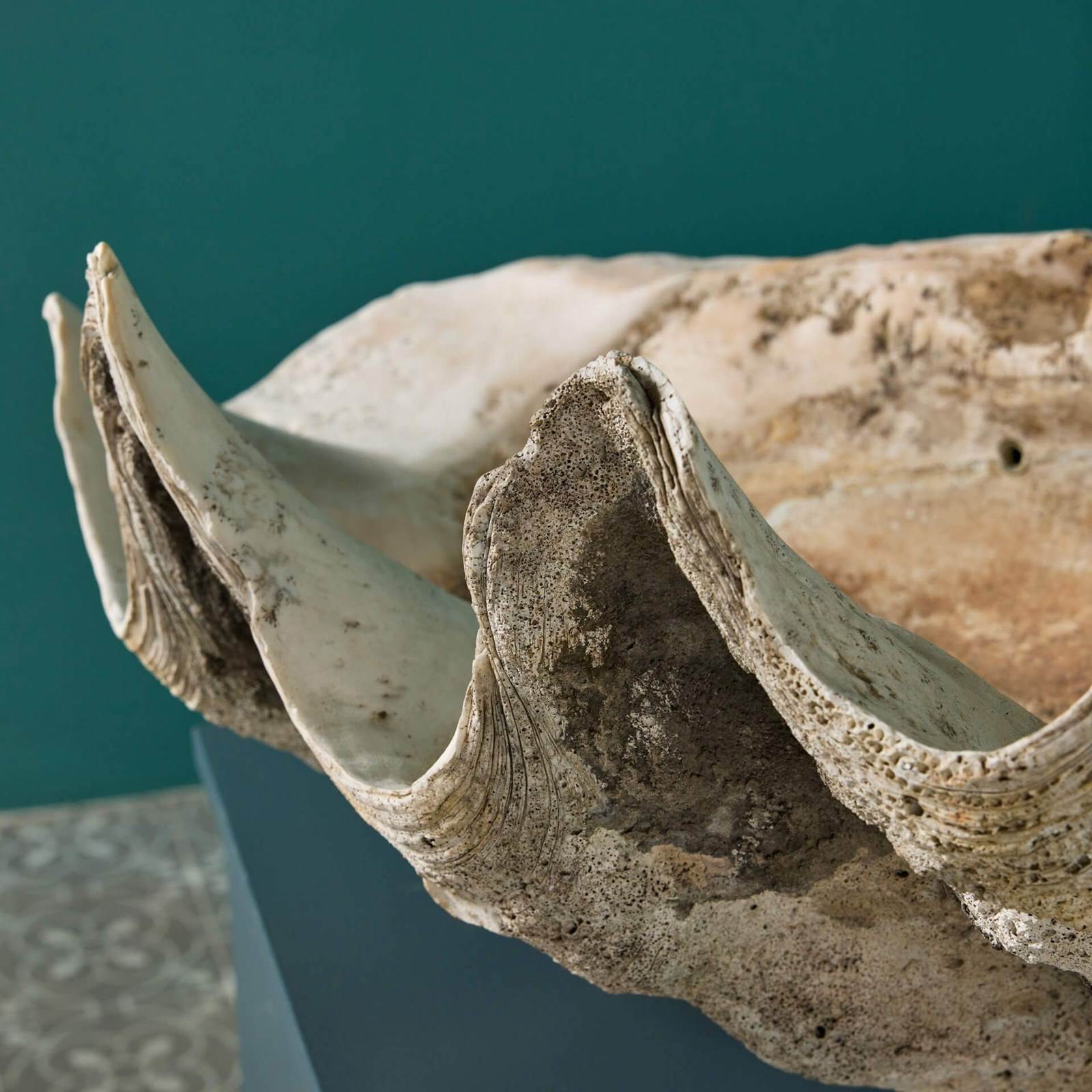 Tridacna gigas is a very decorative giant clam shell with a well-defined shape and good colour. Giant clams inhabit the oceans of the Pacific and Indian Oceans and have a lifespan of over 100 years. The layers, built up over the course of many years make the shells very heavy and difficult to date precisely.