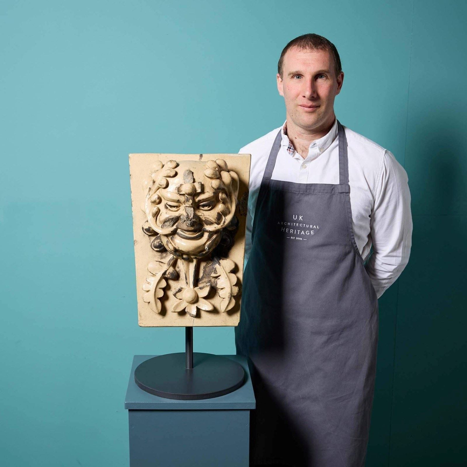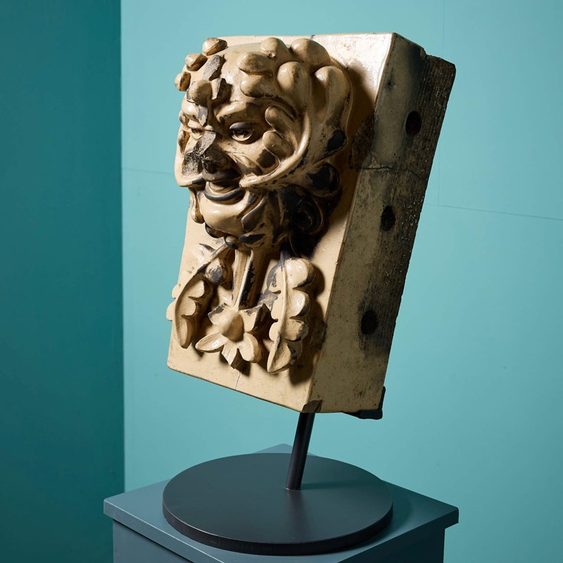 With some weathering, this antique architectural keystone is steeped in history, telling a story of mythology and English heritage.