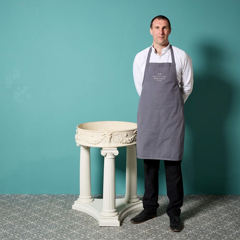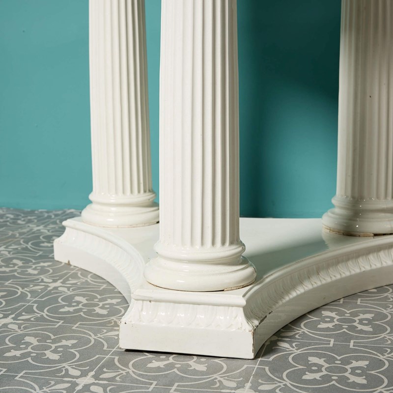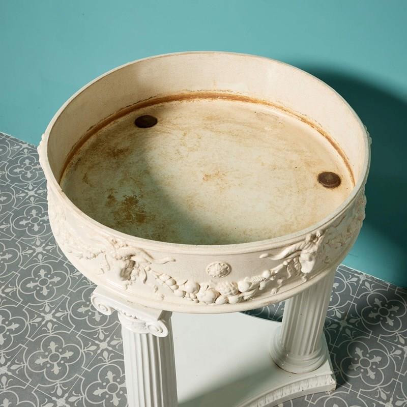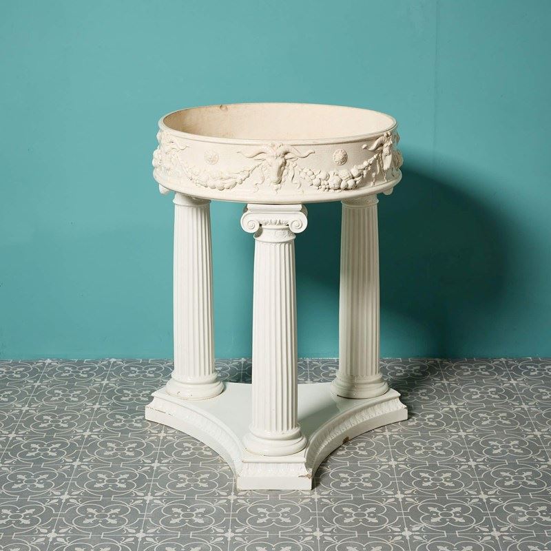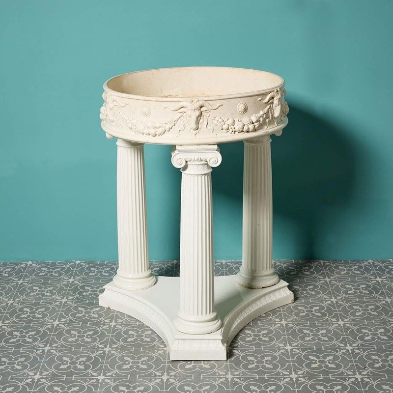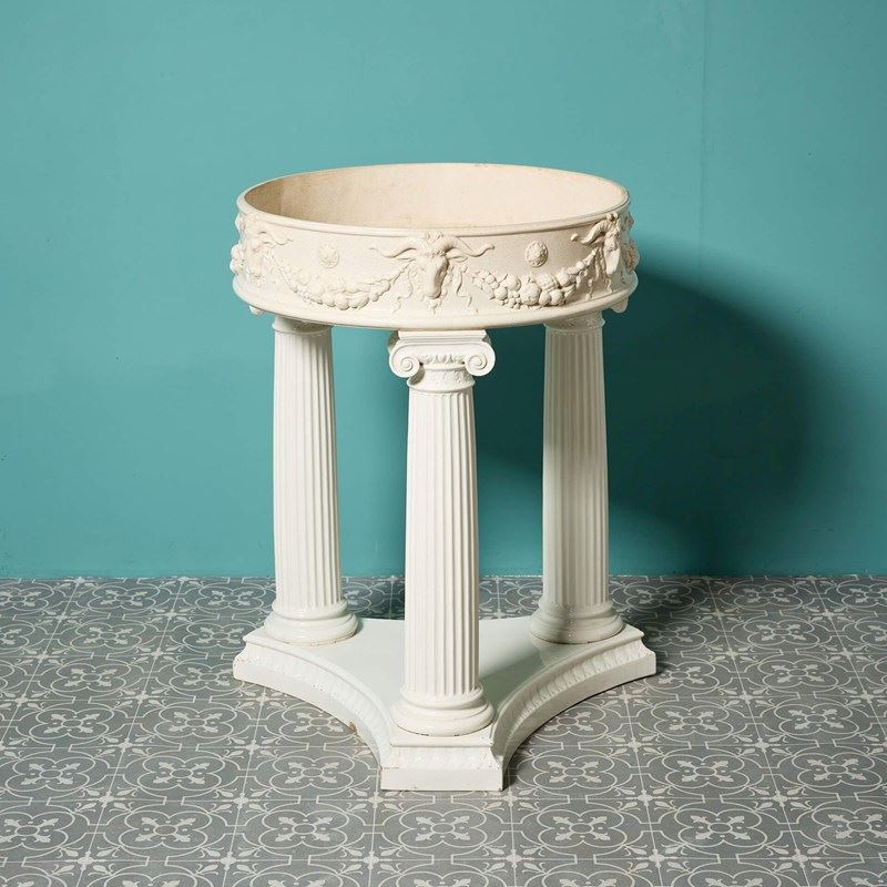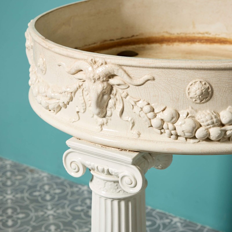 Displaying a large circular glazed bowl to the top decorated with a ram's heads and swags, raised on three tapering classical Doric columns creating triform base.