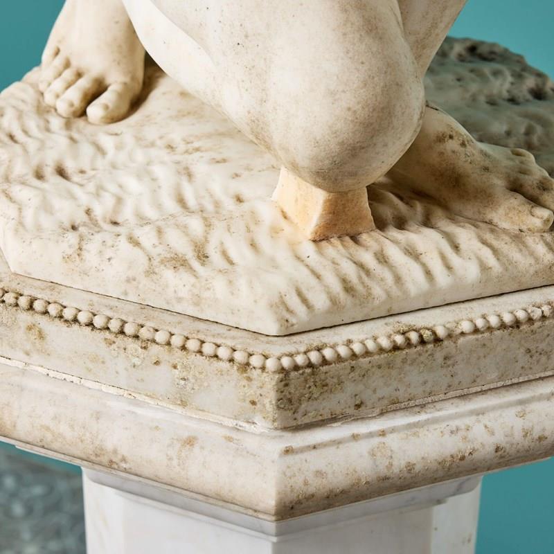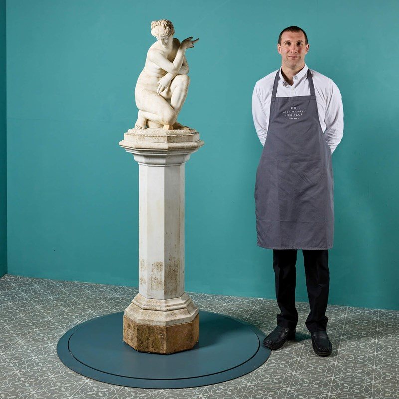 A 19th century antique marble sculpture of Aphrodite also referred to as the ‘Crouching Venus’ on an octagonal pedestal. It is based on the antique Roman statue that forms part of the Royal Collection. This beautiful example once formed part of a private collection in Oxfordshire where it was a focal point within a traditional English country garden.