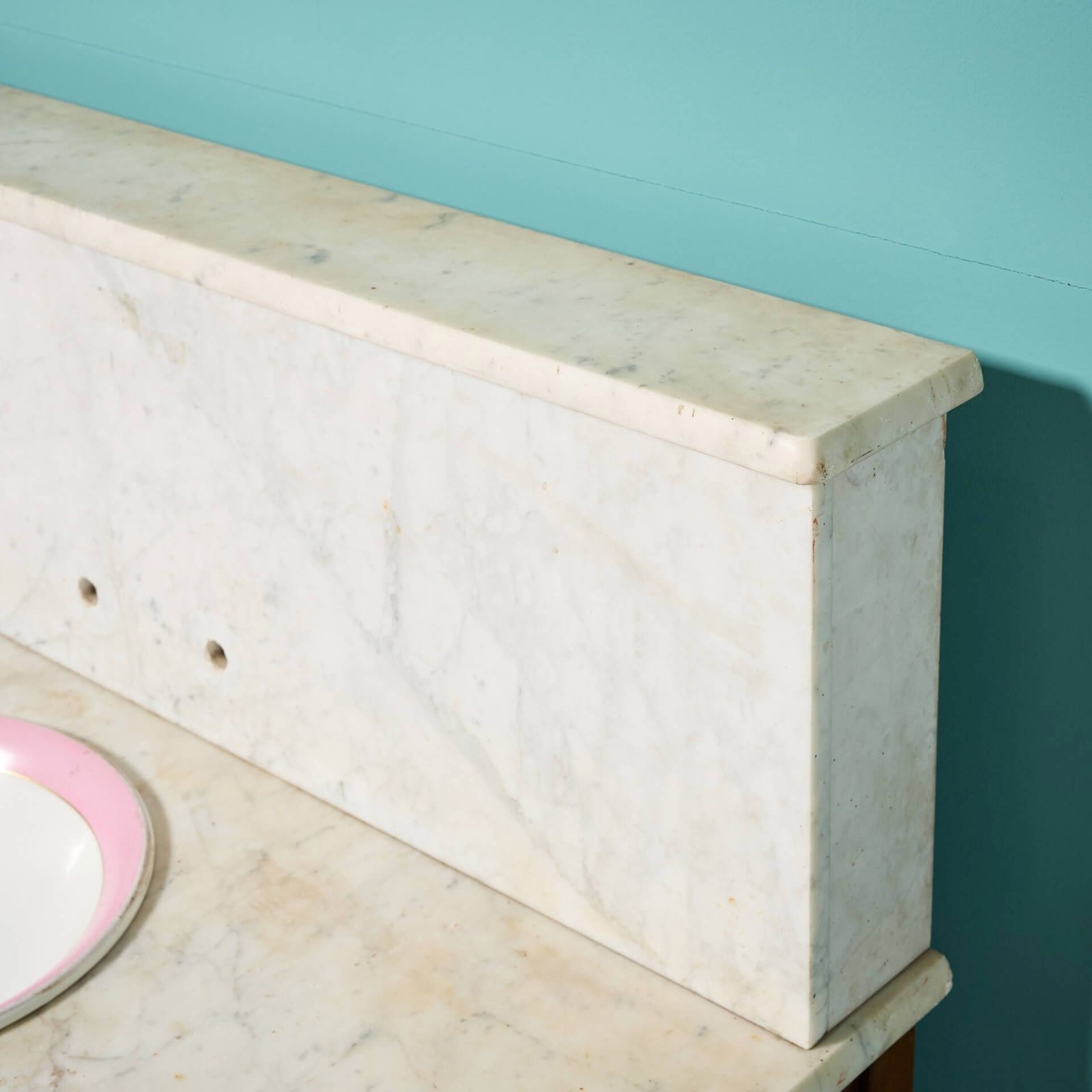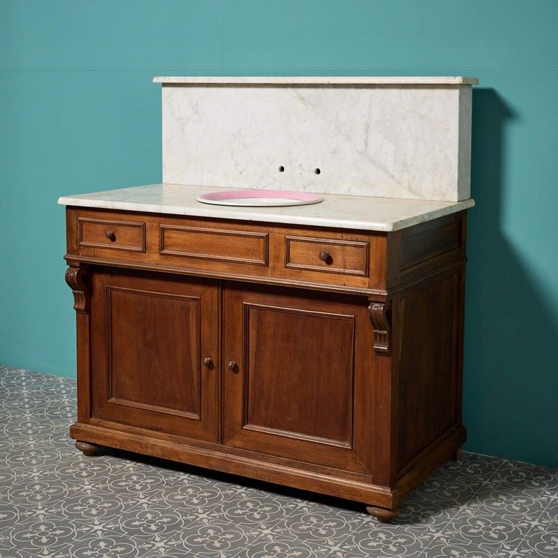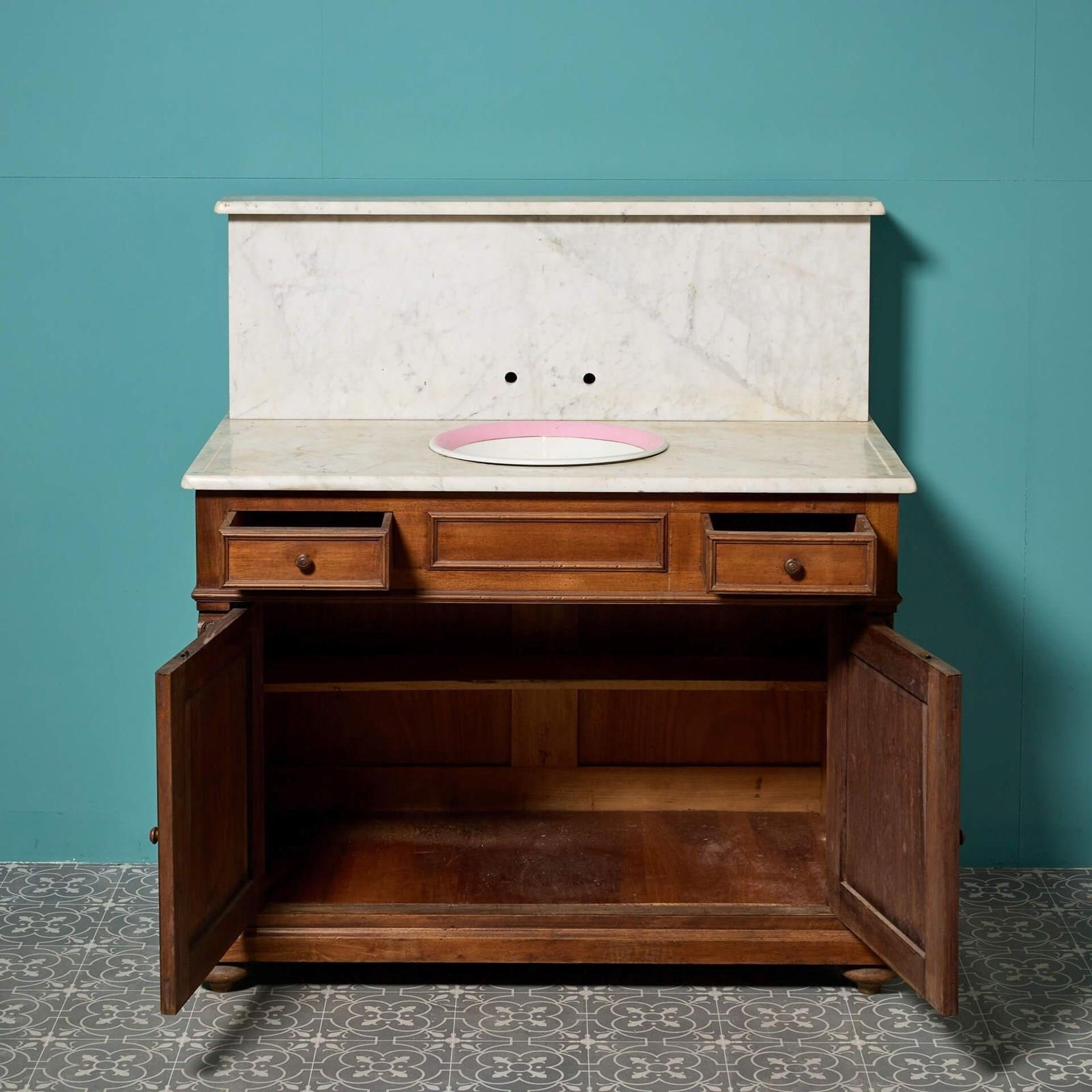 An antique French Louis style mahogany wash stand with a striking Carrara marble top and splash back.