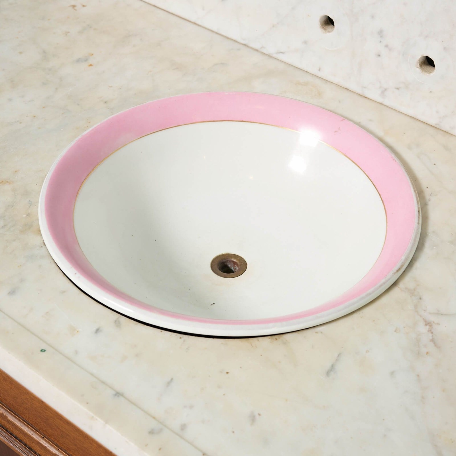 The elegant porcelain white and pink glazed sunken sink compliments the stunning white Carrara marble surface and sweeping surround.