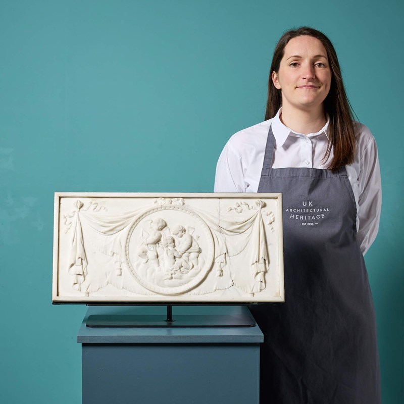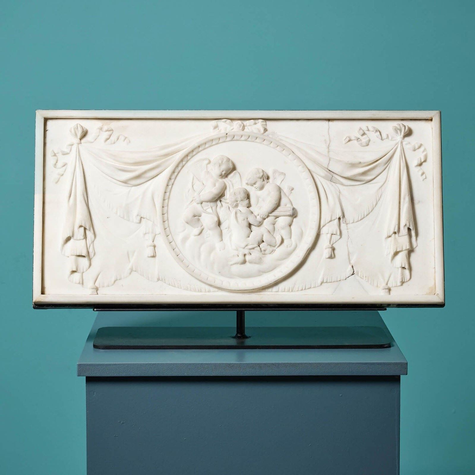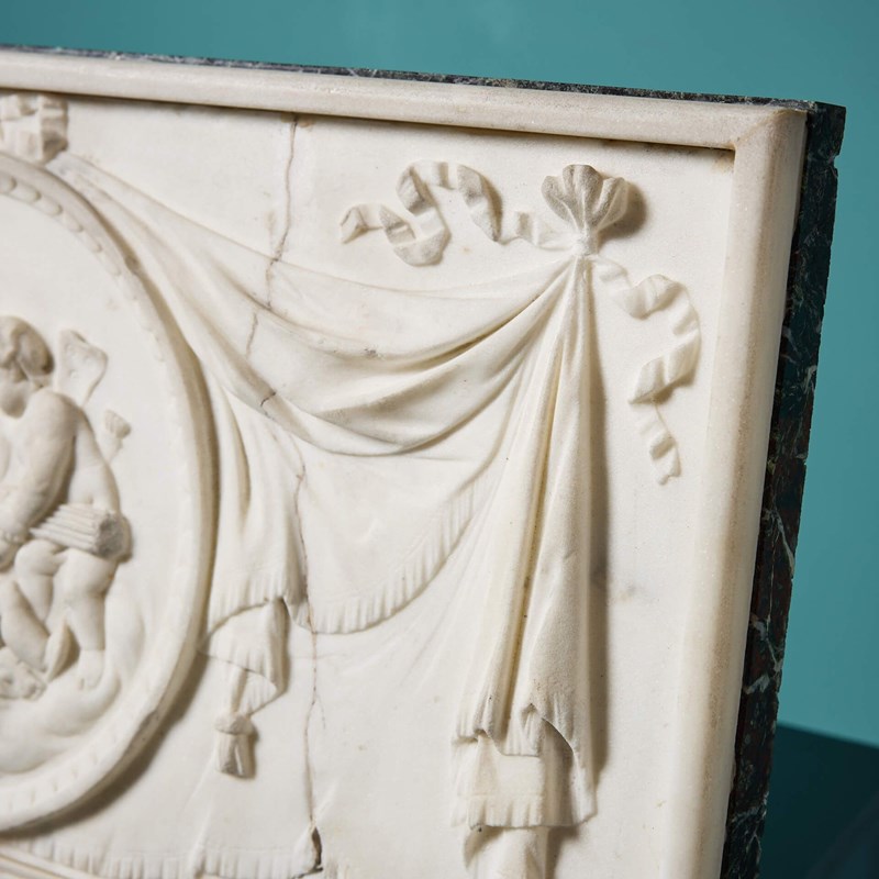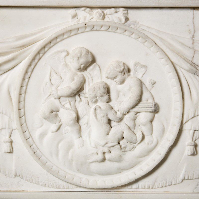 Now mounted on a bespoke steel stand for decorative display, it’s details can be observed and appreciated up close, the white statuary marble handcarved with a roundel to the centre with three winged putti and neoclassical foliage swags, before a tinos green marble border.