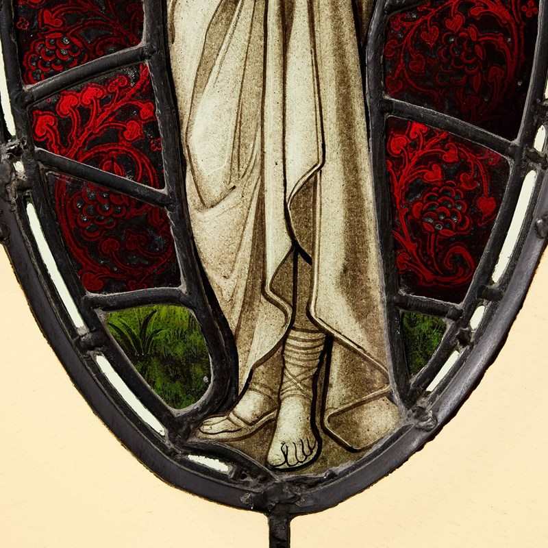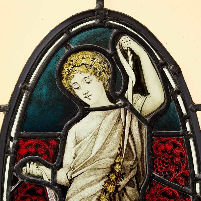 An elegant large neoclassical style stained glass window circa 1890. A Victorian take on a neoclassical design, this stained glass window centres around an elongated oval panel depicting a female dressed in white drapery, with flowers in her hair, holding a floral swag. She stands before a vibrant green, red and blue backdrop, drawing attention to her intricate details and artistic classical pose.