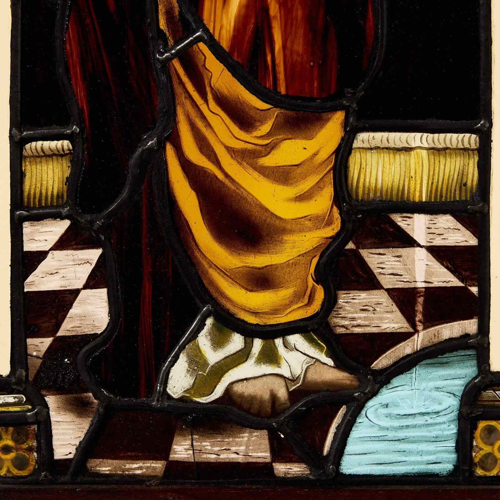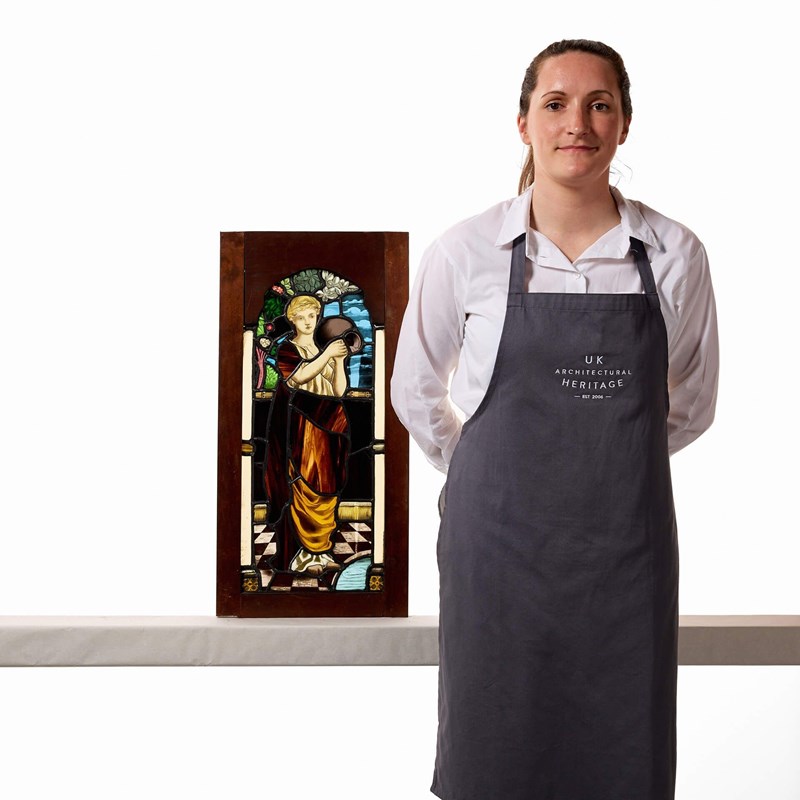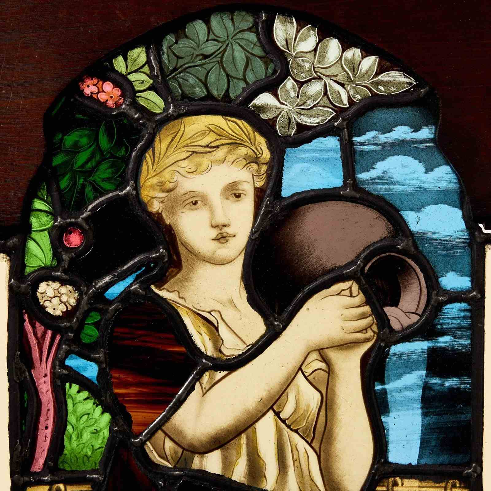 Skilfully designed, this antique stained glass window details a classical female, swathed in drapery and wearing a wreath headdress, standing in a courtyard before a pool. She pours water from a large pitcher at her shoulder into the pool, the glass painted in such a way that the water appears to be flow from the jug into the pool, creating a sense of movement.
