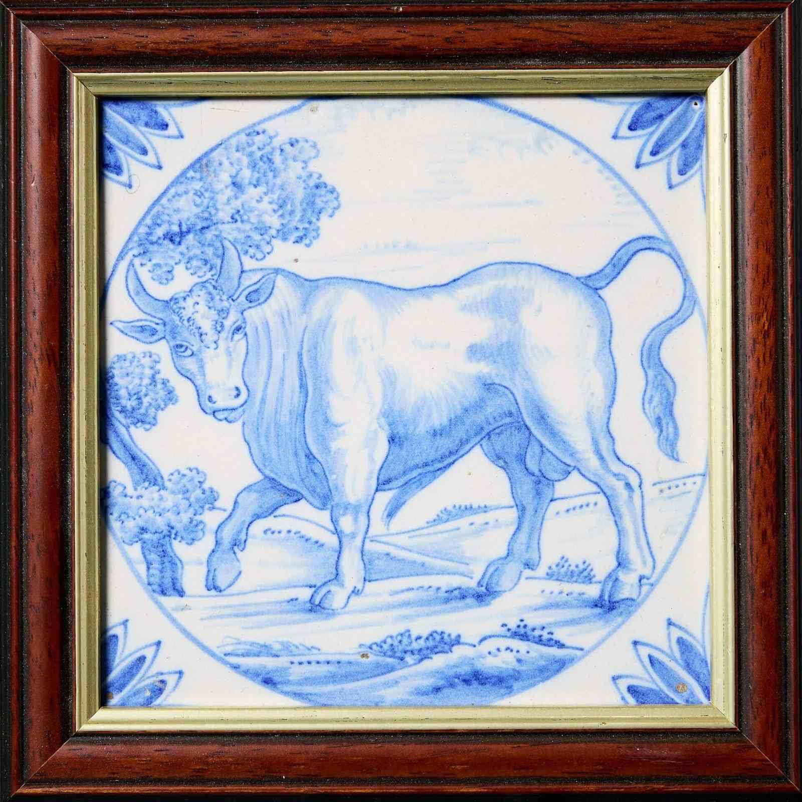 The large bull is intricately illustrated within a roundel with sunflower spandrels to the corners. 19th century delftware tiles in this manner are widely attributed to the Ravesteijn tile factory in Utrecht, Netherlands.