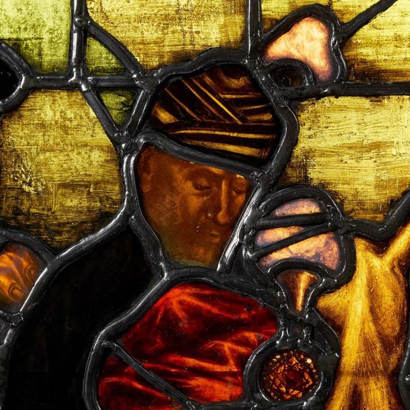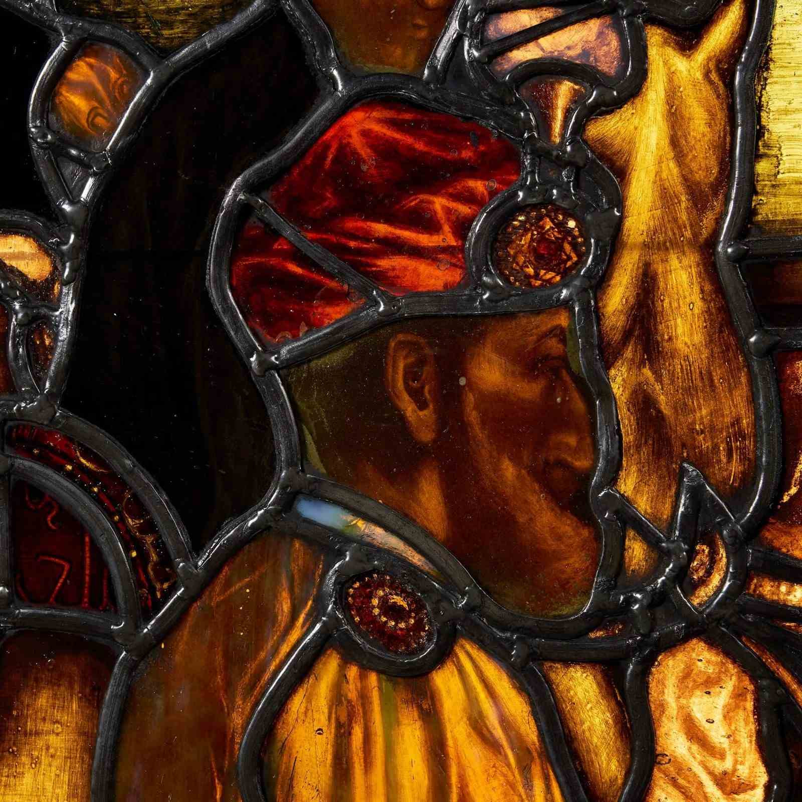 An antique Tudor style stained glass panel attributed to Williams, Gamon & Co dating to circa 1900. Burtonwood Brewery, Warrington.